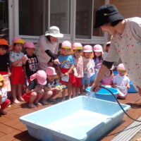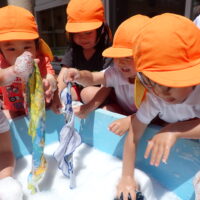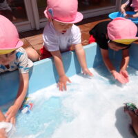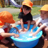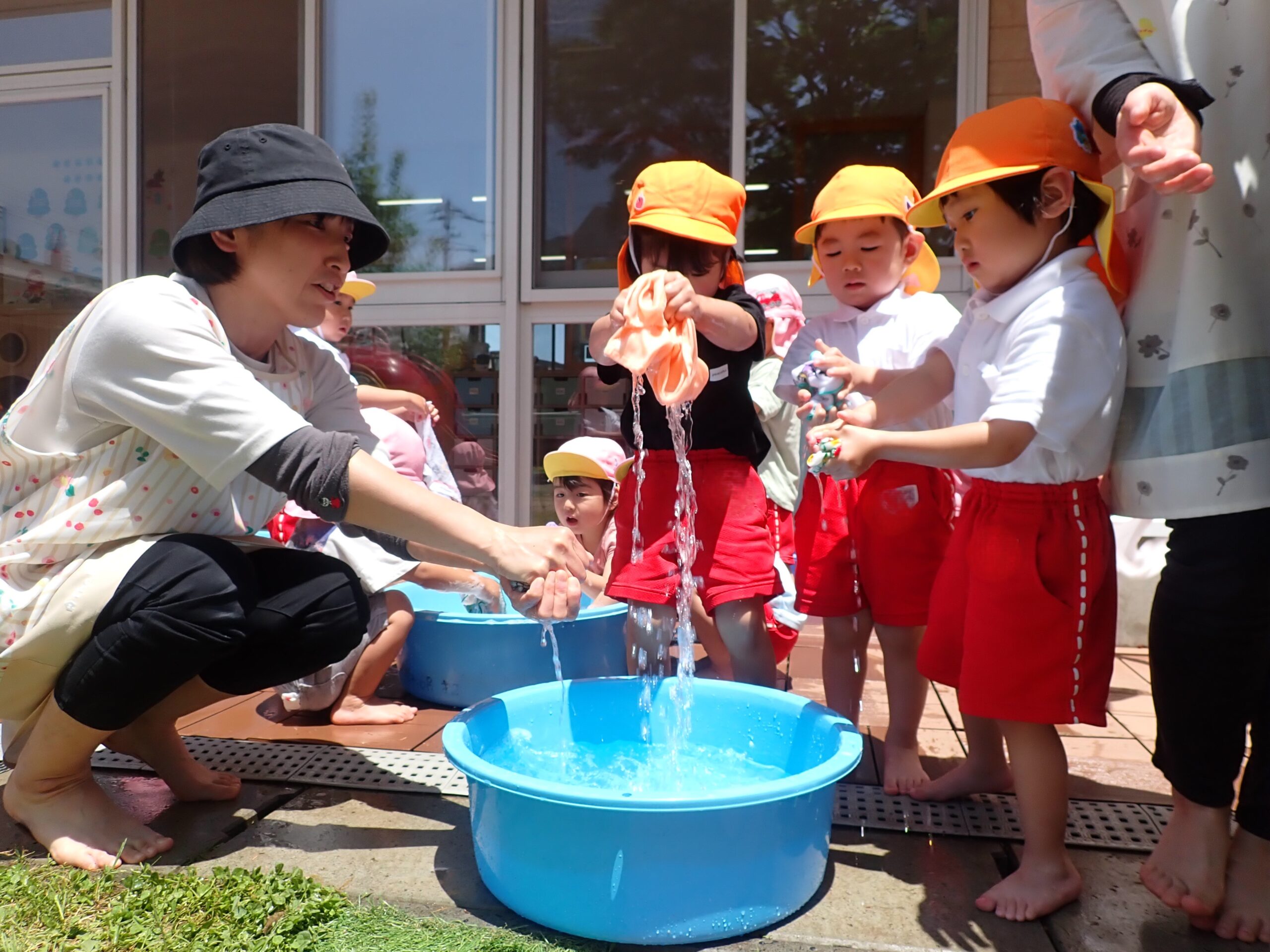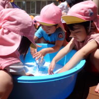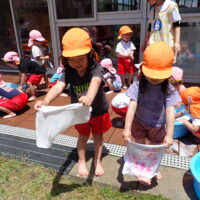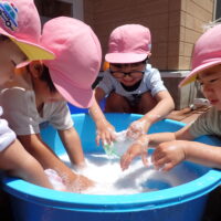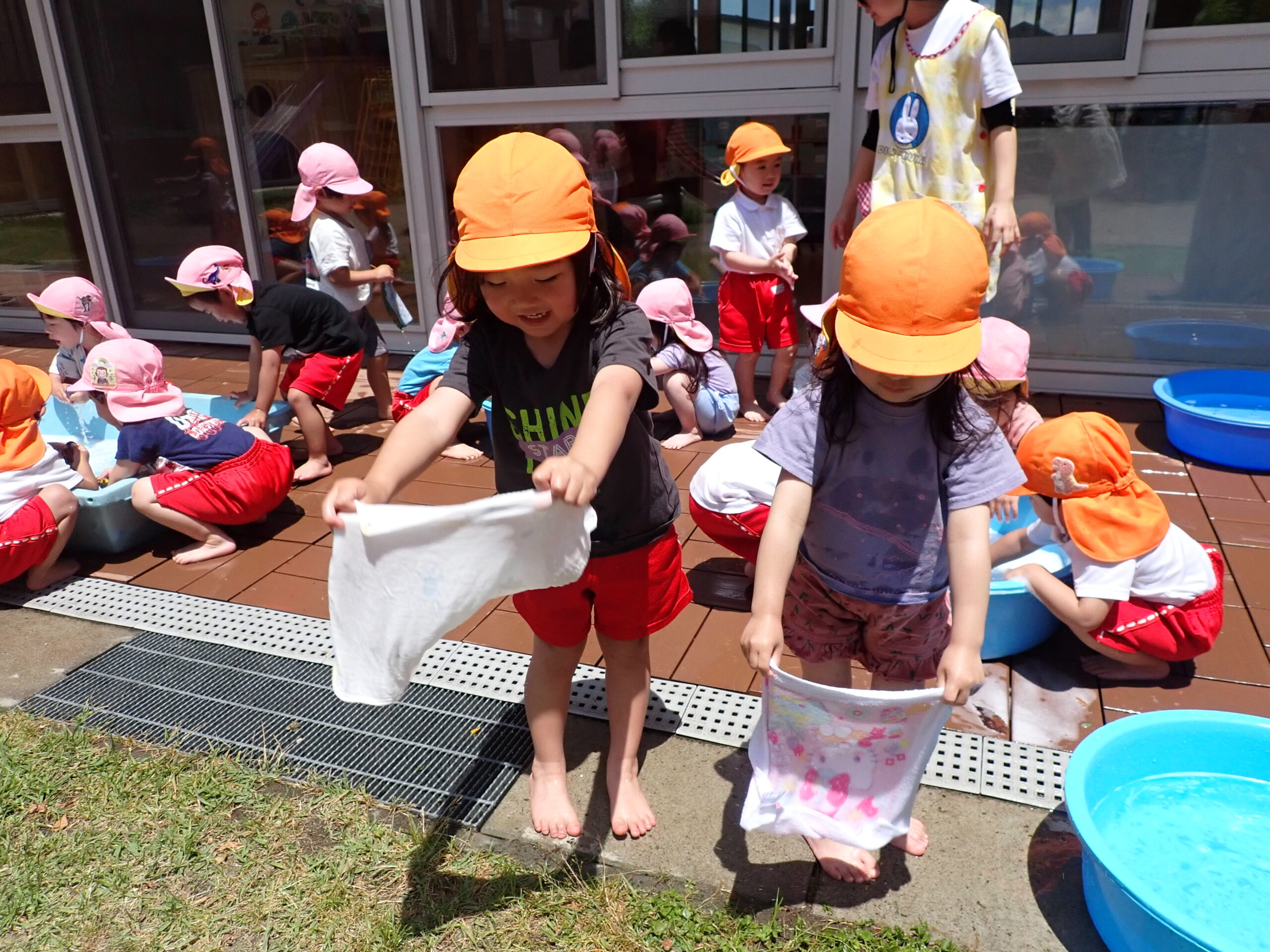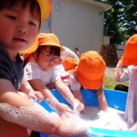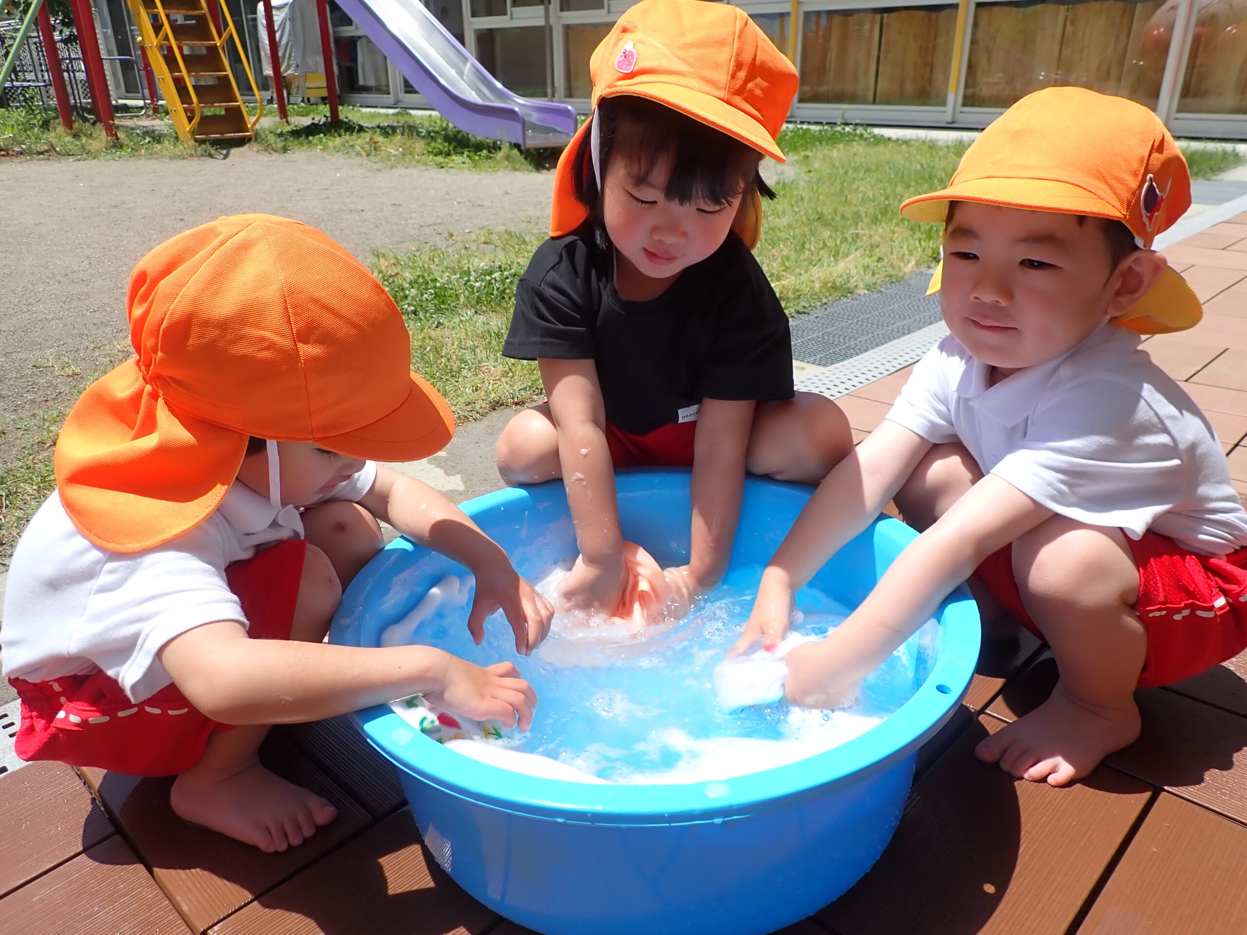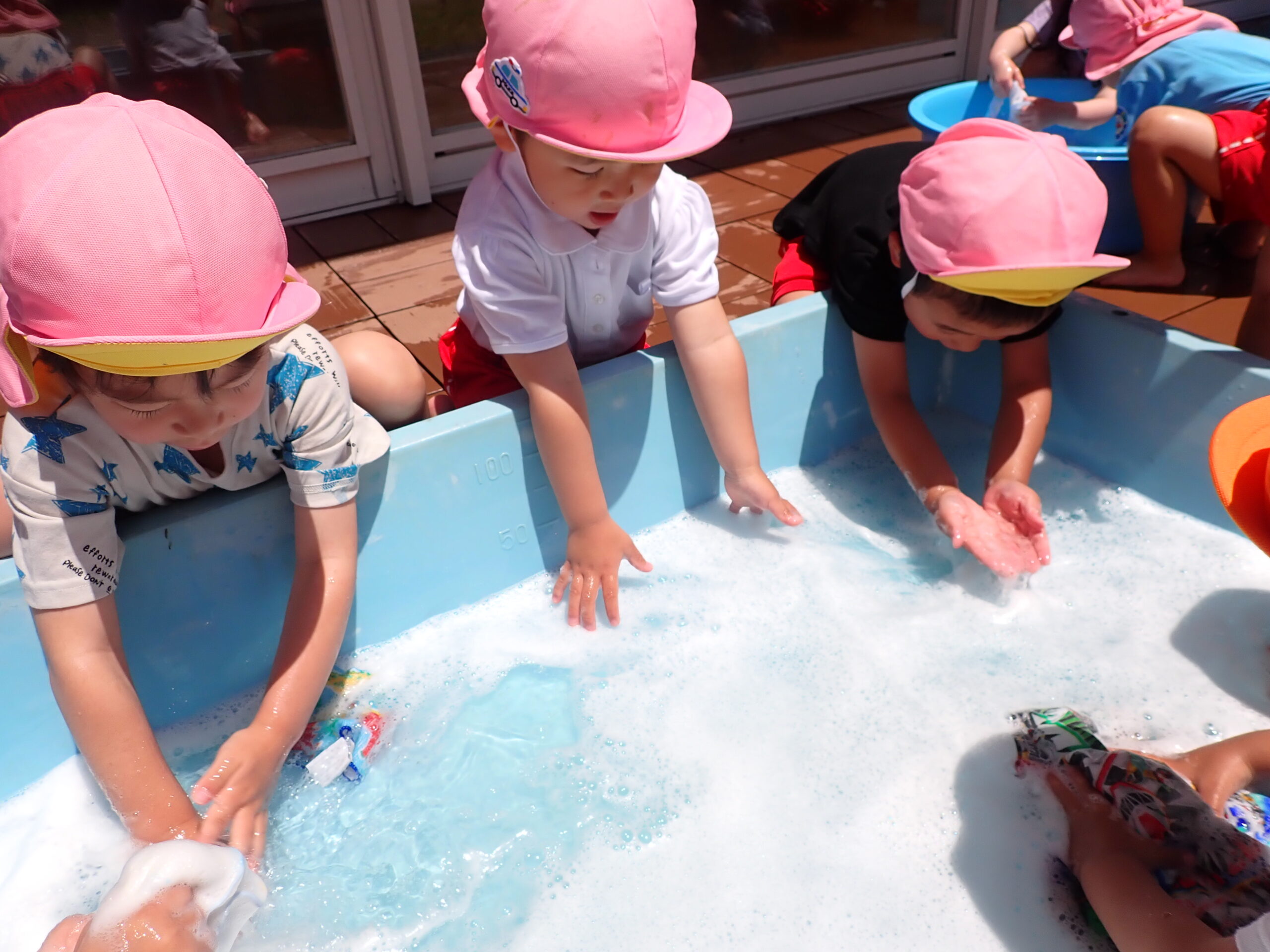 泡の中にハンカチを入れごしごし洗ったり、泡をたくさん集めたり・・・泡の感触を楽しみながらハンカチを洗い、きれいな水ですすいだ後は