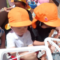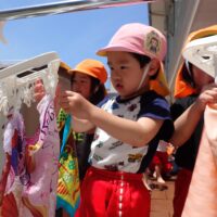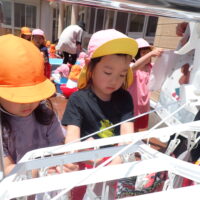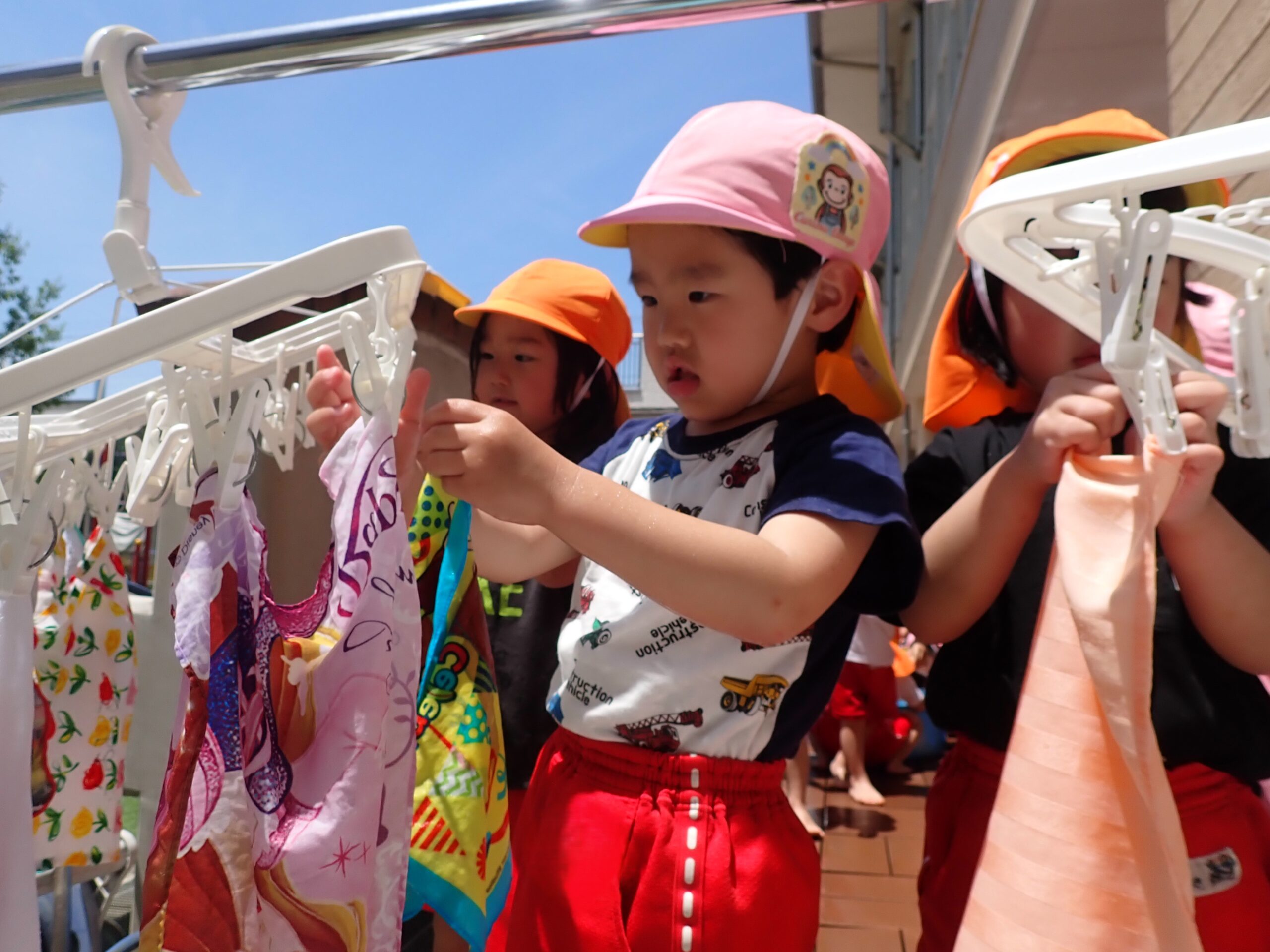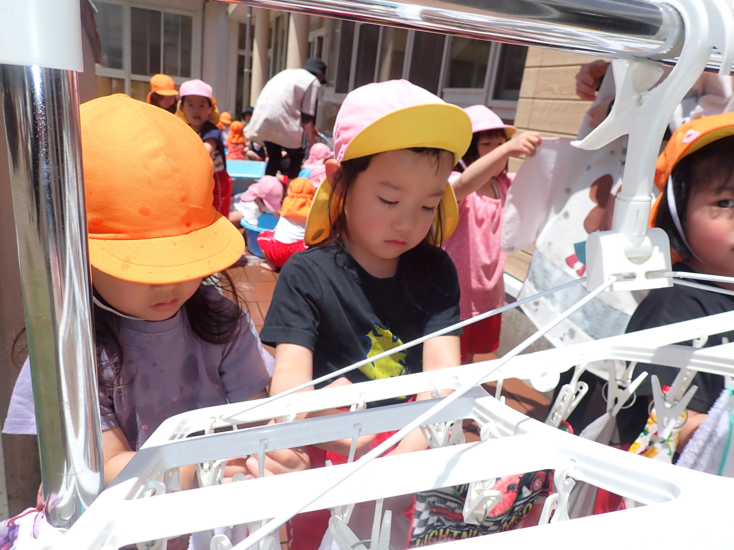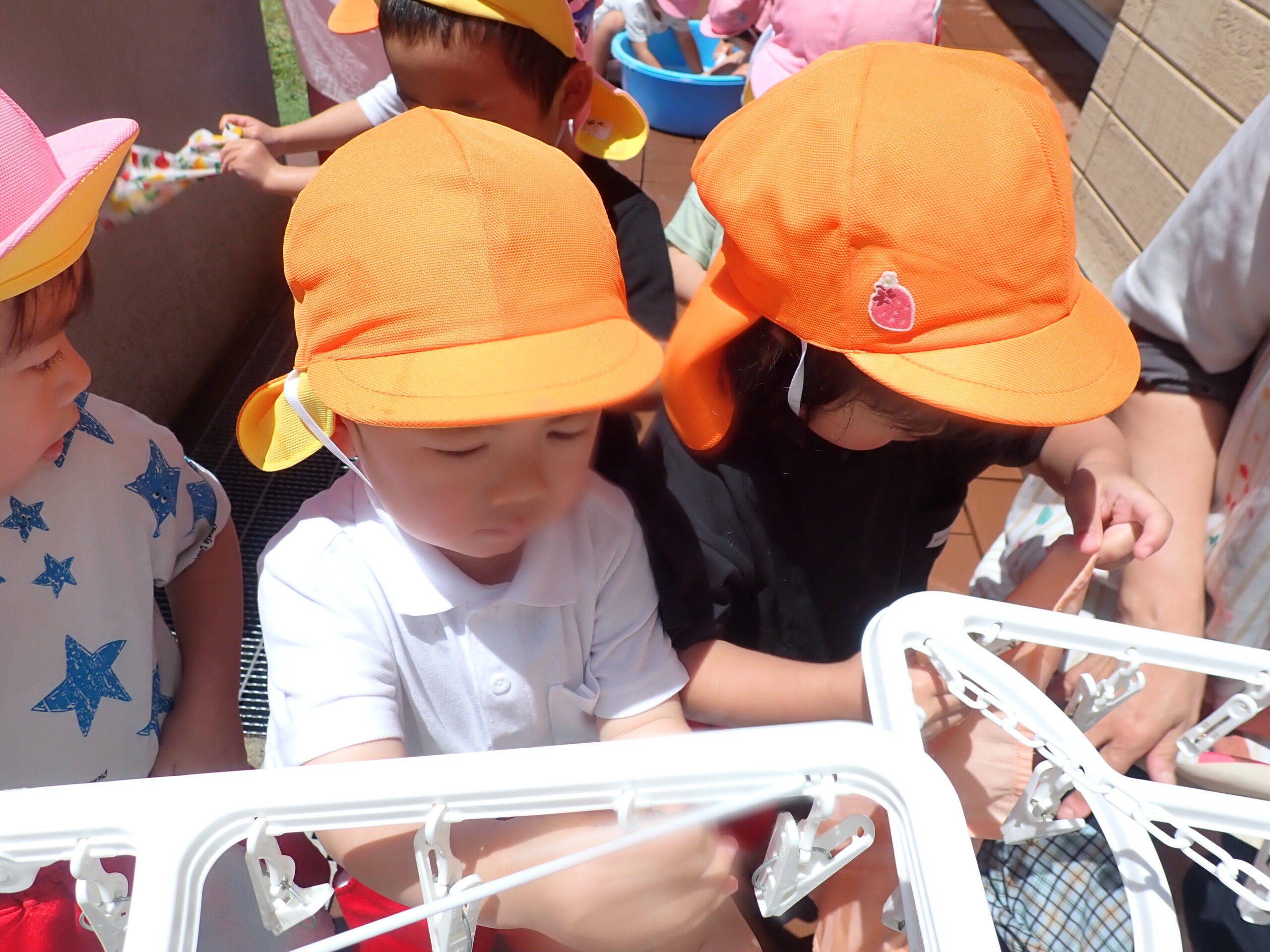 干す時には「パンパンってするよ!」「きれいに伸ばす!」とハンカチを広げ、上手に干していた子ども達です。