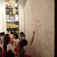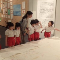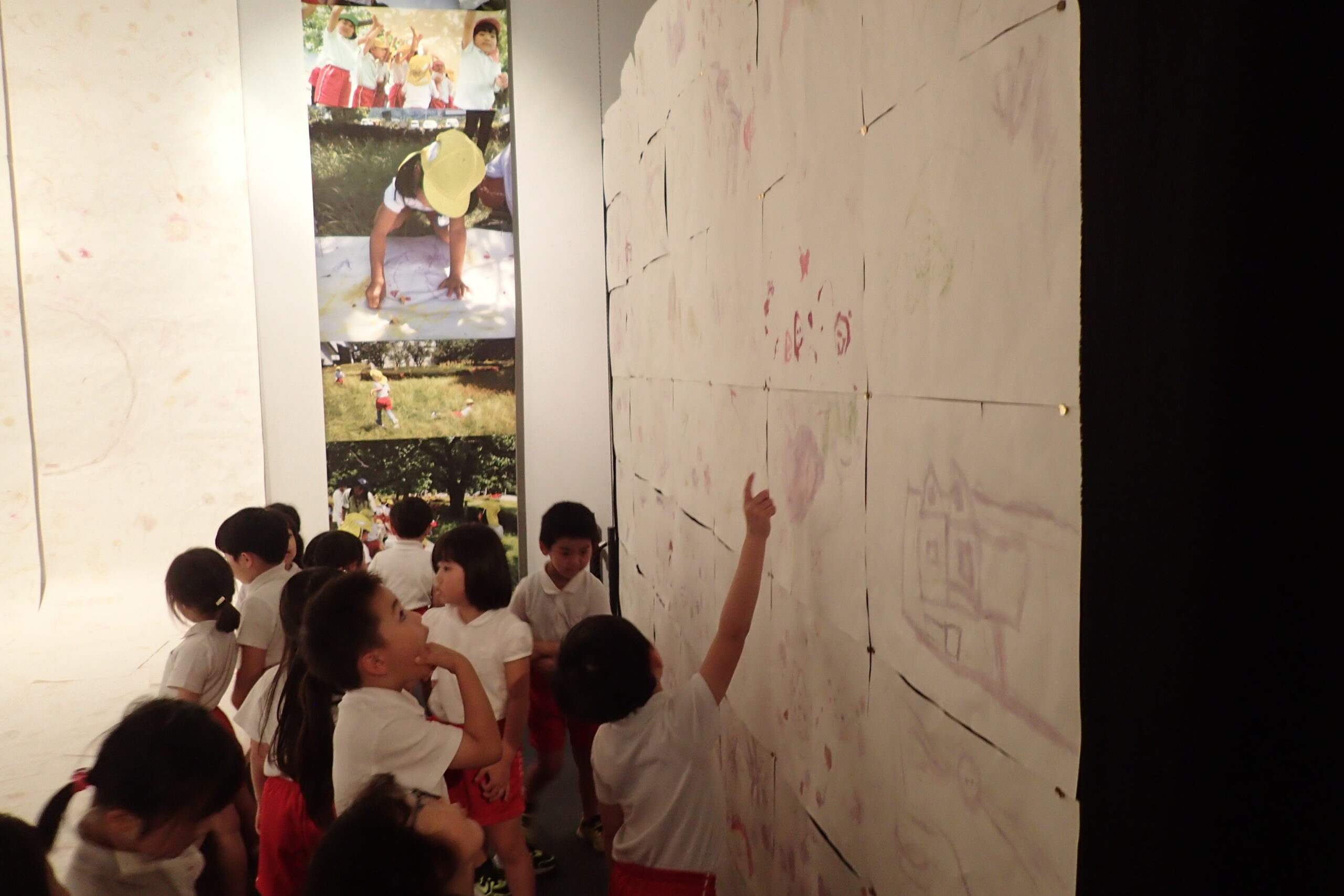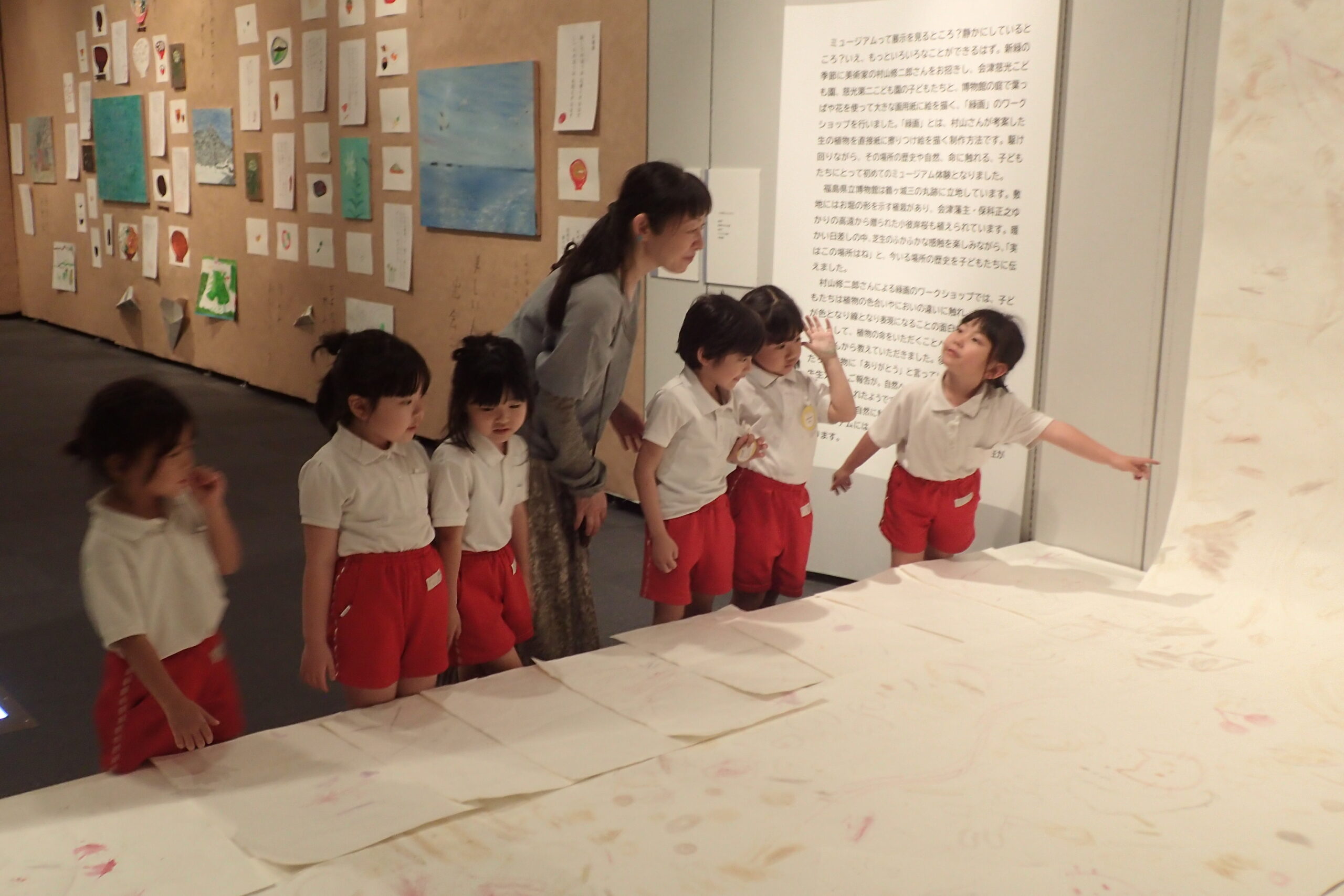 先日、行った「みどりのワークショップ」で描いた子ども達の緑画の絵が展示されているからです!(「ボーダーなき世界を」という企画展の中に展示されています)
