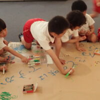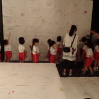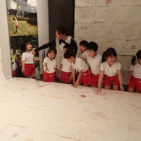 その後に「みんなが描いた絵はどこかな~?」と探すと、「あった!!」とみんなの絵を発見!!一人ひとり描いた絵が素敵に展示され、自分の絵を見つけると嬉しそうにしていました😉昨年度の年長さんが描いた大きな画用紙の作品も展示してあり、「大きい紙で描いたのすごいね!」とびっくりしている子ども達。「どんな絵が描いてあるかな?」とお友達の絵や昨年の年長さんの絵を鑑賞してきました。