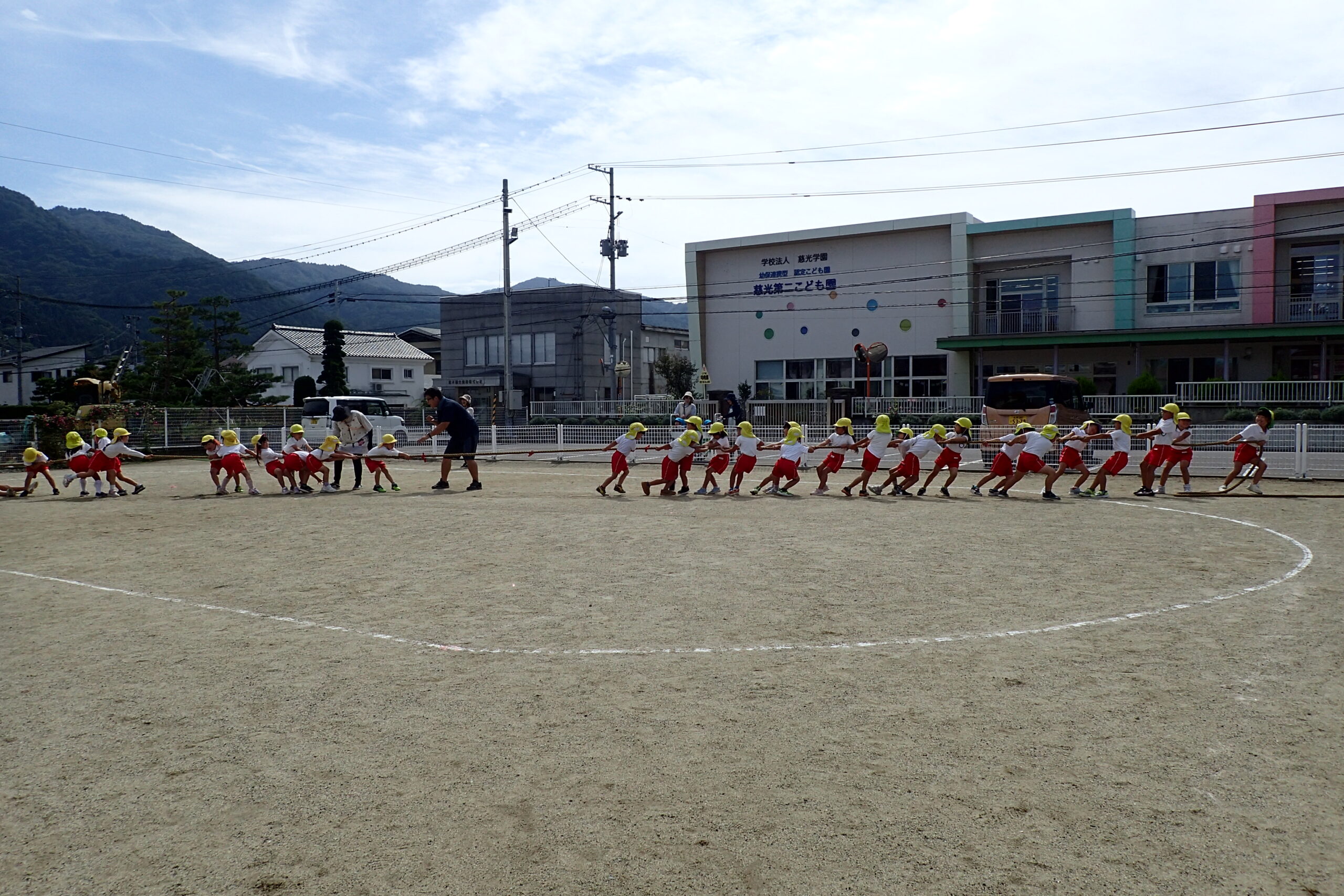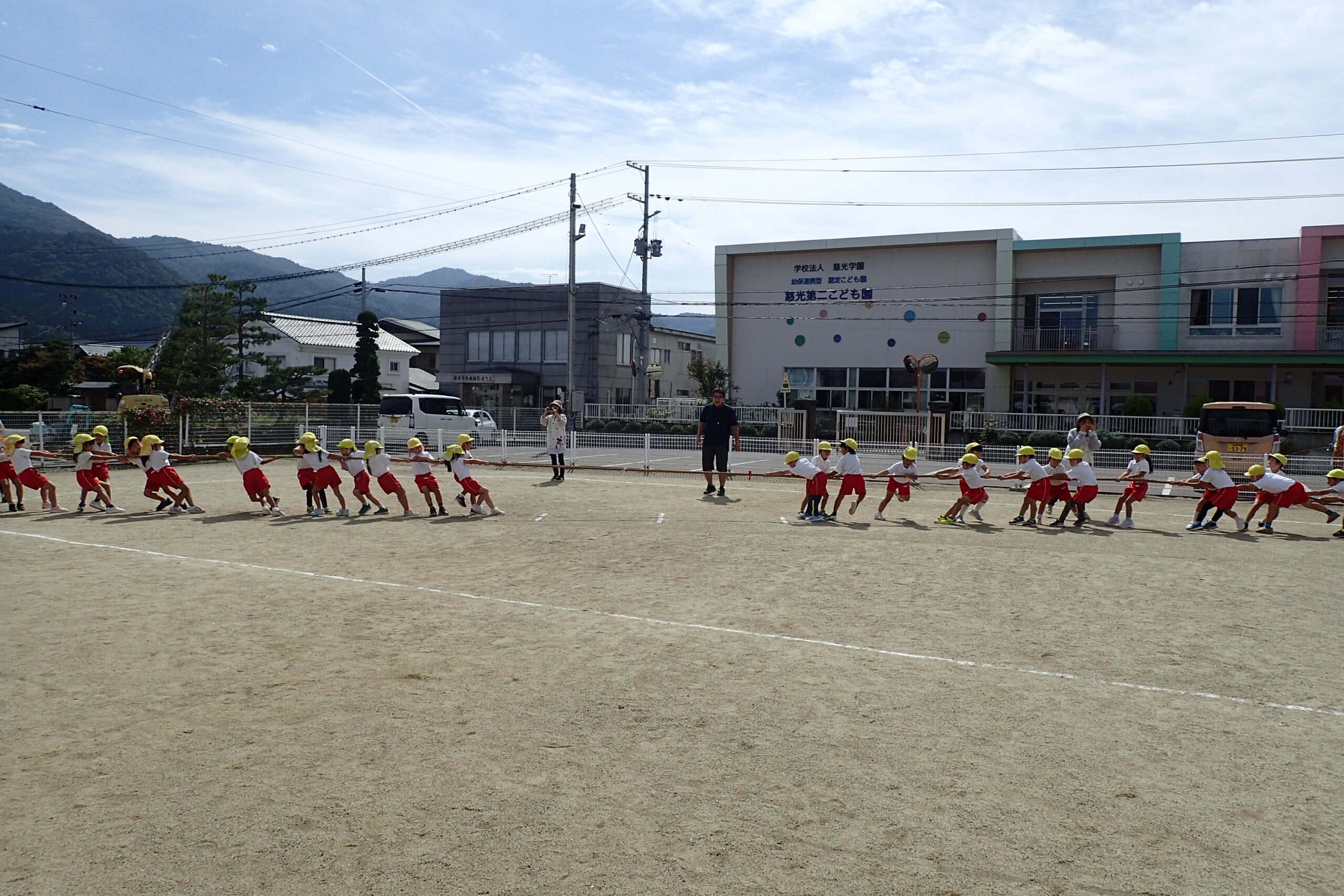 きりん組さんも一生懸命応援します!ぞう組さんも力いっぱい、引っ張ります。