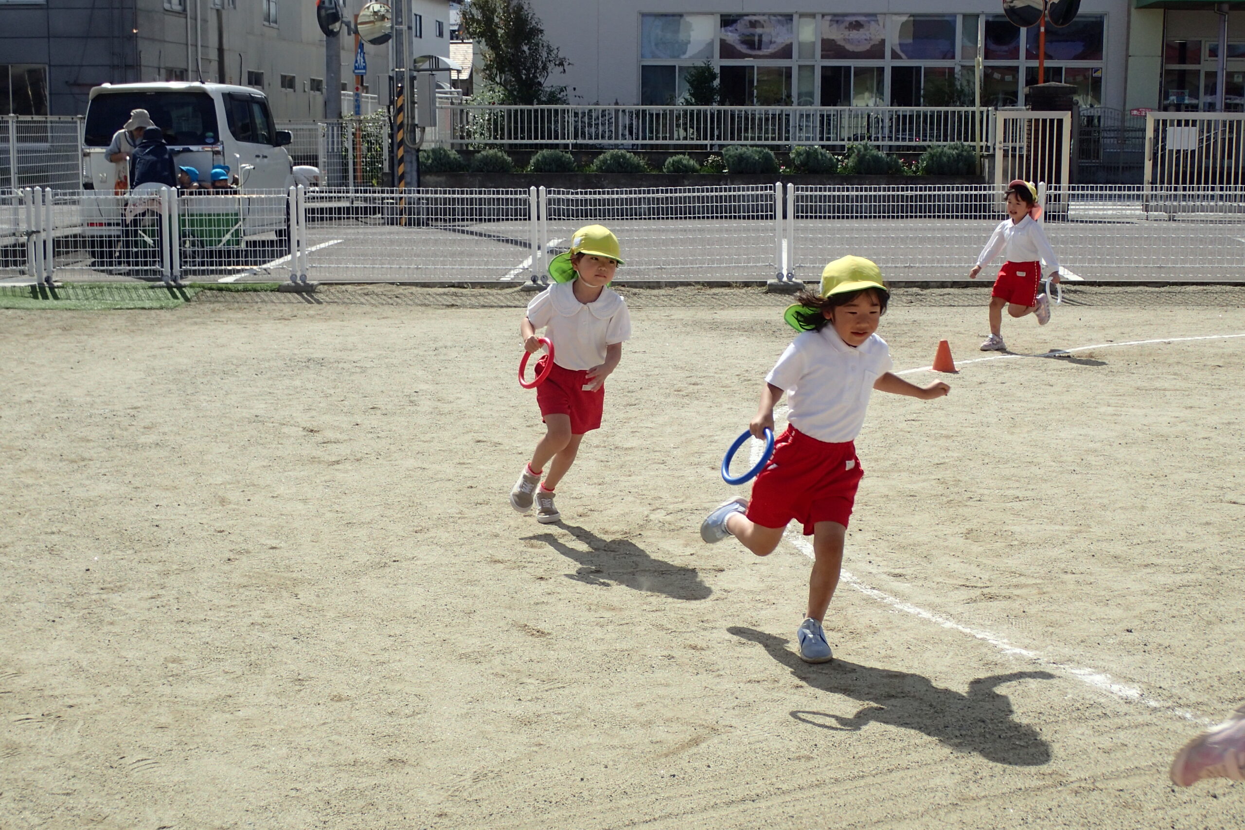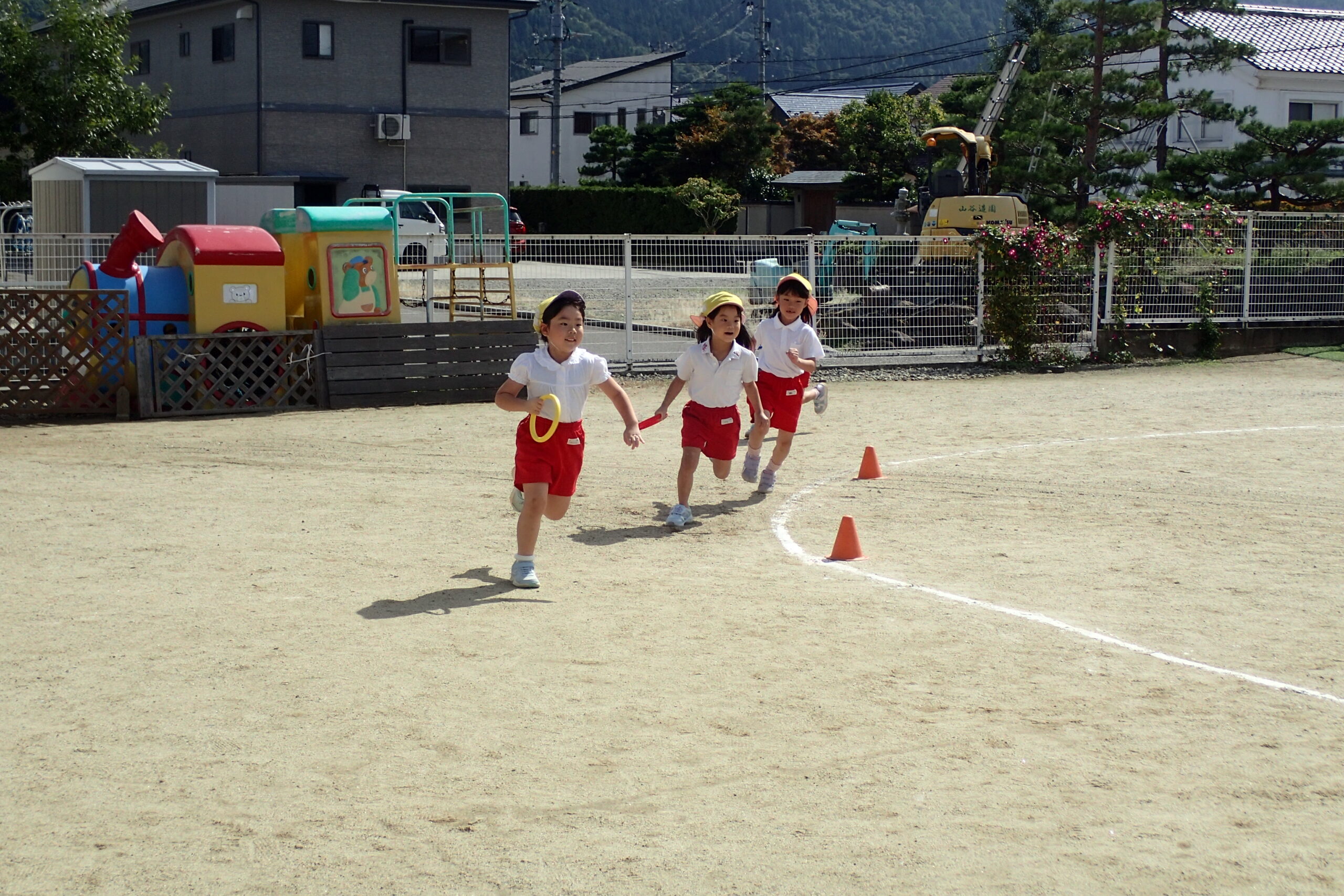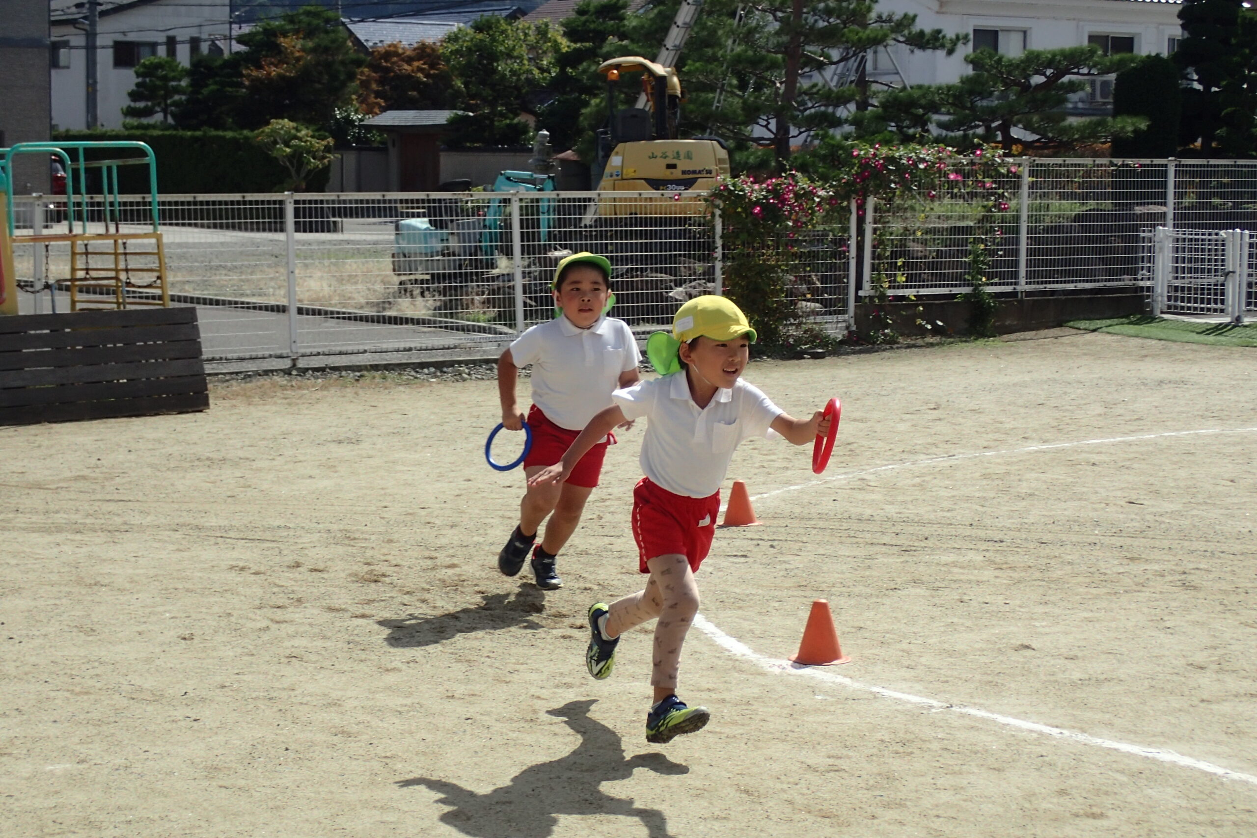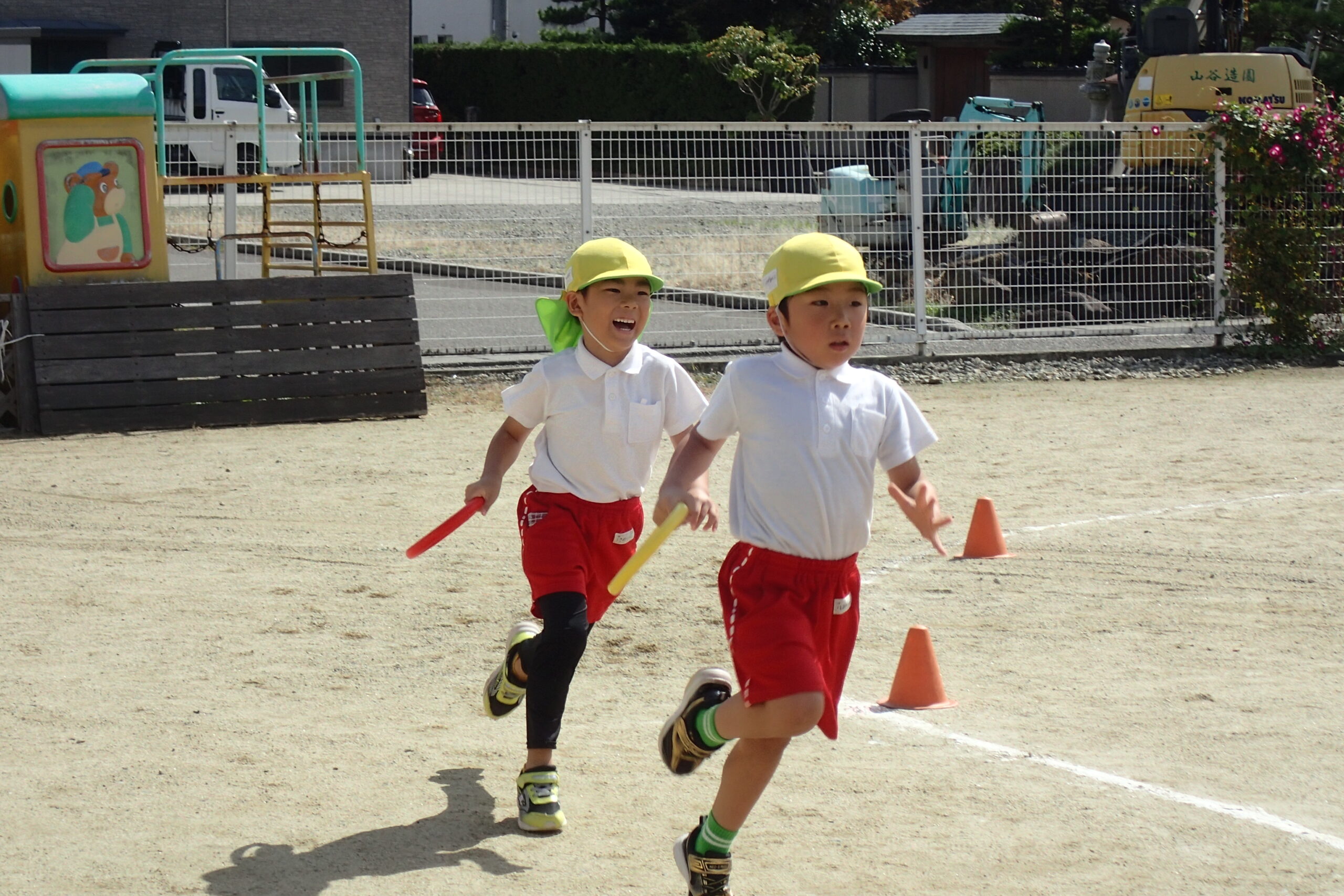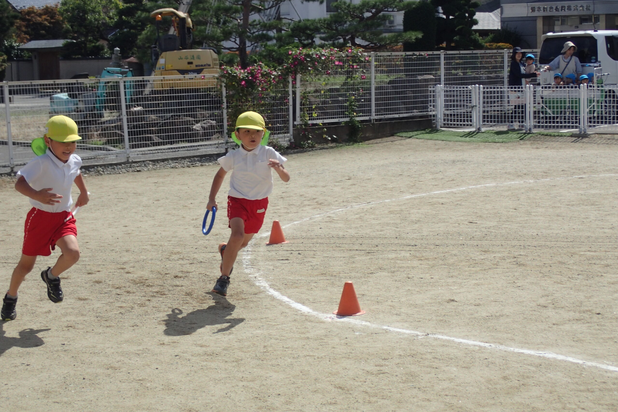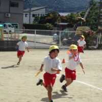 次のお友達まで必死にバトンを繋ぎ、追い抜いたり追い越されたり・・・クラスのお友達を一生懸命応援した子ども達🏳