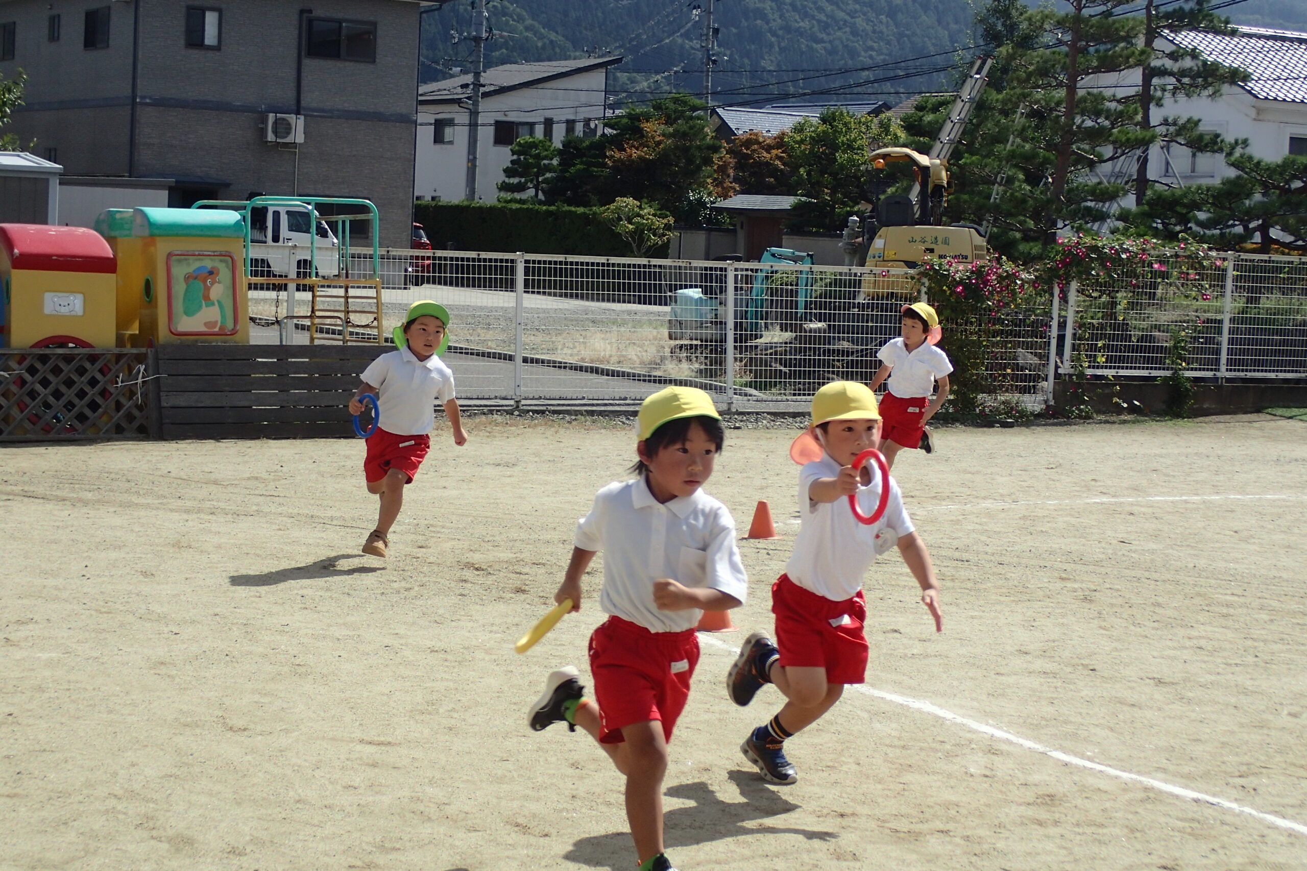 なかよしリレーは、ゆり組さん・ひまわり組さん・ぞう組さん・きりん組さんの4チーム対抗です。