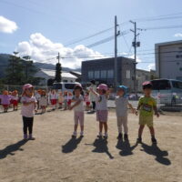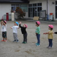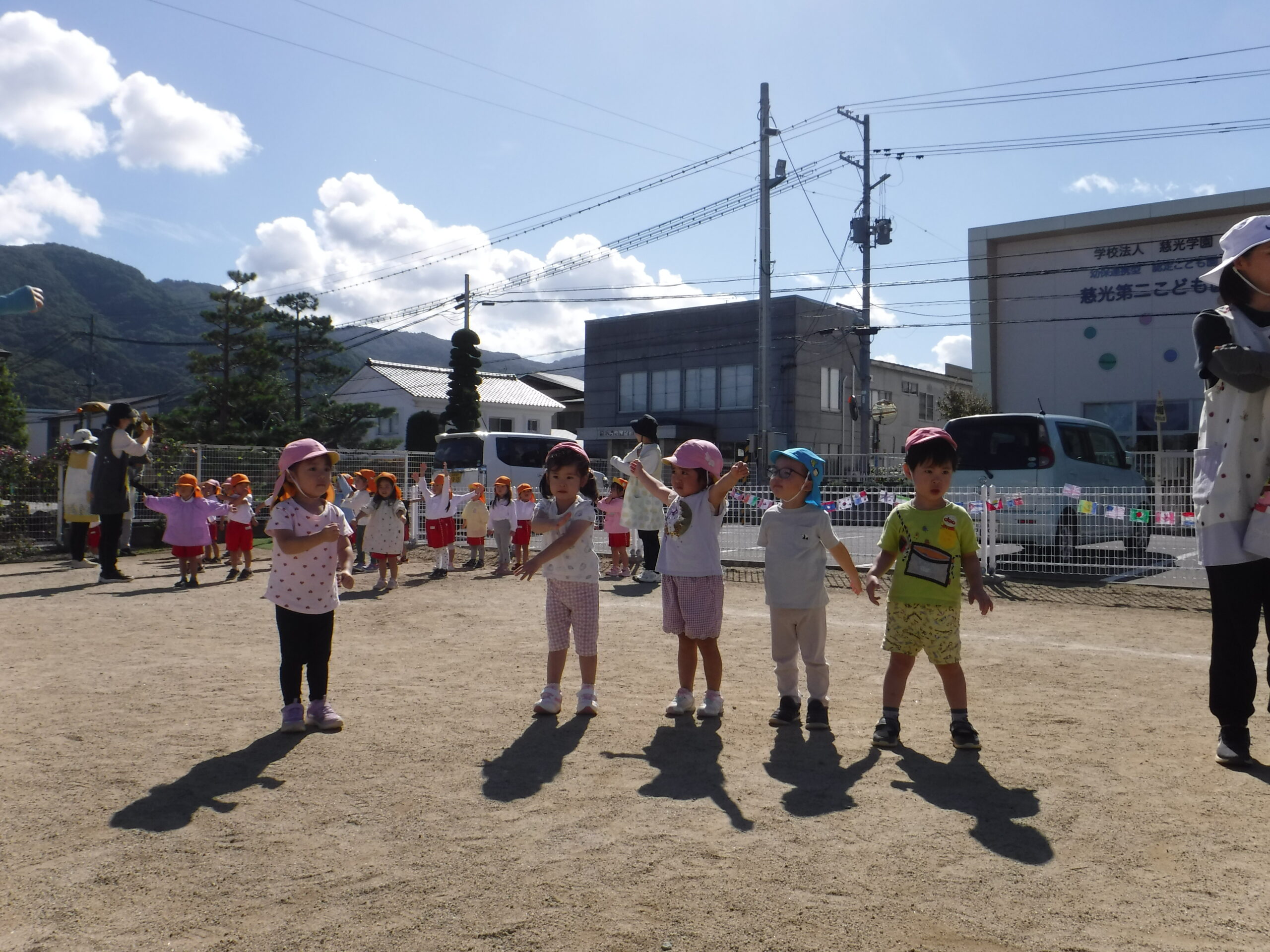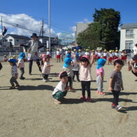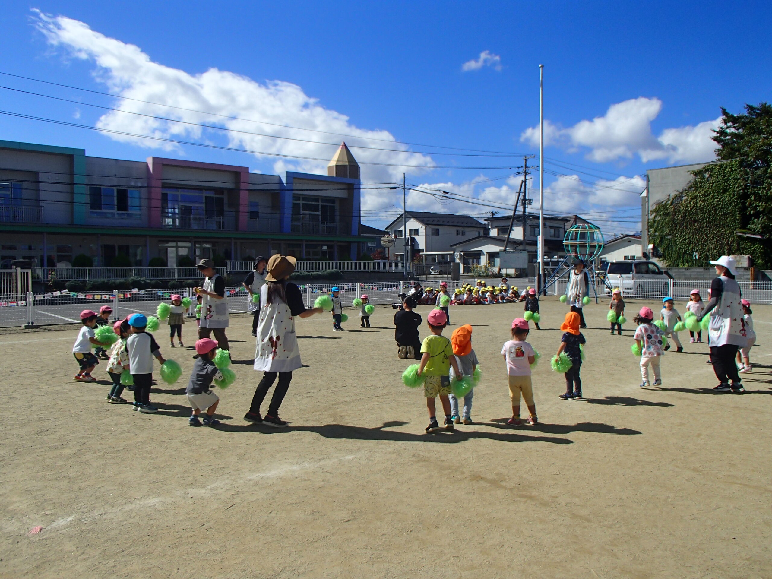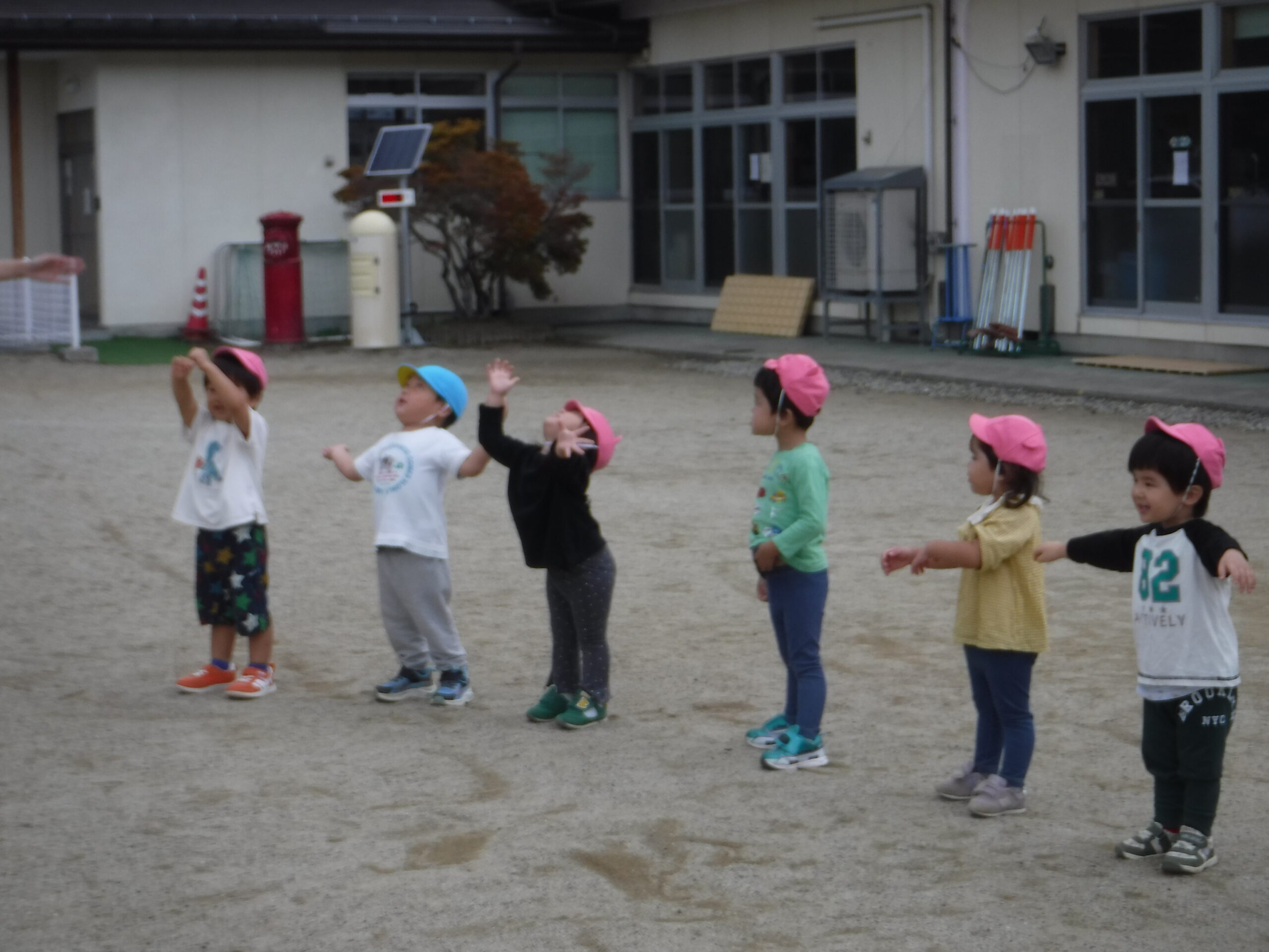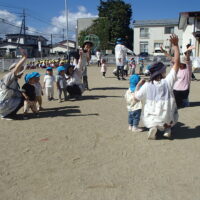 元気よく準備体操をしたあとは、つばめ組さん・あひる組さんが遊戯「でんでらりゅうば」を披露してくれました。