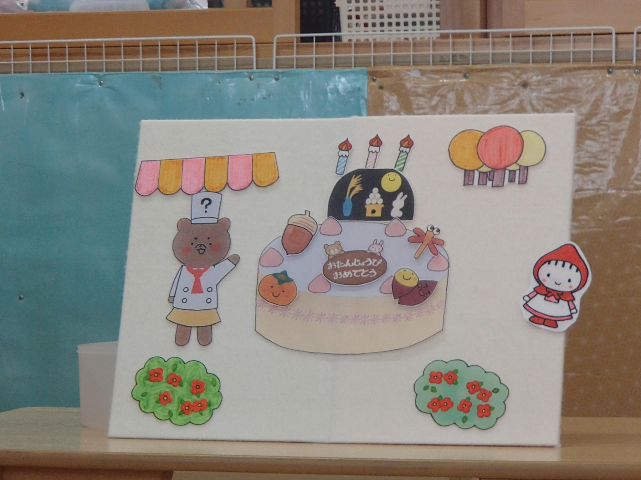 先生からの出し物では、クイズ形式のパネルシアターで「水色やぴかぴか、赤色の目をしていて…」「まん丸でお空に見える…」などヒントが出るたびに、「トンボ!」「おつきさま!」と元気に答えていました。最後には季節を感じさせる素敵なケーキができ、会場は大盛り上がり⤴楽しく参加しながら、笑顔いっぱいの時間を過ごしました♪