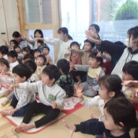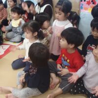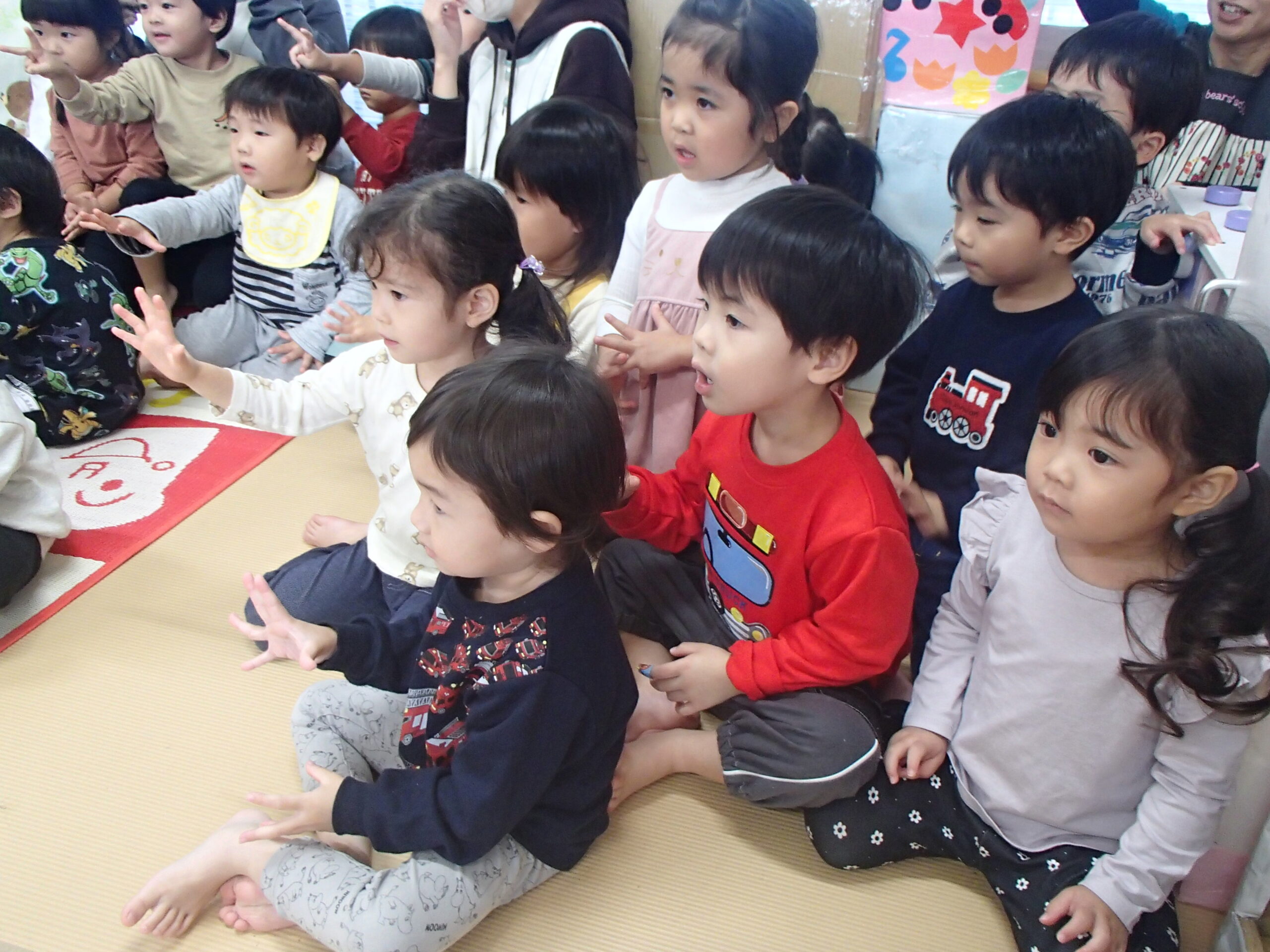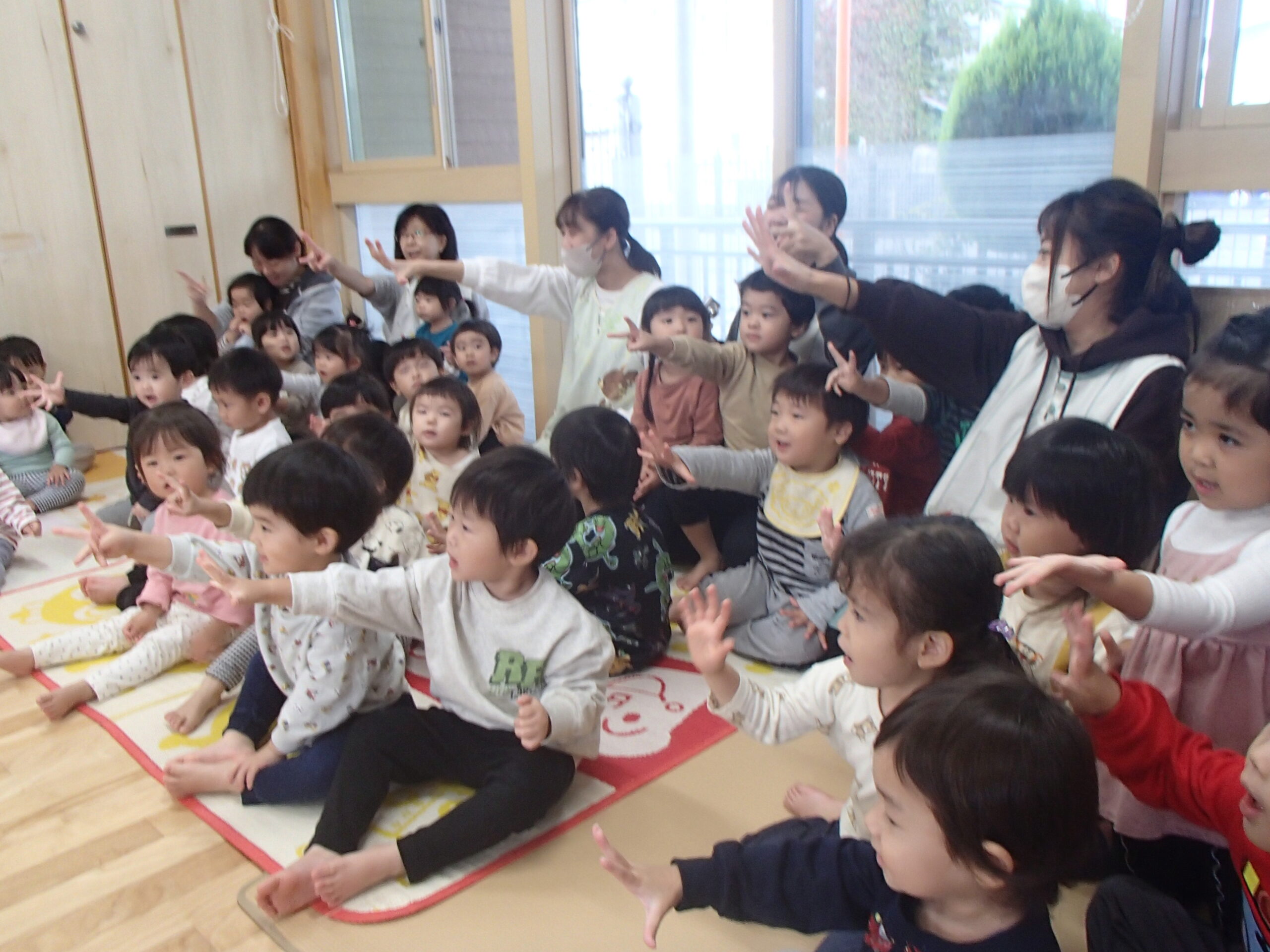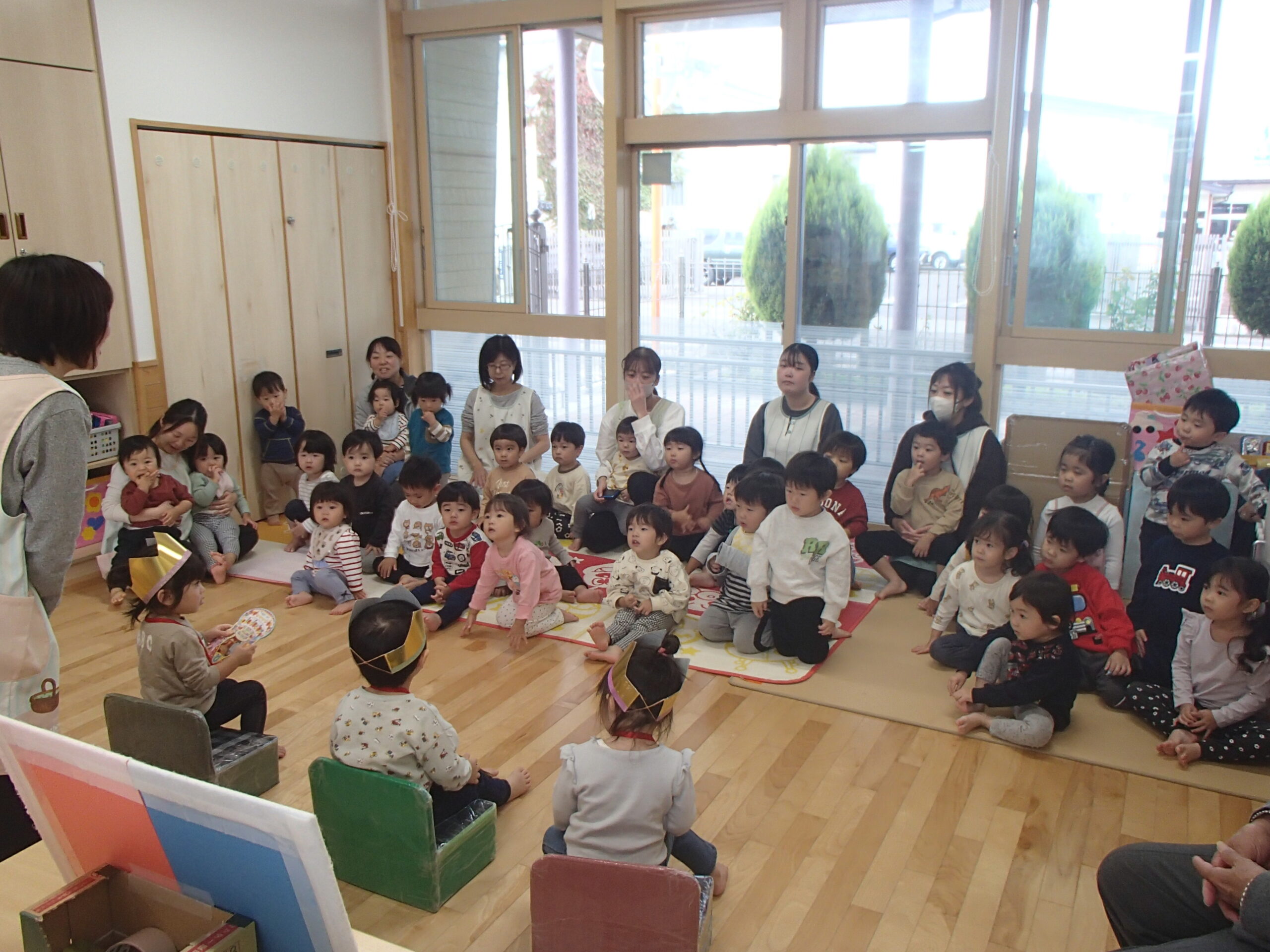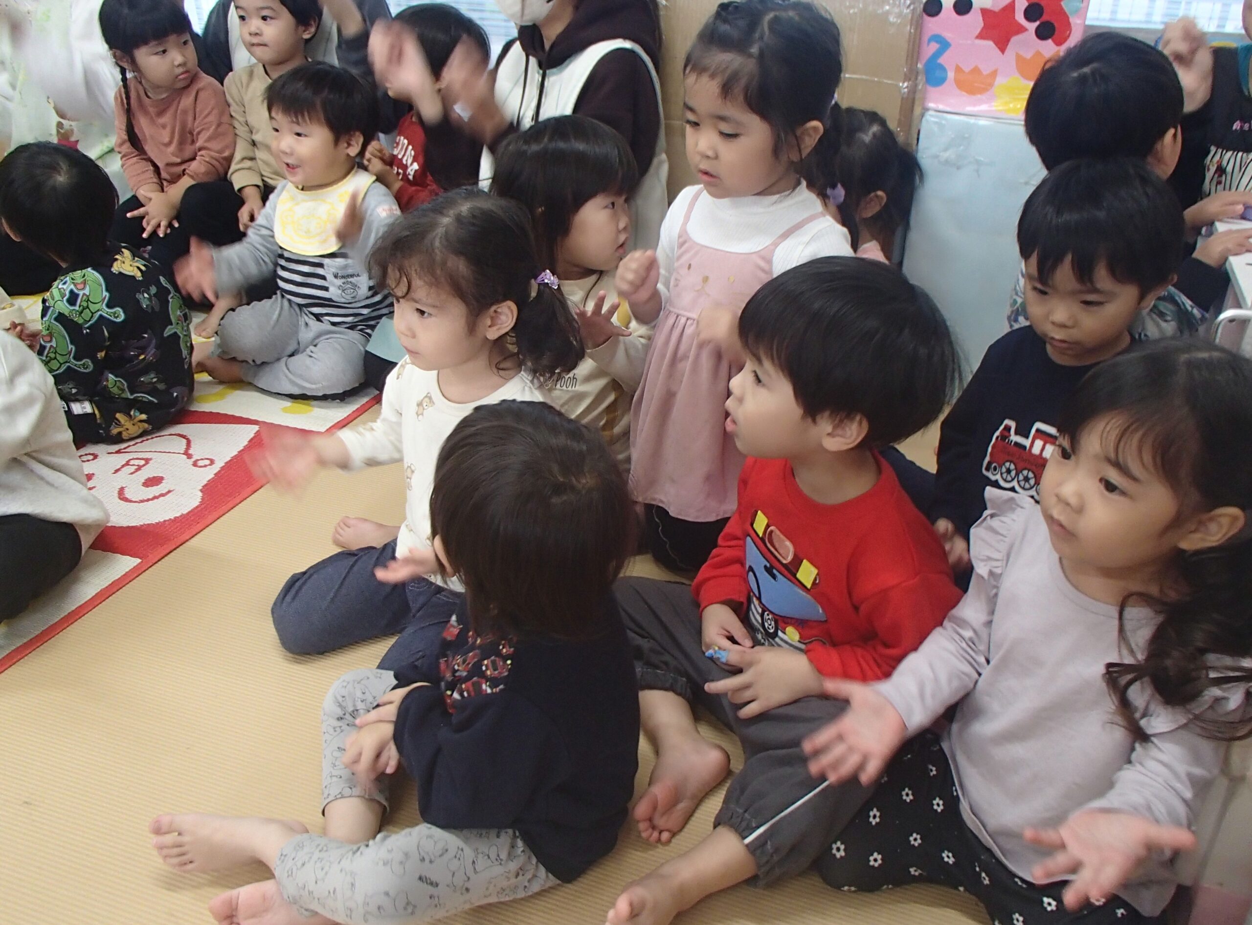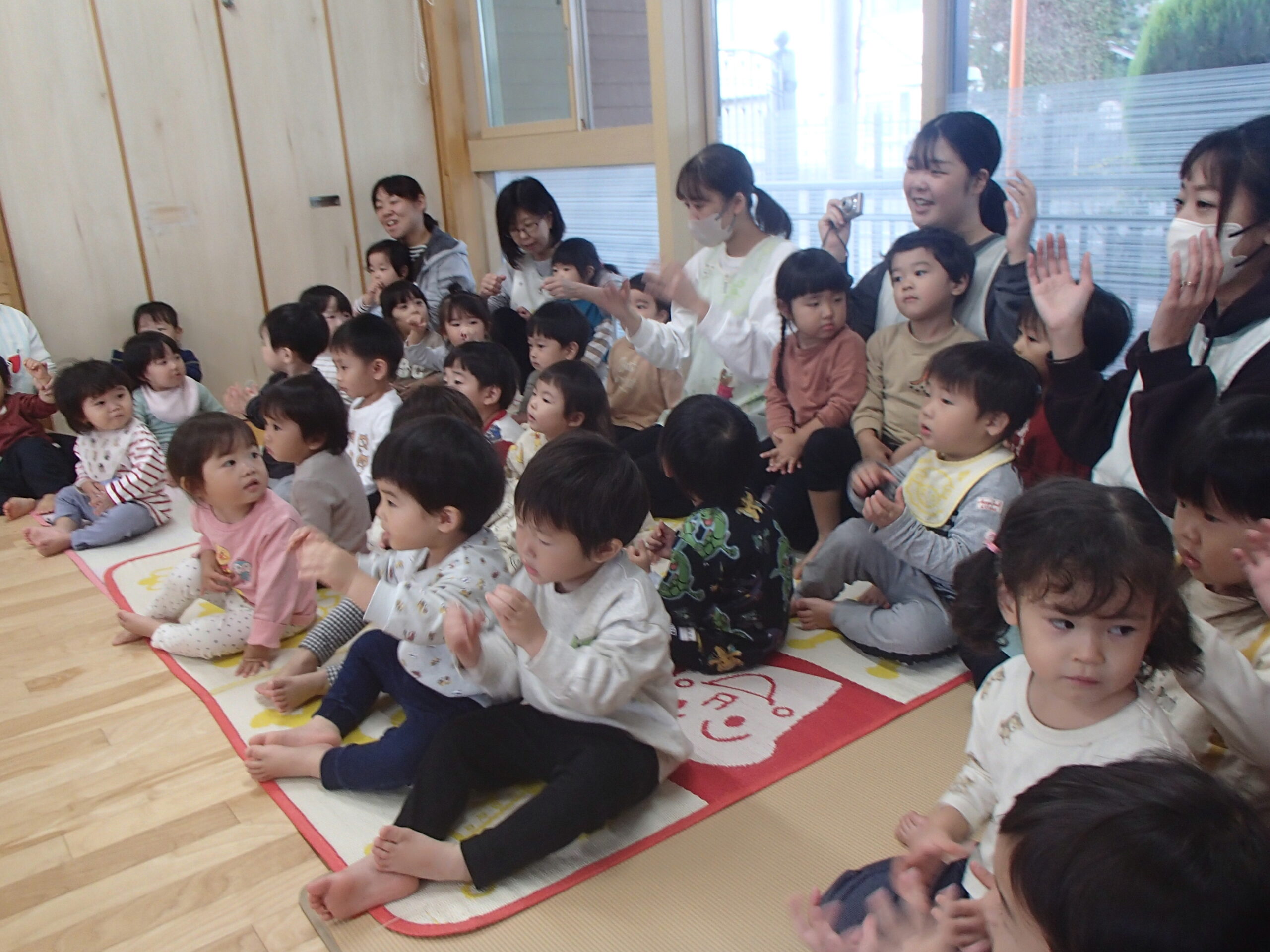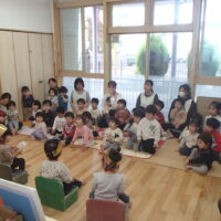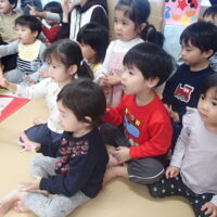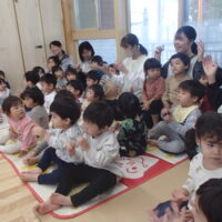 「やきいもグーチーパー」の手遊びをみんなで元気に歌い、“サツマイモ”や“色づいた葉っぱ”など秋にまつわるお話を聞いた後は、3名のお友達のお祝いをしました⭐