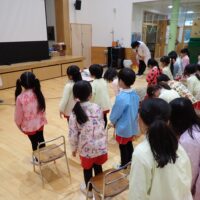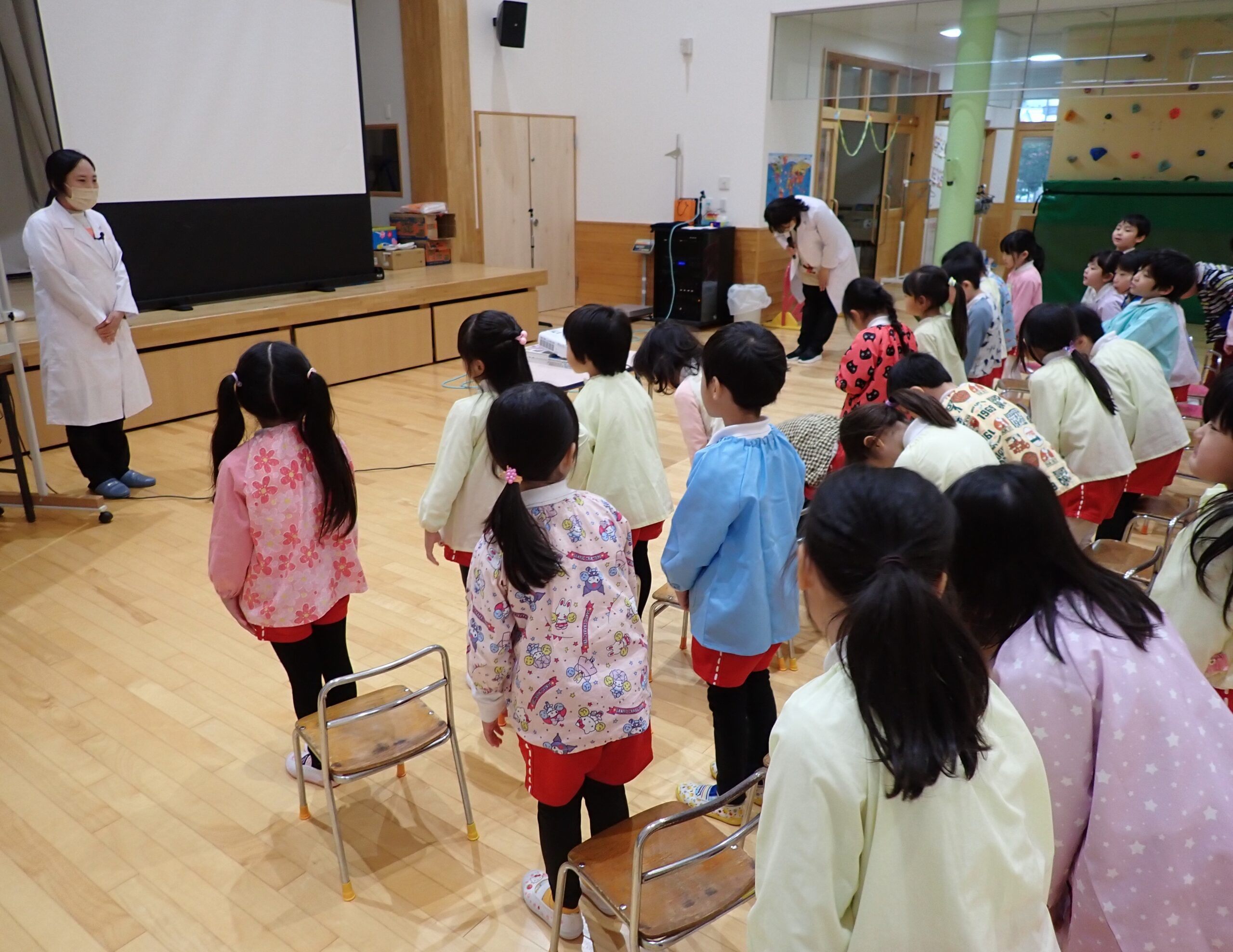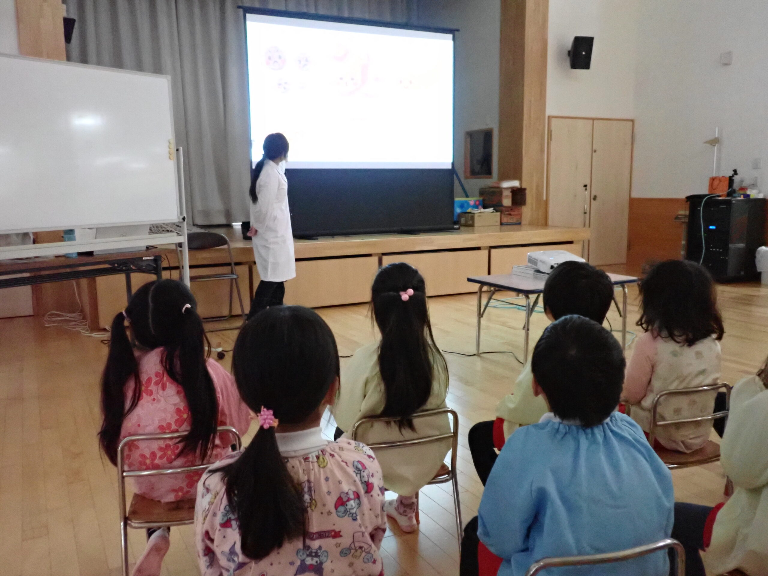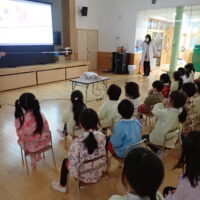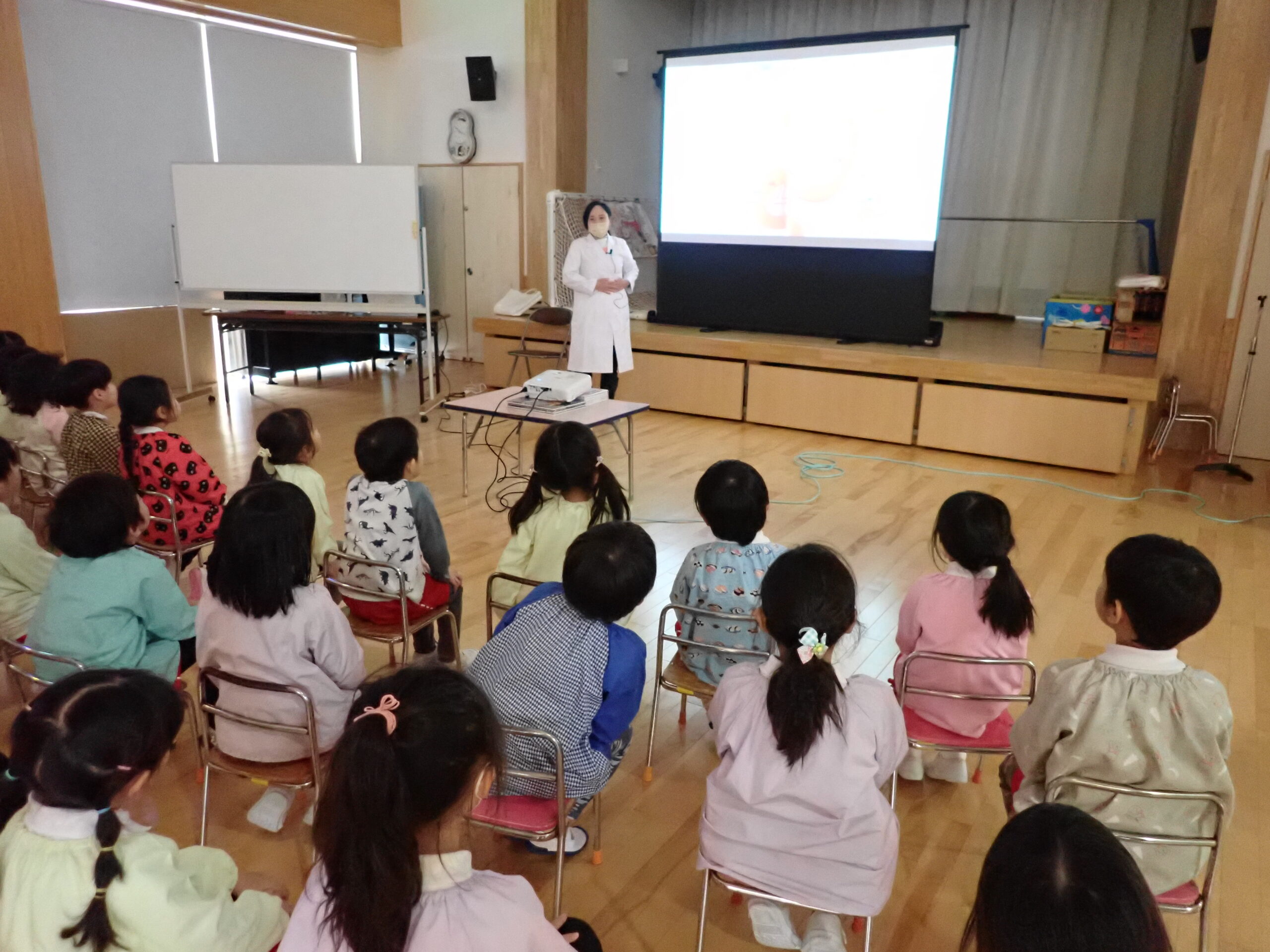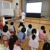 本日、年長さんが『元気な1年生になるために』ということで、食べ物と体のお話や生活リズムの大切さについてお話を聞きました。