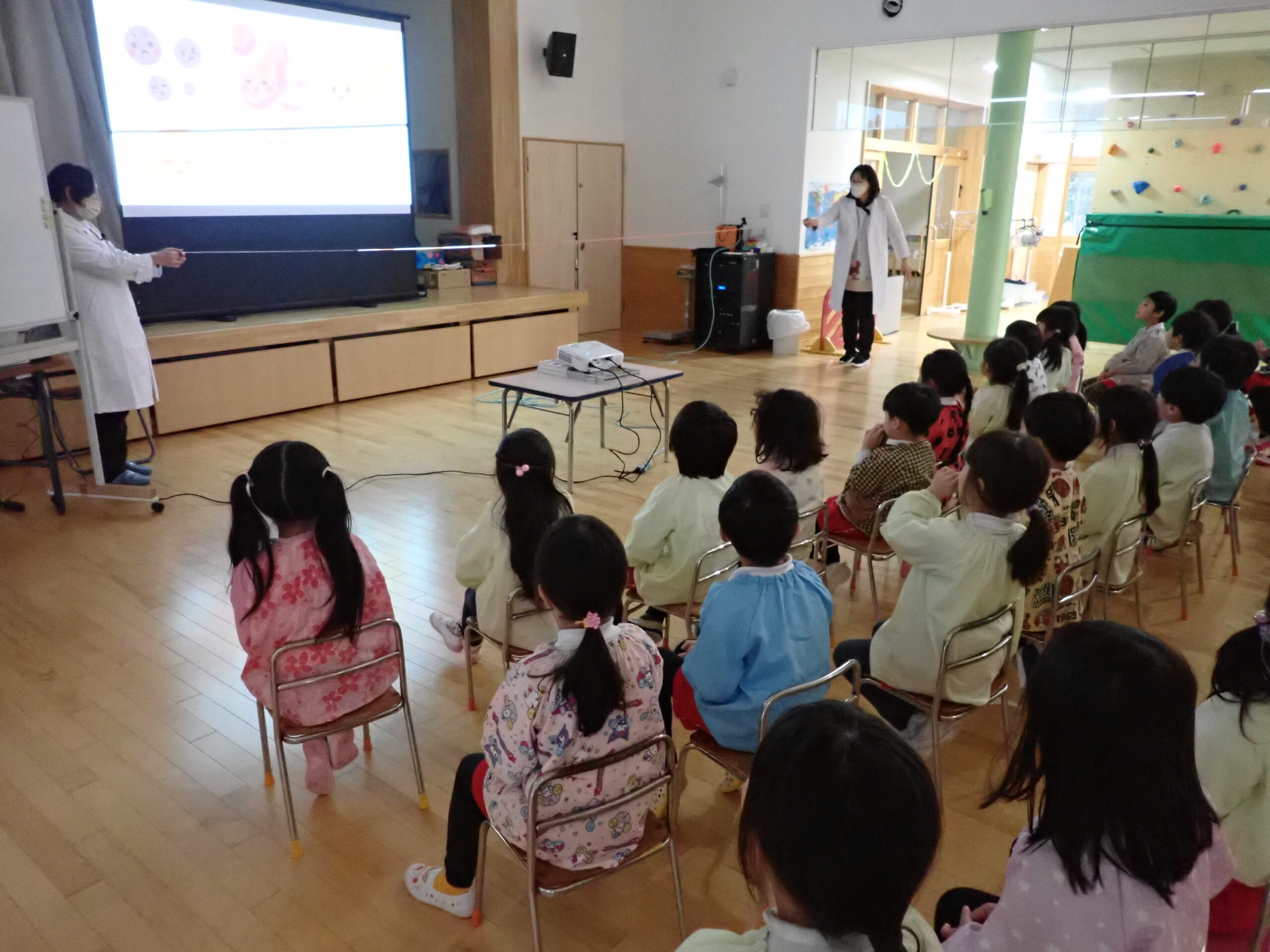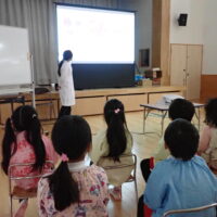 食べた物が栄養にならずにいらなくなったものが便で出てくること、便の状態で体の状態がわかる大切な『お便り』ということ、腸の長さは子ども達の身長の7倍もあることを教えてくださいました。
