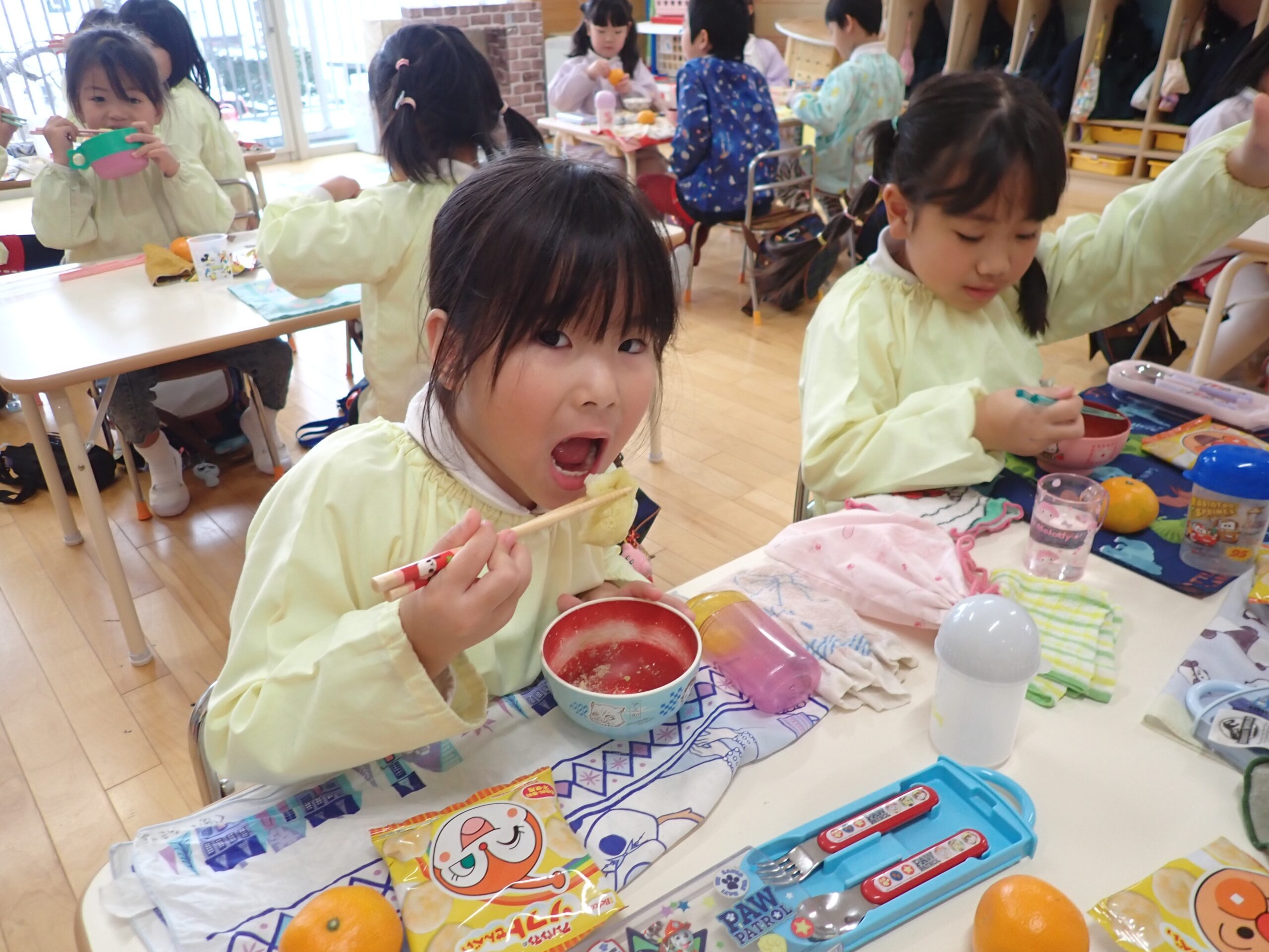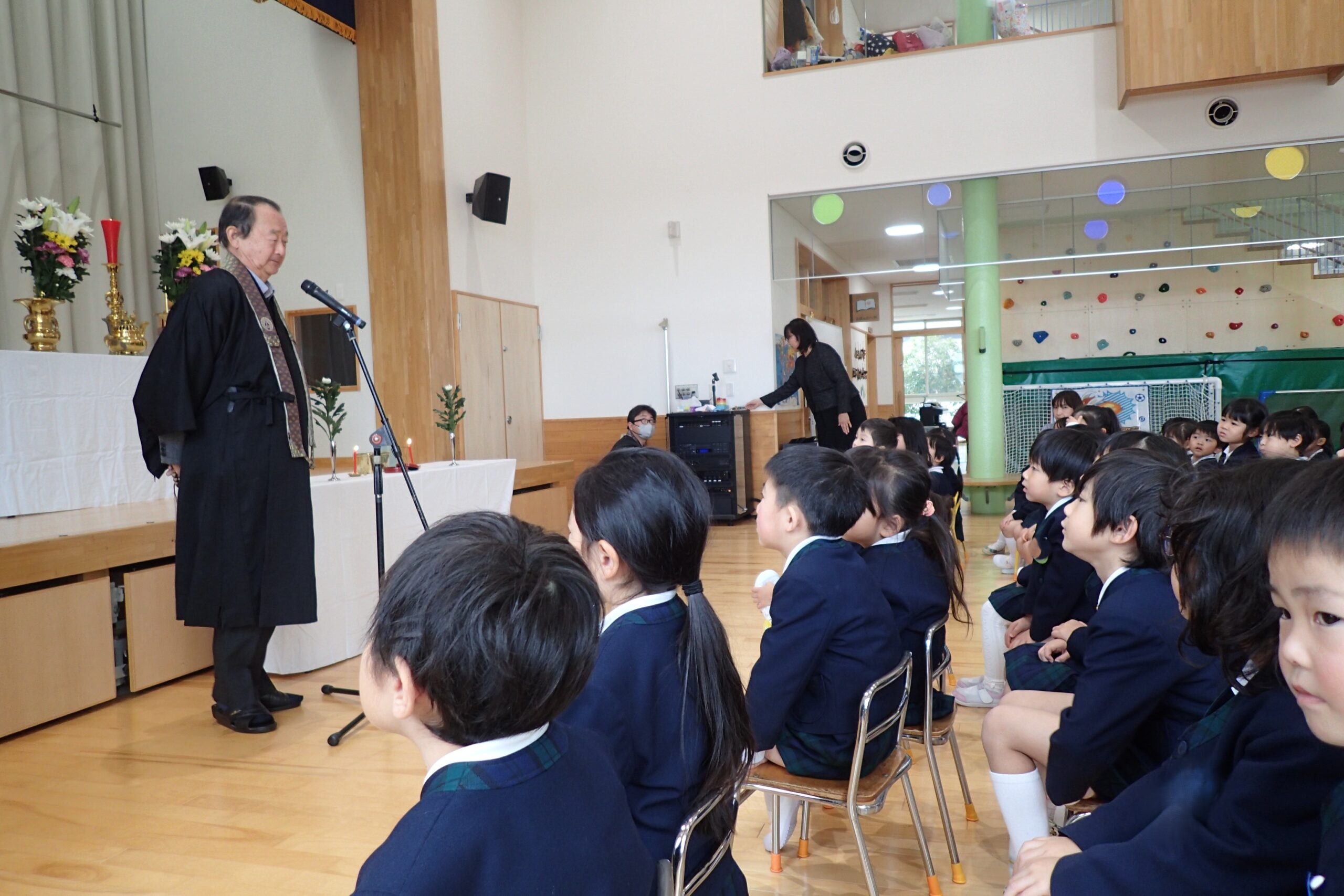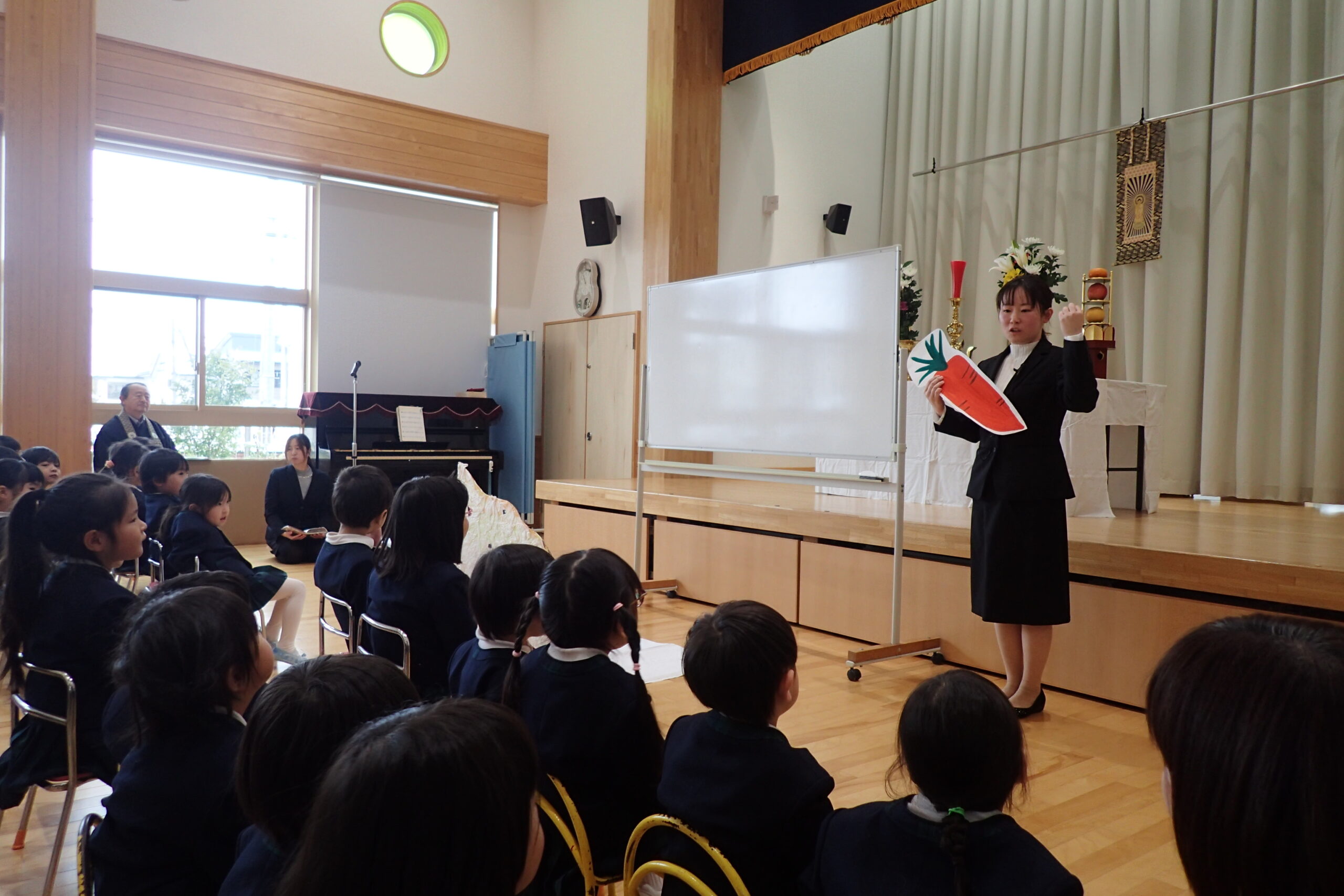 園長先生から「みんなは食べ物の命をいただいたり、お家の人にごはんを作ってもらったりして、周りの人のおかげで生きてるいるんだよ。目に見えない“お陰様”というありがとうの気持ちが大切なんだよ」というお話をいただきました。