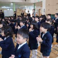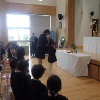 厳かな雰囲気の中、年長さんの代表のお友達が献灯・献花・献香をし、焼香をする年長さんと一緒にみんなで手を泡得てお参りをしました。