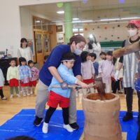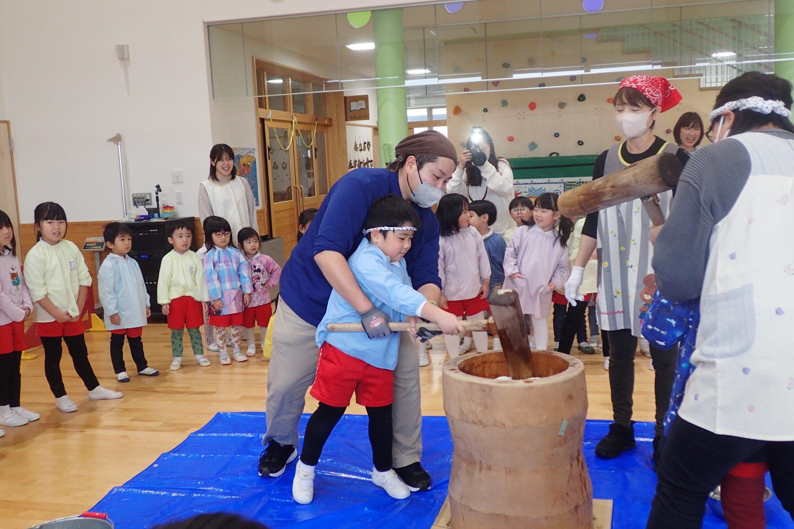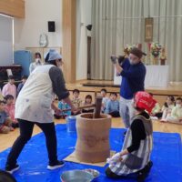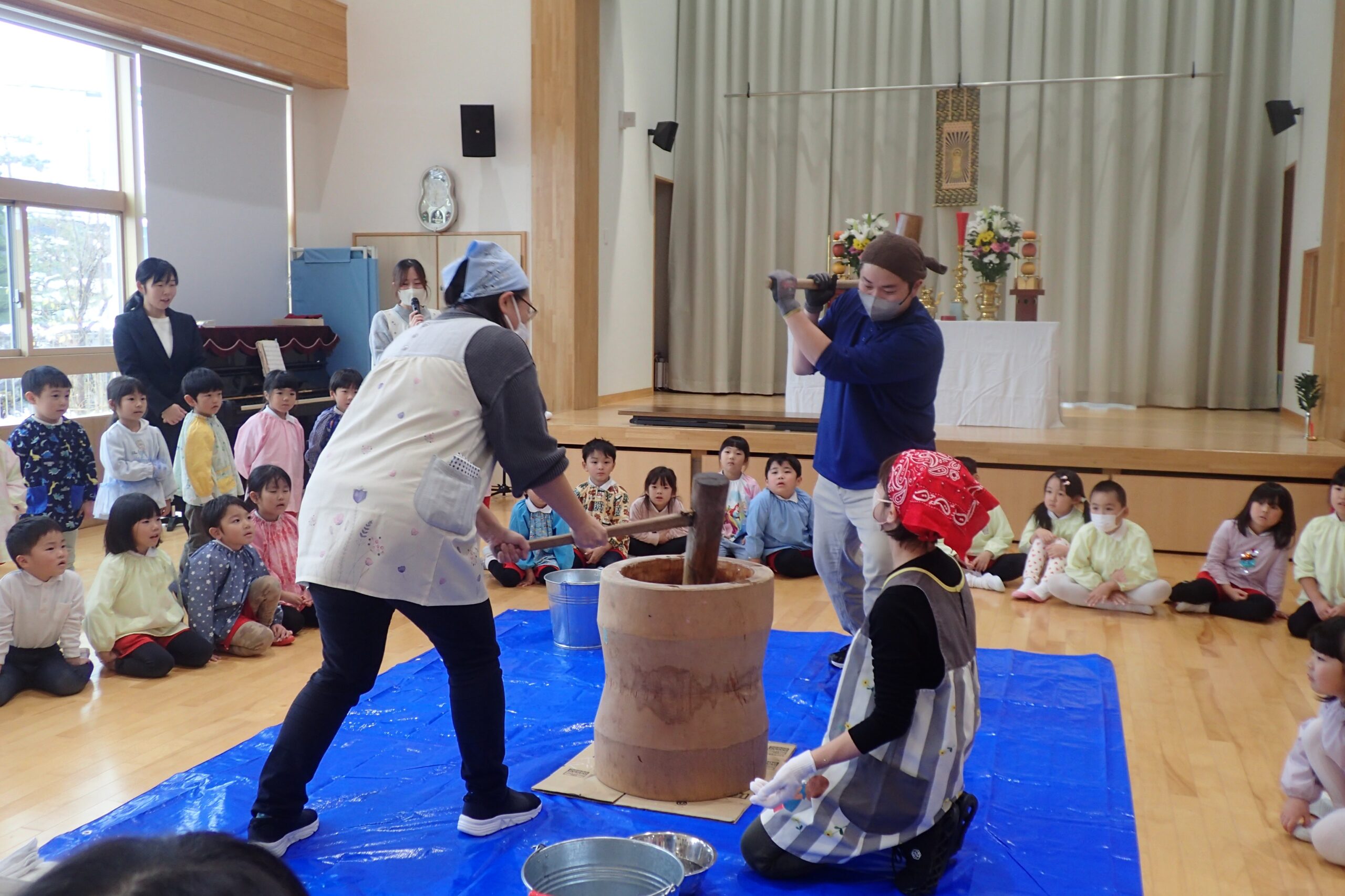 こども園にもち米を蒸したおいしそうなにおいが広がり、楽しみにしていた子ども達。