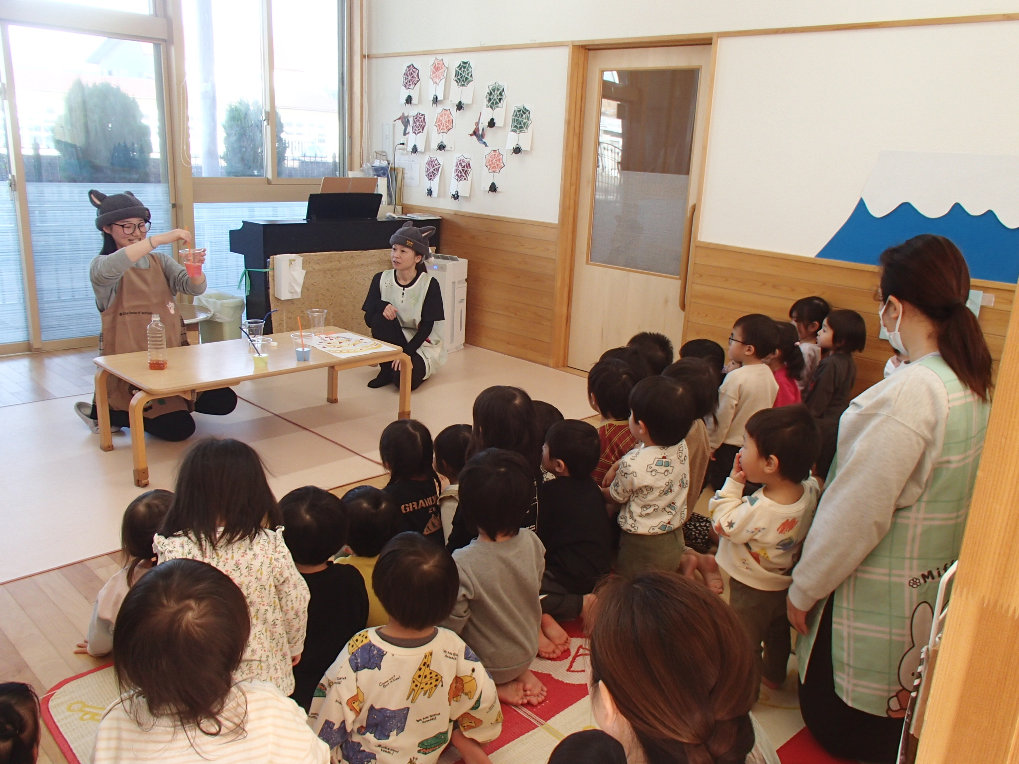 12月の誕生会ではスペシャルなゲストが来てくれました!かわいいネコさんが手品を披露してくれました✨「ちちんぷいぷいのぷーい」の掛け声でケーキやジュースが登場!!子ども達からは「わぁー👀!!」と歓声が上がっていました♪目をキラキラさせながらとっても楽しんでいましたよ!