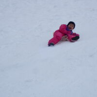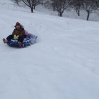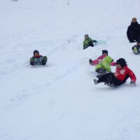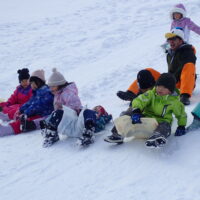 先生とお手伝いのお父さん、お母さんが楽しそうに坂を滑っていて、「ずる~い!!!」「はやくやりたい!」と待ちきれない様子でした。(先生、お家の方はみんなが滑りやすいように準備してくれていました😉)