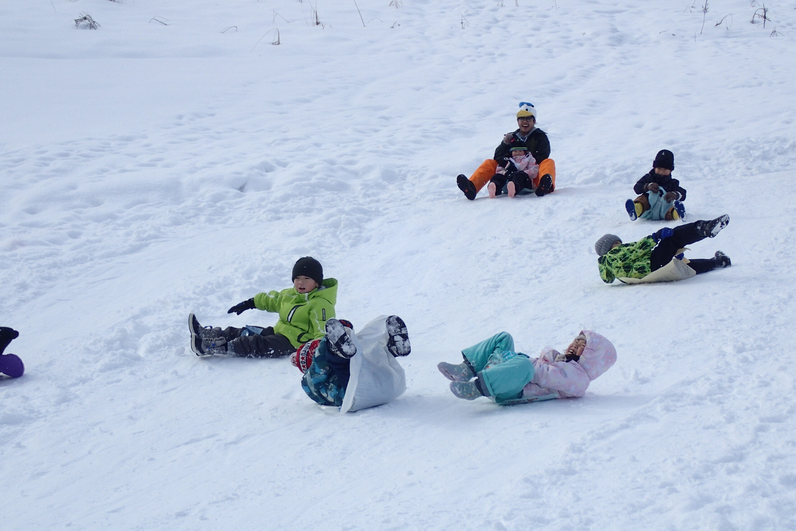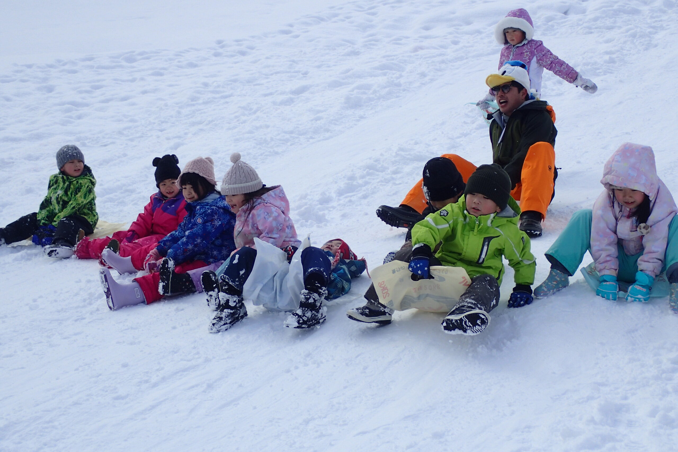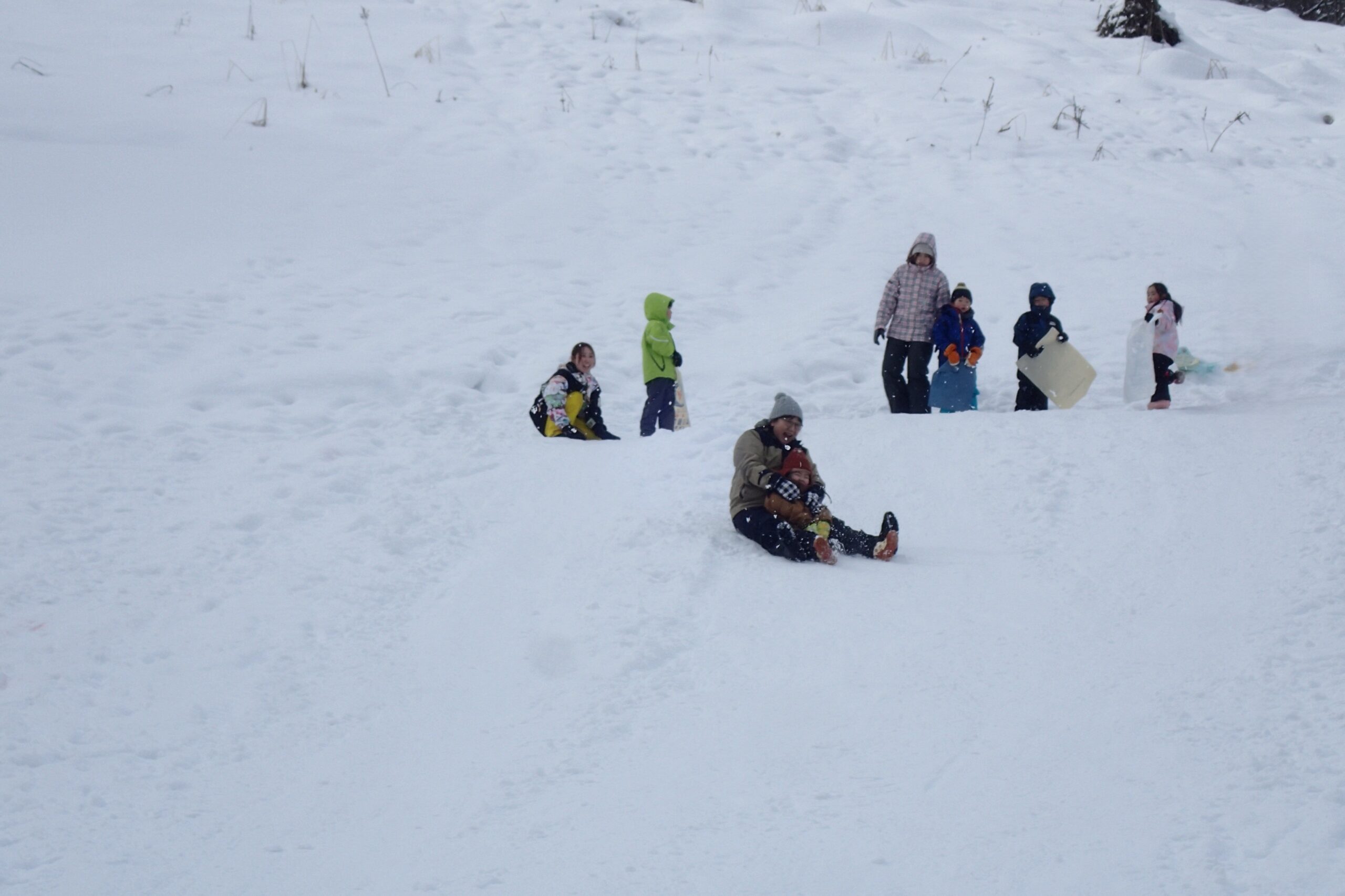 先生とお手伝いのお父さん、お母さんが楽しそうに坂を滑っていて、「ずる~い!!!」「はやくやりたい!」と待ちきれない様子でした。(先生、お家の方はみんなが滑りやすいように準備してくれていました😉)