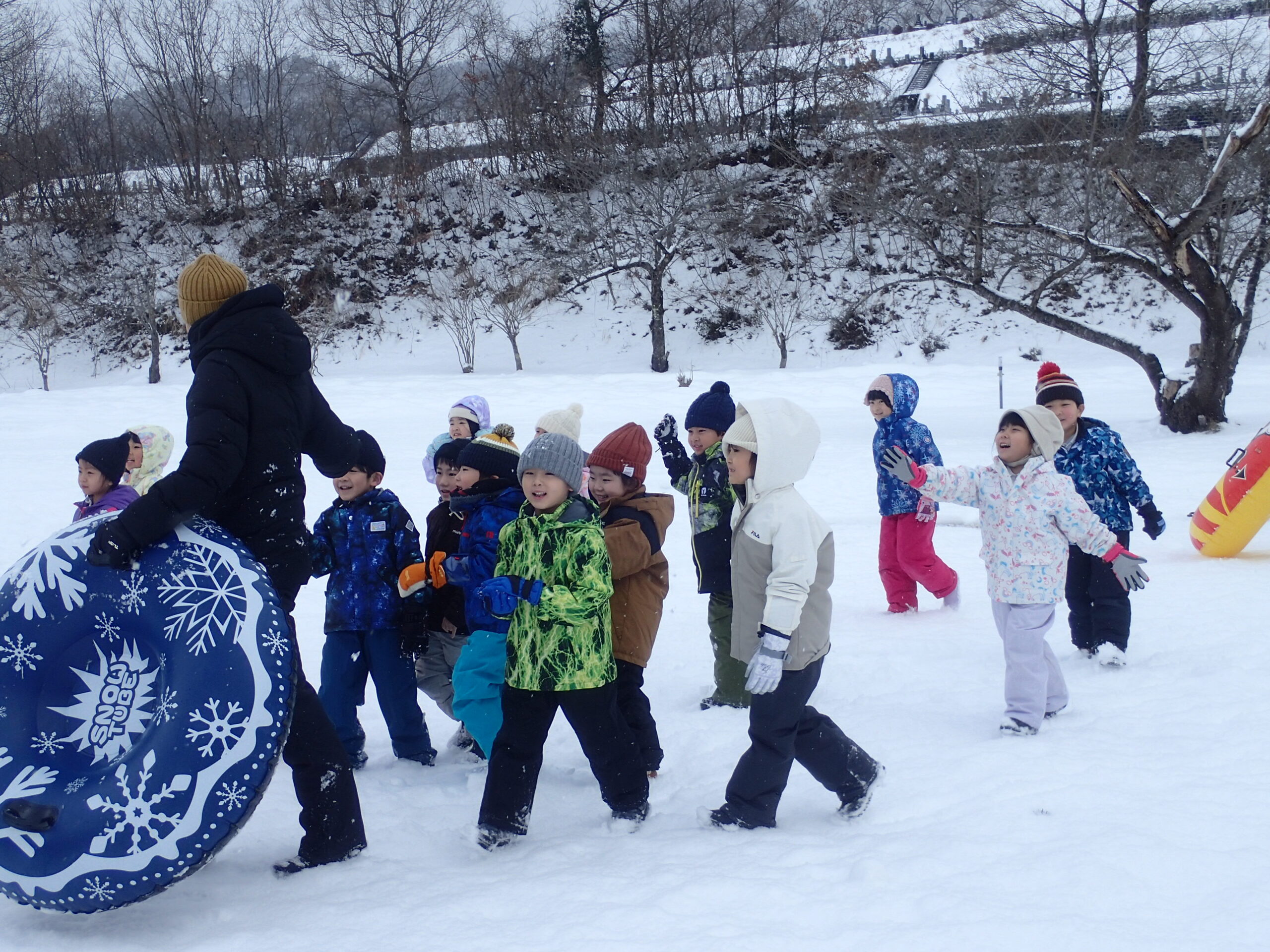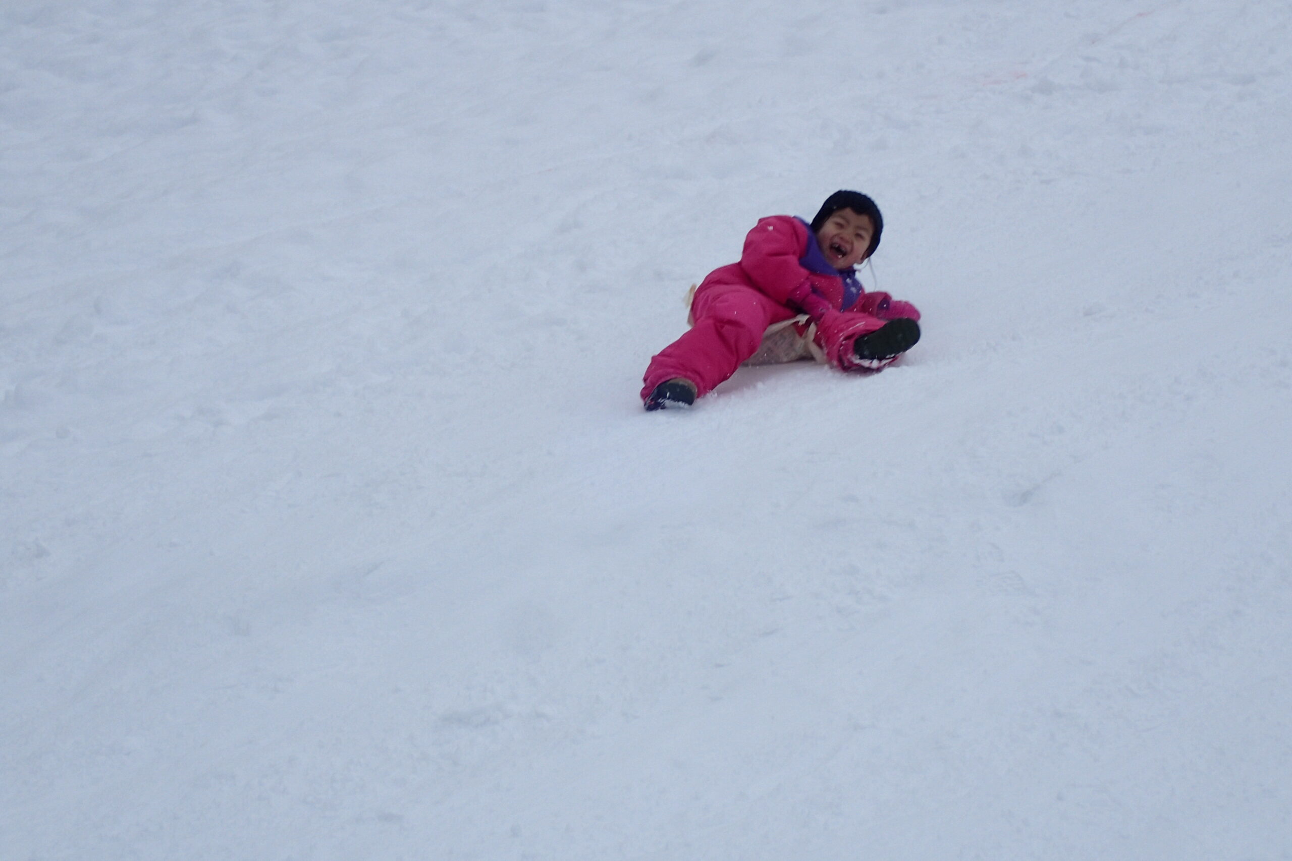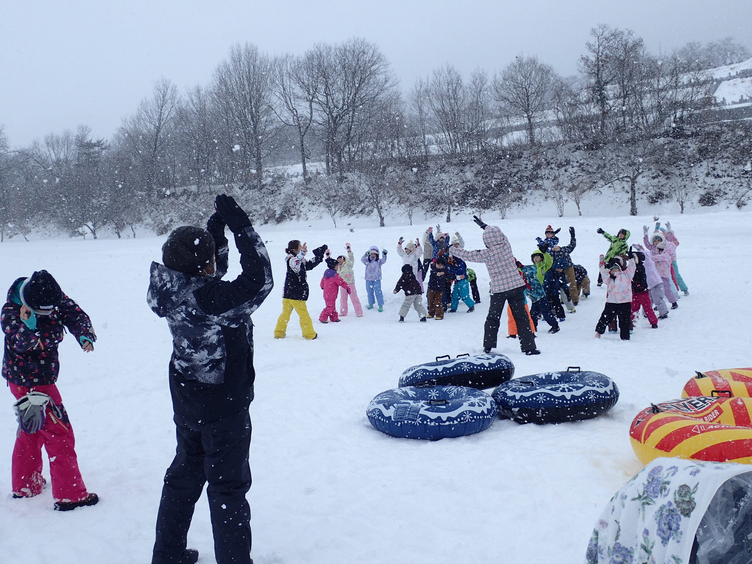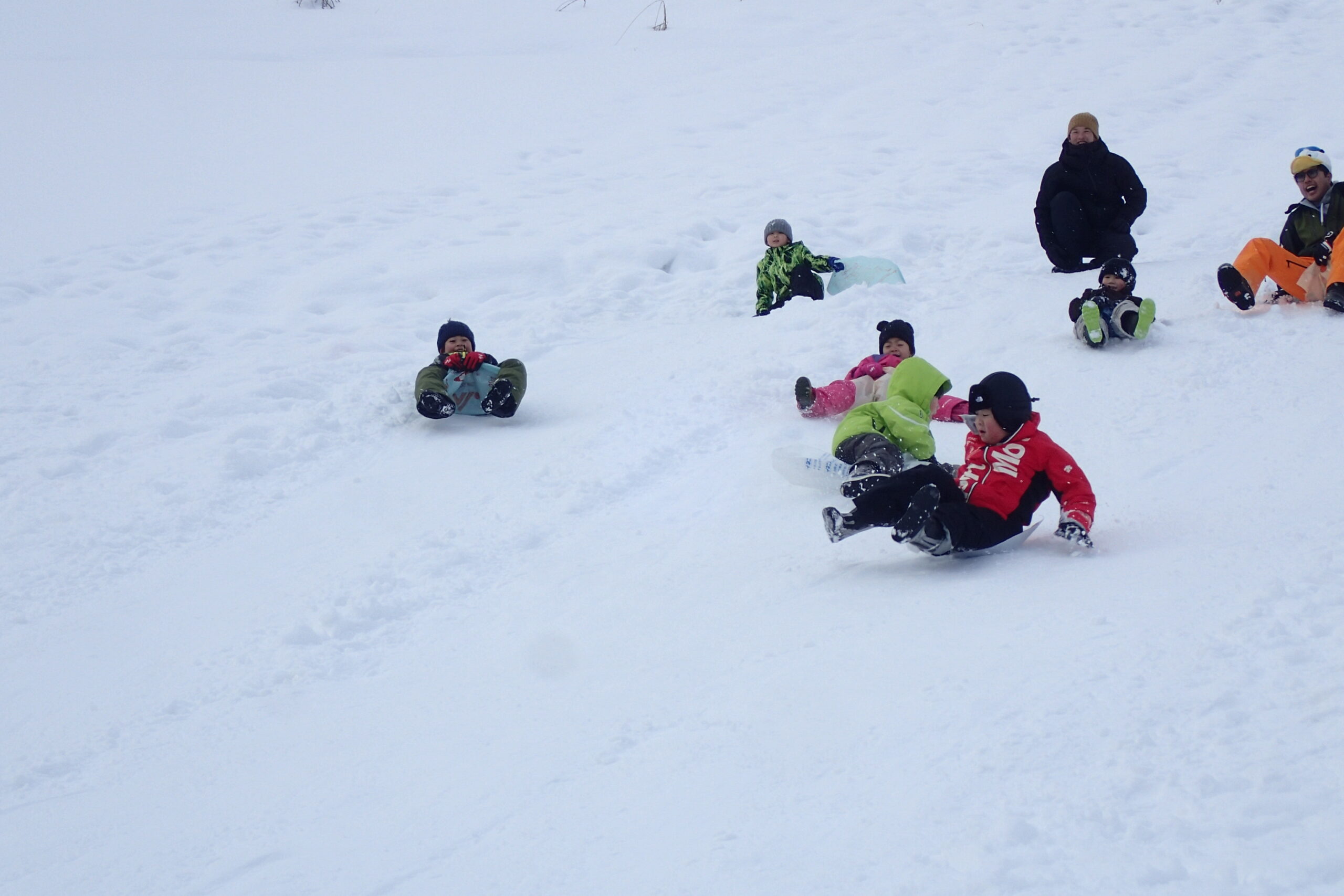 先生とお手伝いのお父さん、お母さんが楽しそうに坂を滑っていて、「ずる~い!!!」「はやくやりたい!」と待ちきれない様子でした。(先生、お家の方はみんなが滑りやすいように準備してくれていました😉)
