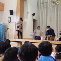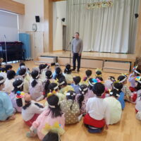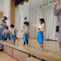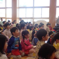 歌の後はいよいよ豆まきの始まりです!年長の代表のお友達が裃(かみしも)に袴姿でステージの上に登場し、皆に向かって「おには~そと~!」「ふくは~うち!」と元気な掛け声で豆まきをし、みんなのお腹の中にいた鬼を退治することができました!