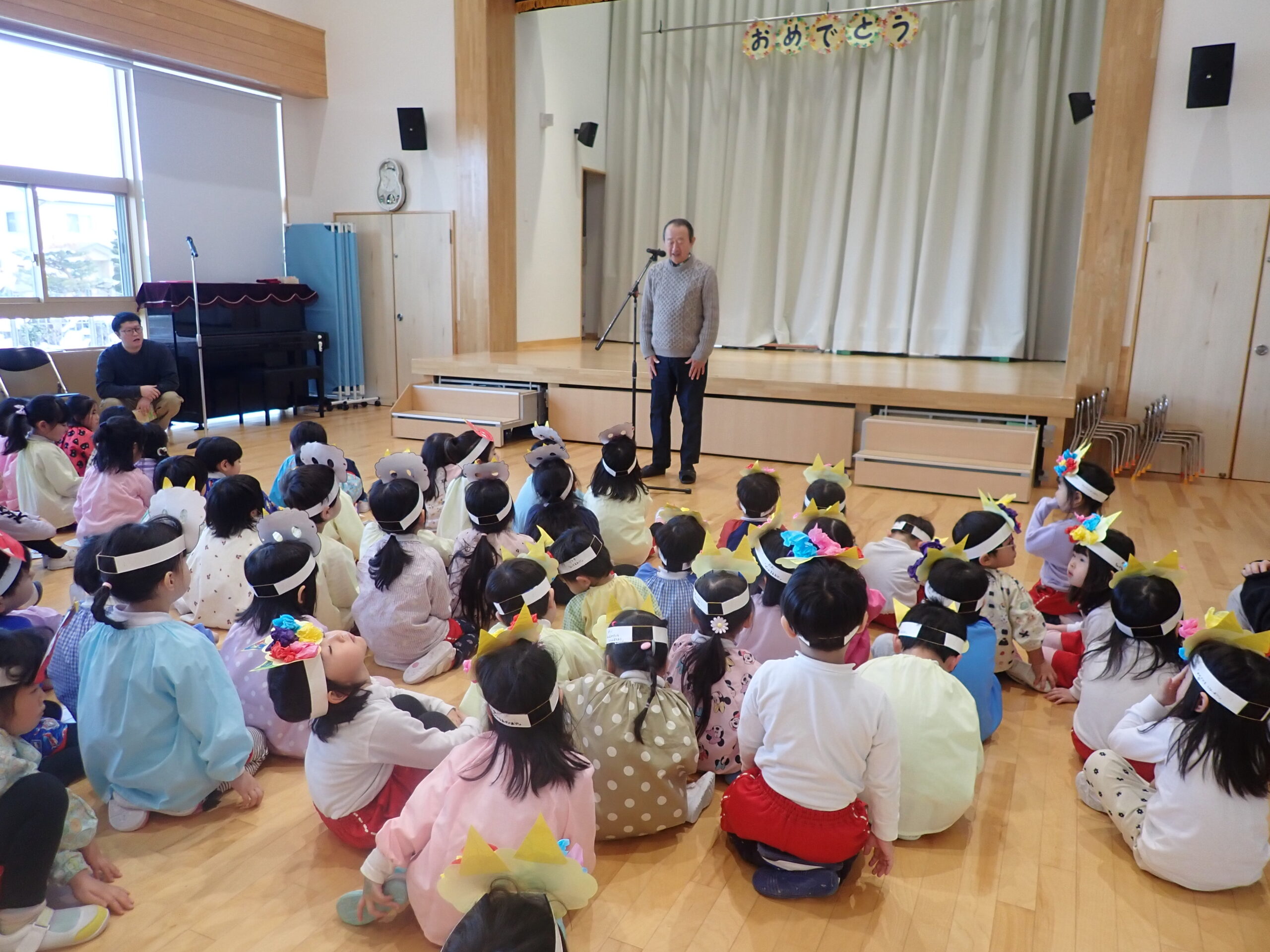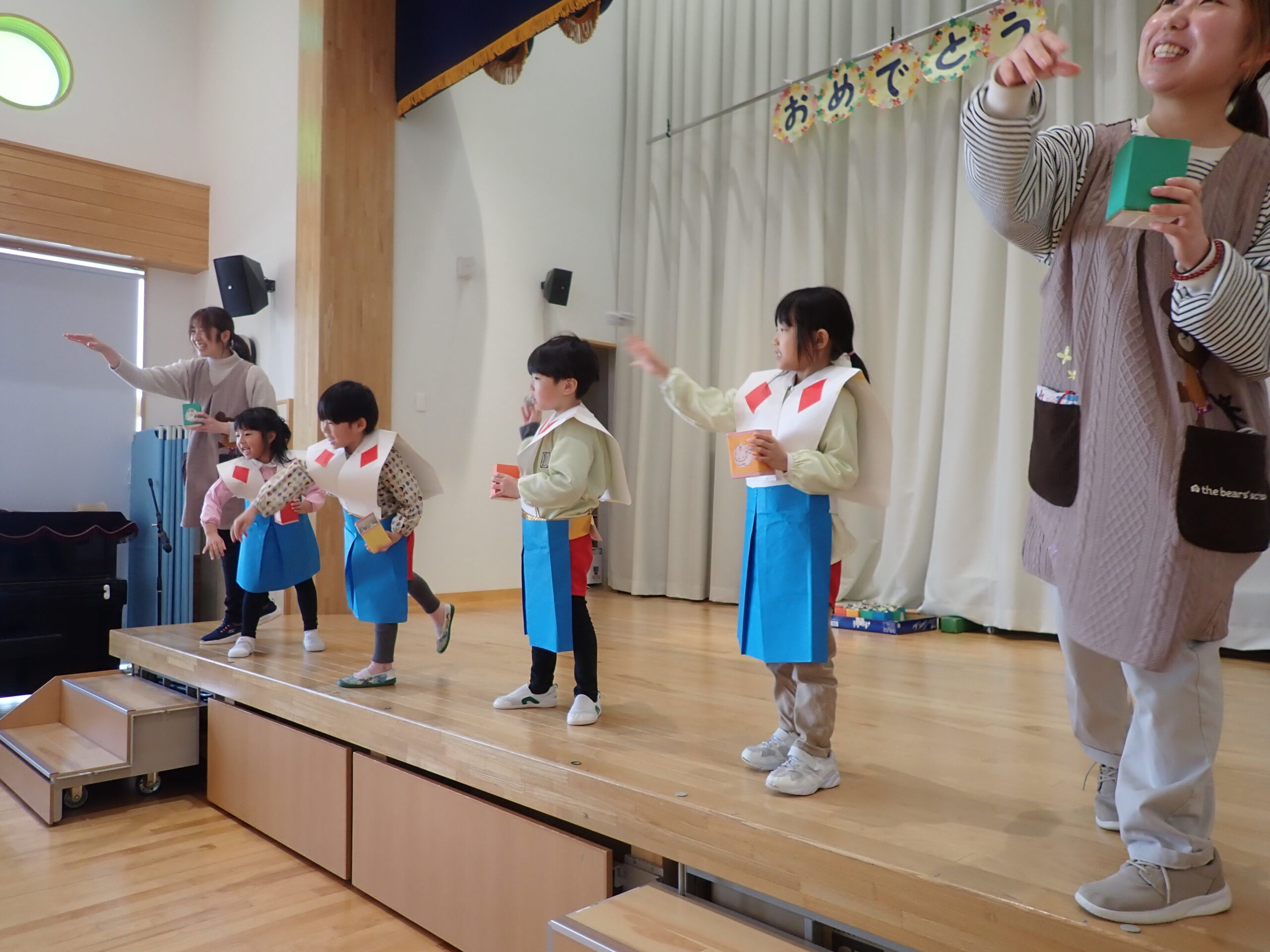 歌の後はいよいよ豆まきの始まりです!年長の代表のお友達が裃(かみしも)に袴姿でステージの上に登場し、皆に向かって「おには~そと~!」「ふくは~うち!」と元気な掛け声で豆まきをし、みんなのお腹の中にいた鬼を退治することができました!