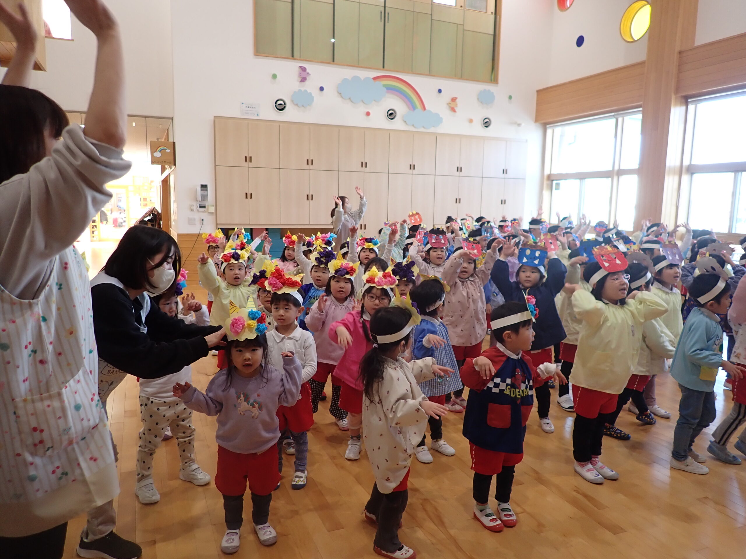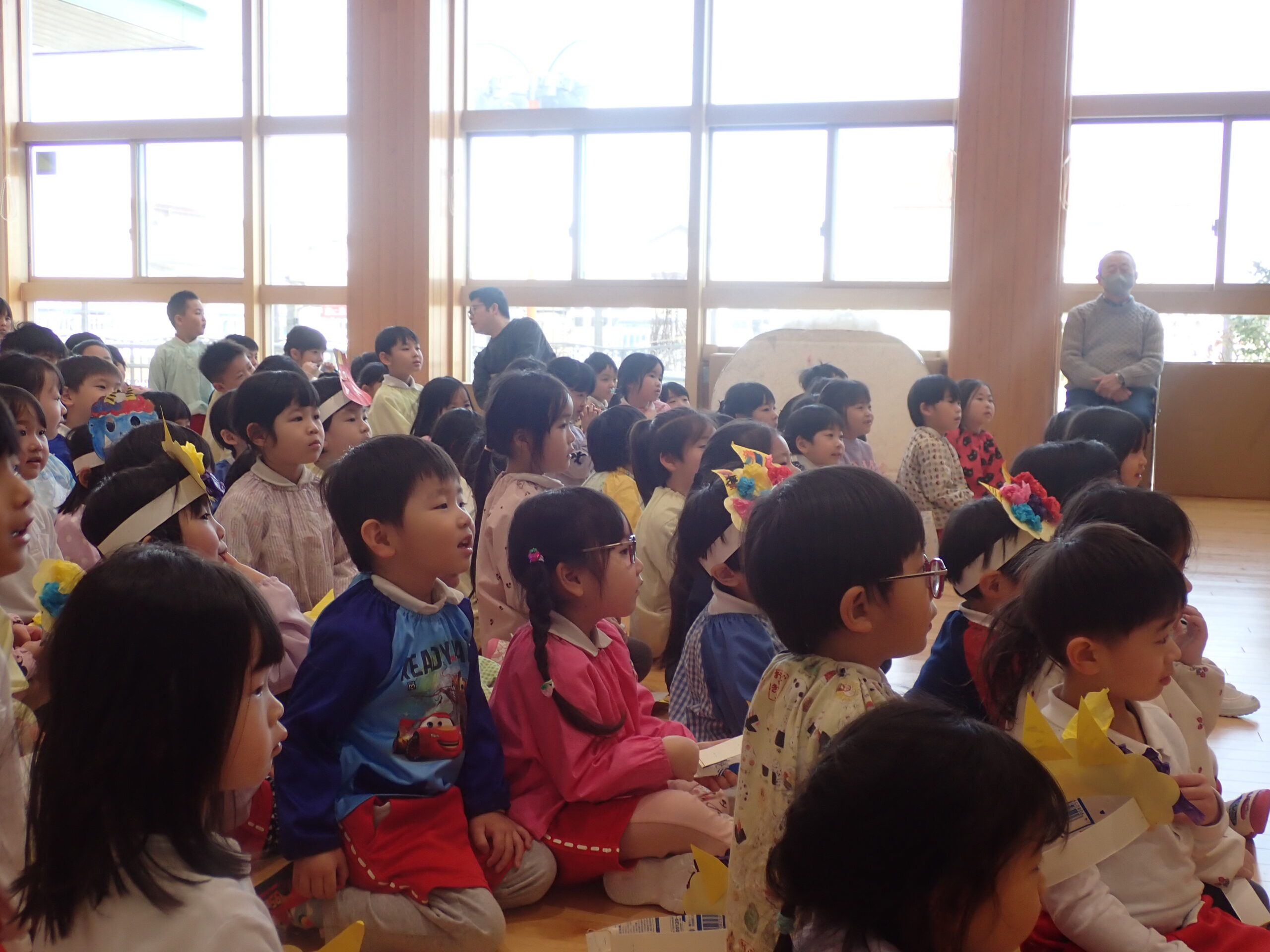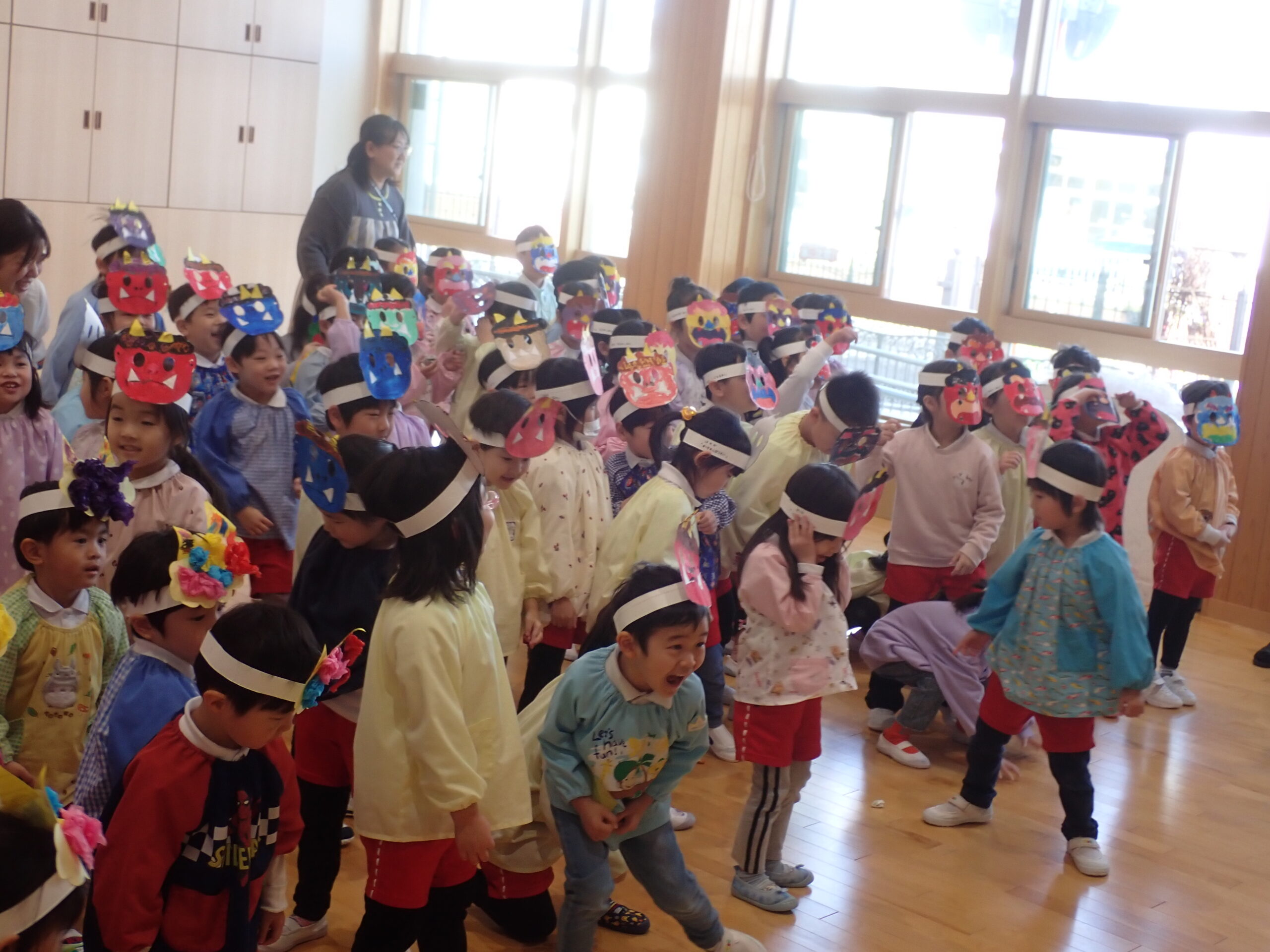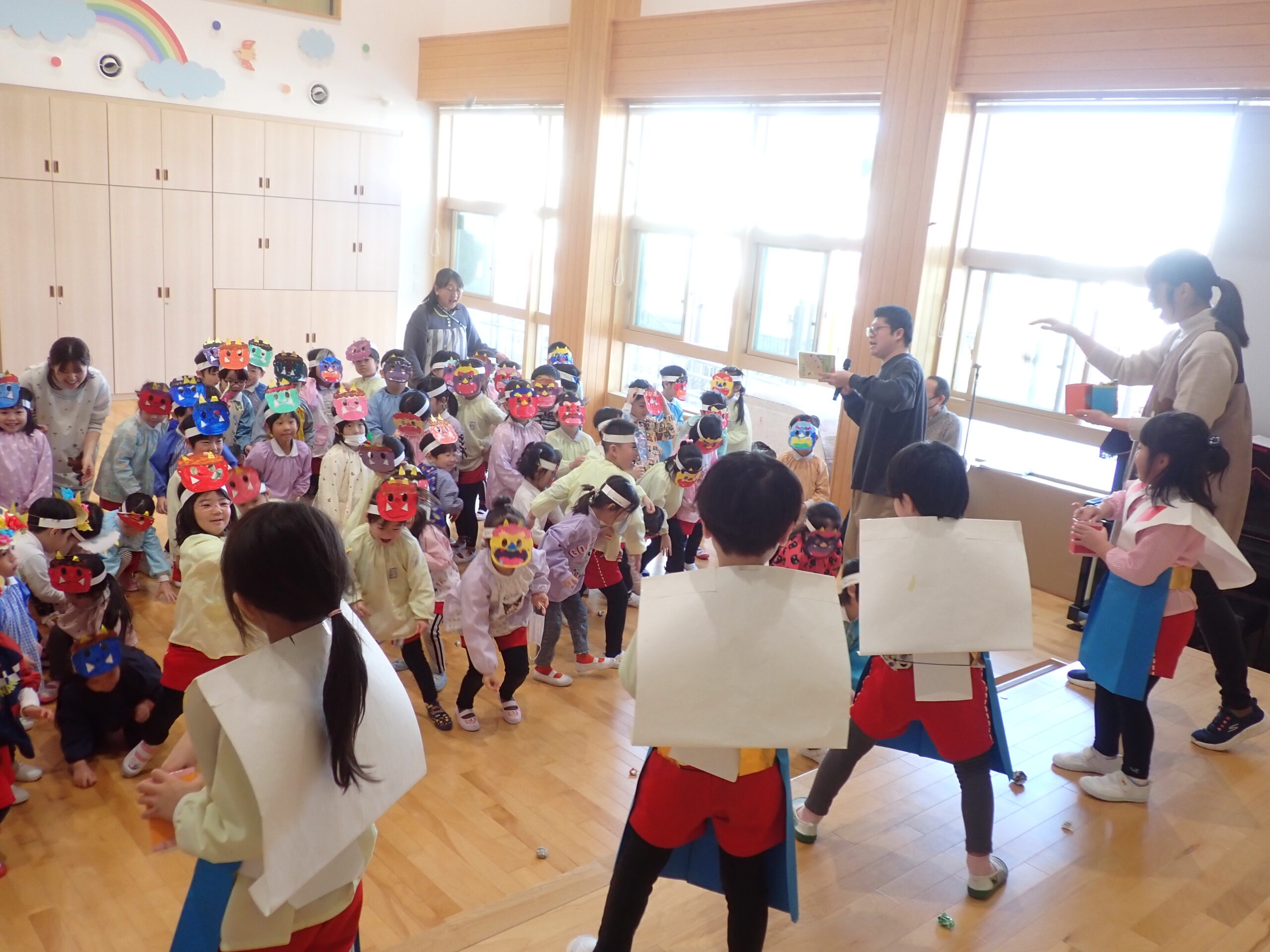 「みんなが健康でしあわせにすごせますように」と願いを込めて、園でも豆まき集会を行いました。