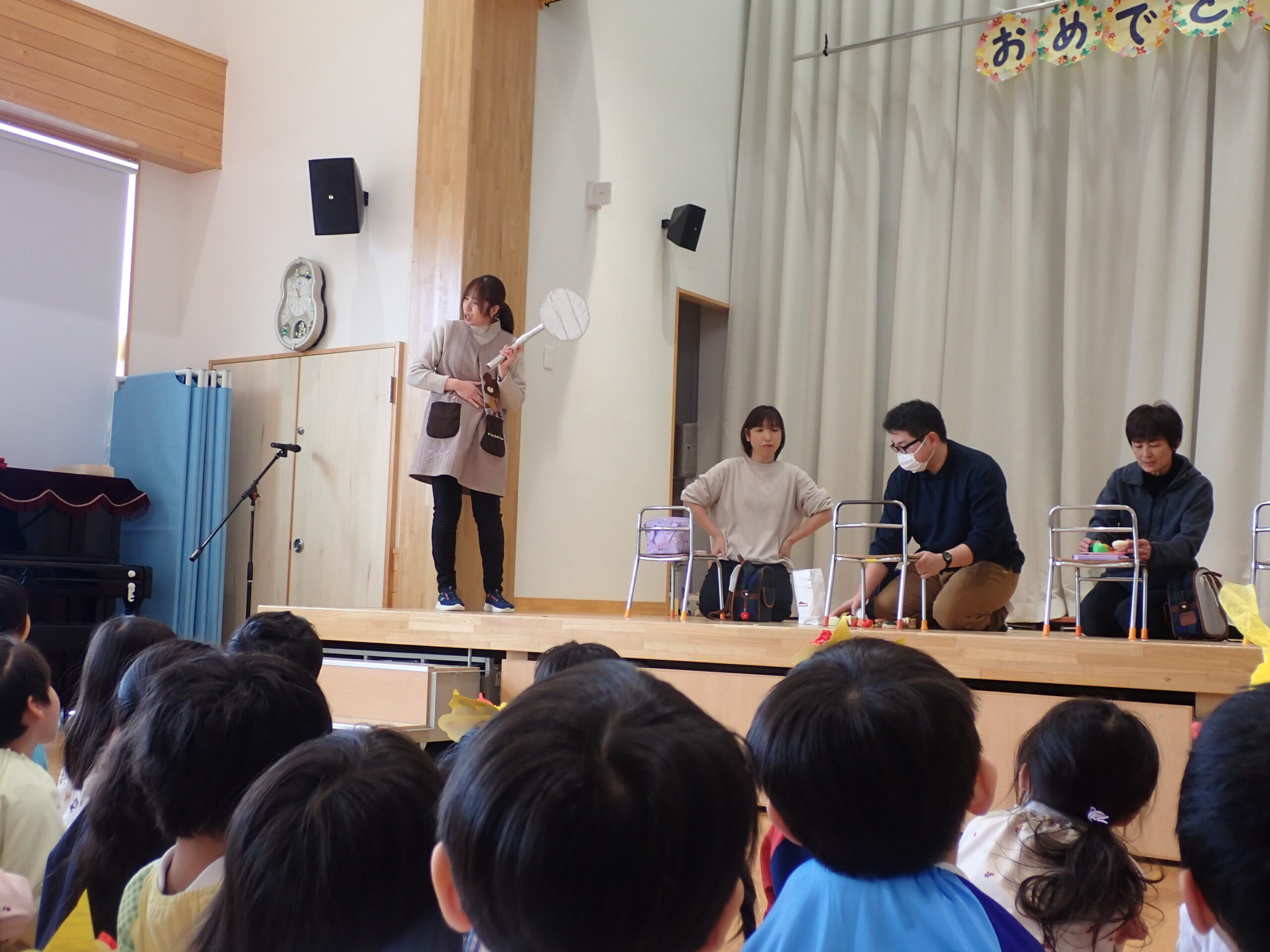 色とりどりの可愛い鬼さんたちがホールに集合し、節分の由来やどうして豆をまくのか先生からお話を聞きました。お話の後は子ども達のお楽しみ💕先生たちの劇『いろいろ鬼👹』を見ました。こども園に元気に登園したはずの子ども達でしたが、なきむしの子、おこりんぼうの子、くいしんぼうの子がいていつもと様子が違うのでお腹の中を見てみると…