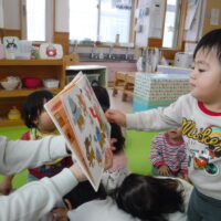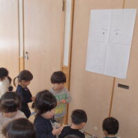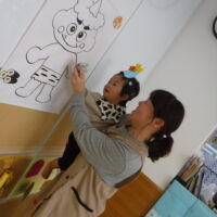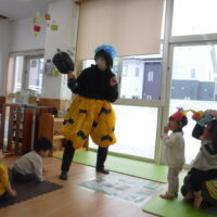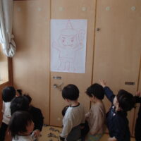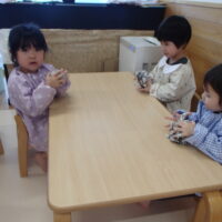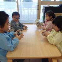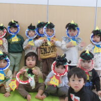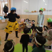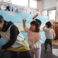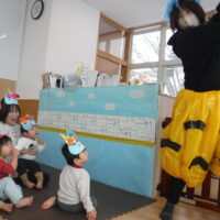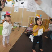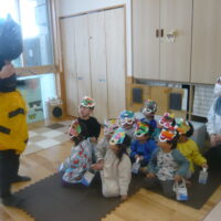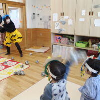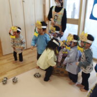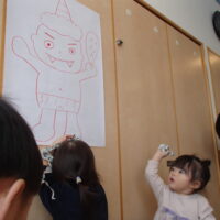 鬼が登場すると、驚いて涙する子や大きな鬼に向かって「おにはそとー!ふくはうちー!」と先生や友達と一緒に豆を投げる姿も見られました!最後には「友達と仲良く遊ぶこと」「玩具を大切にすること」など、鬼と約束をしました。