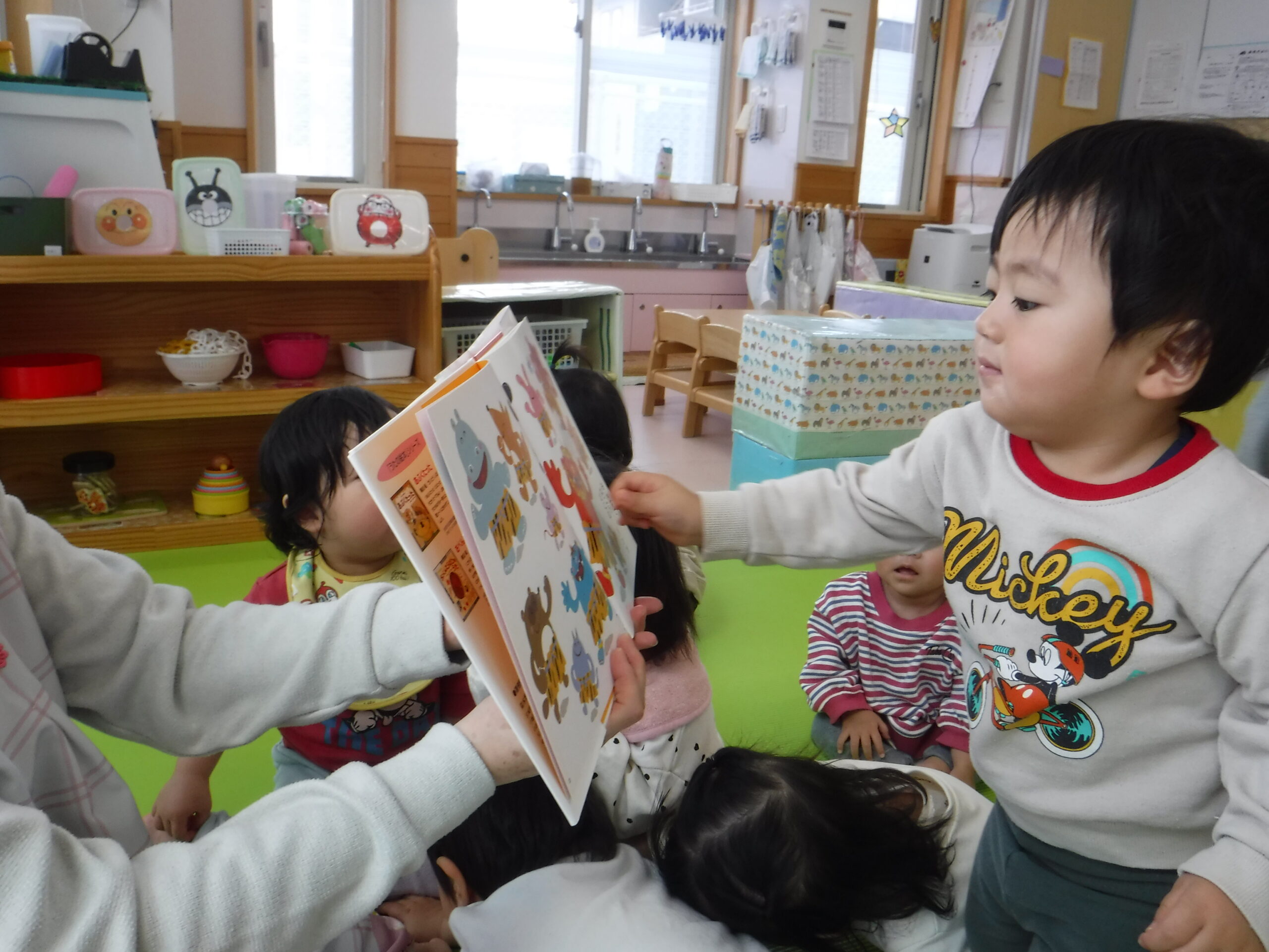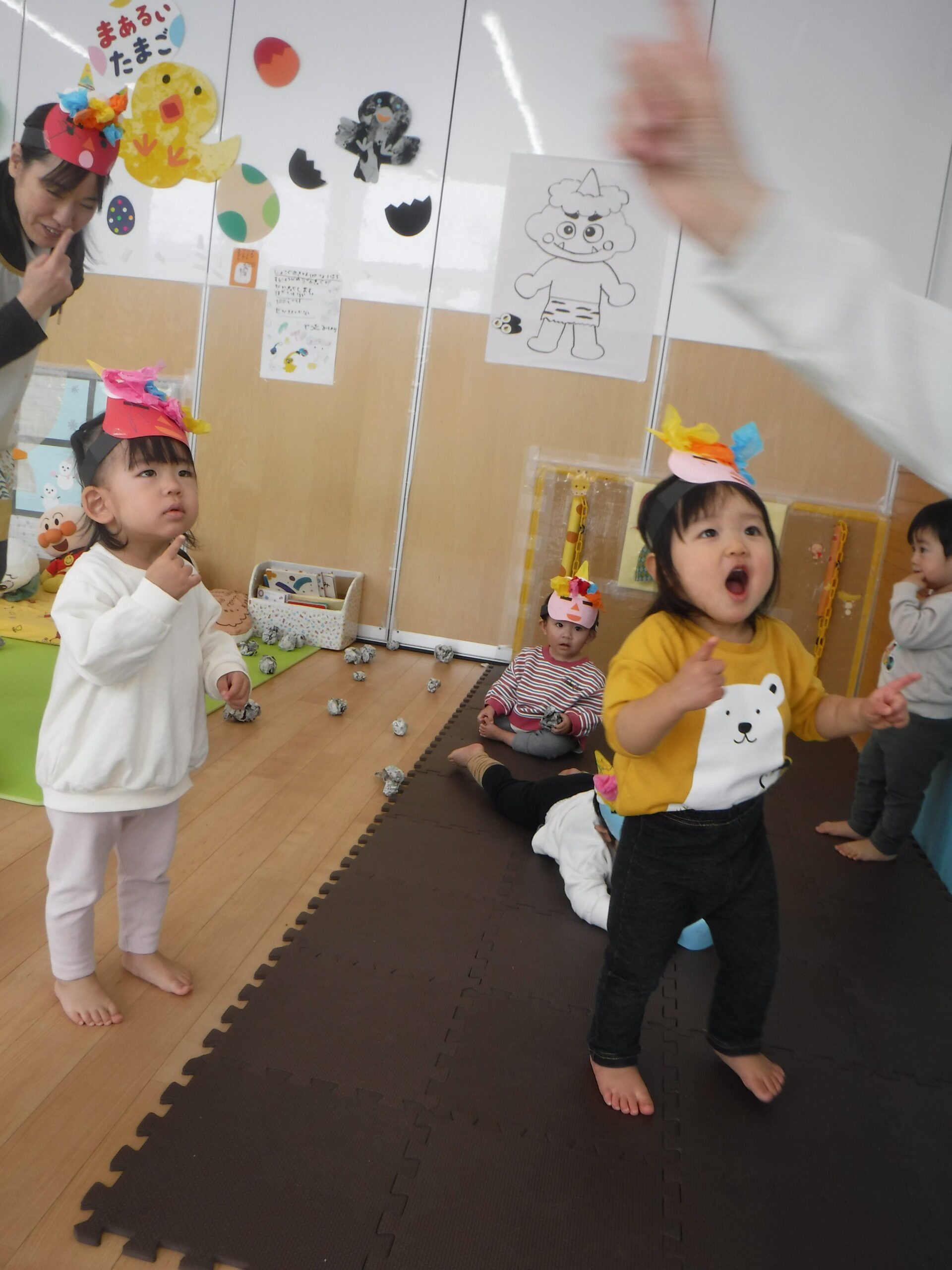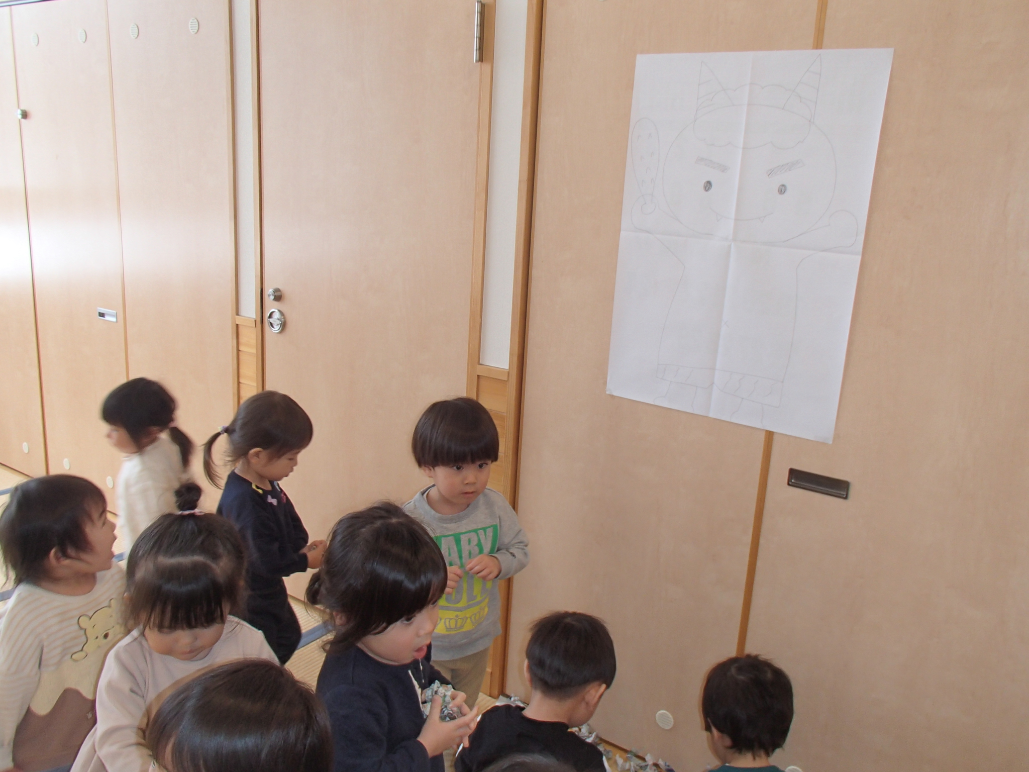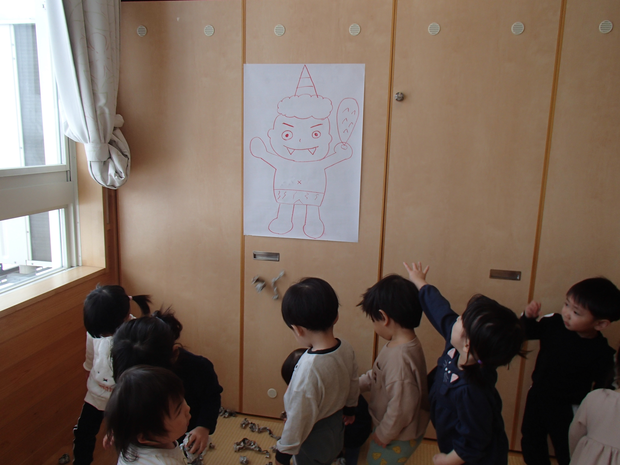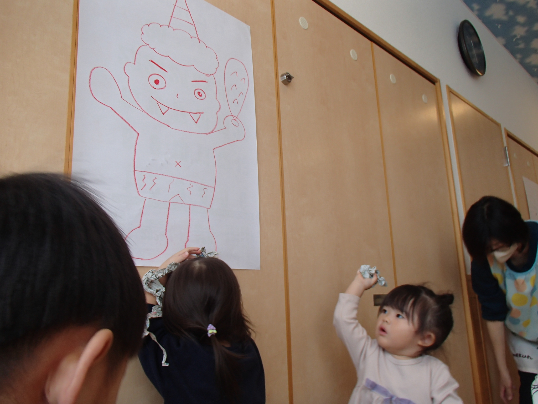鬼が登場すると、驚いて涙する子や大きな鬼に向かって「おにはそとー!ふくはうちー!」と先生や友達と一緒に豆を投げる姿も見られました!最後には「友達と仲良く遊ぶこと」「玩具を大切にすること」など、鬼と約束をしました。