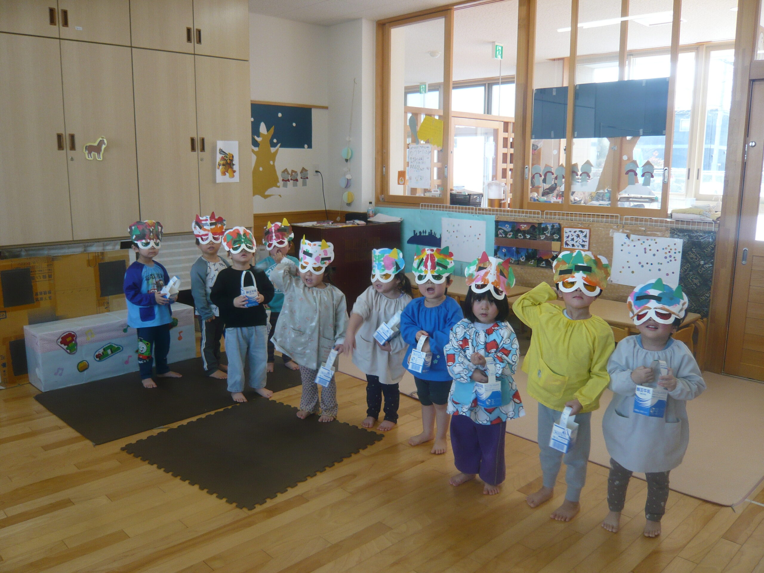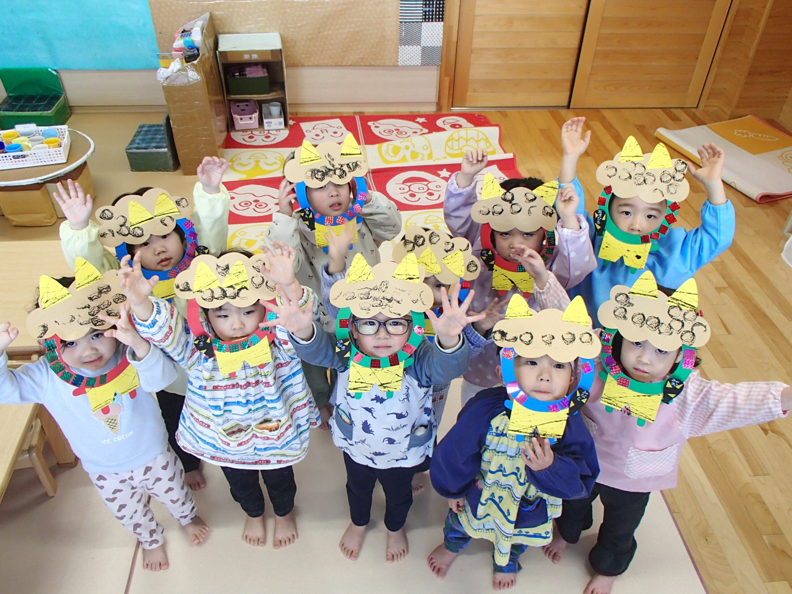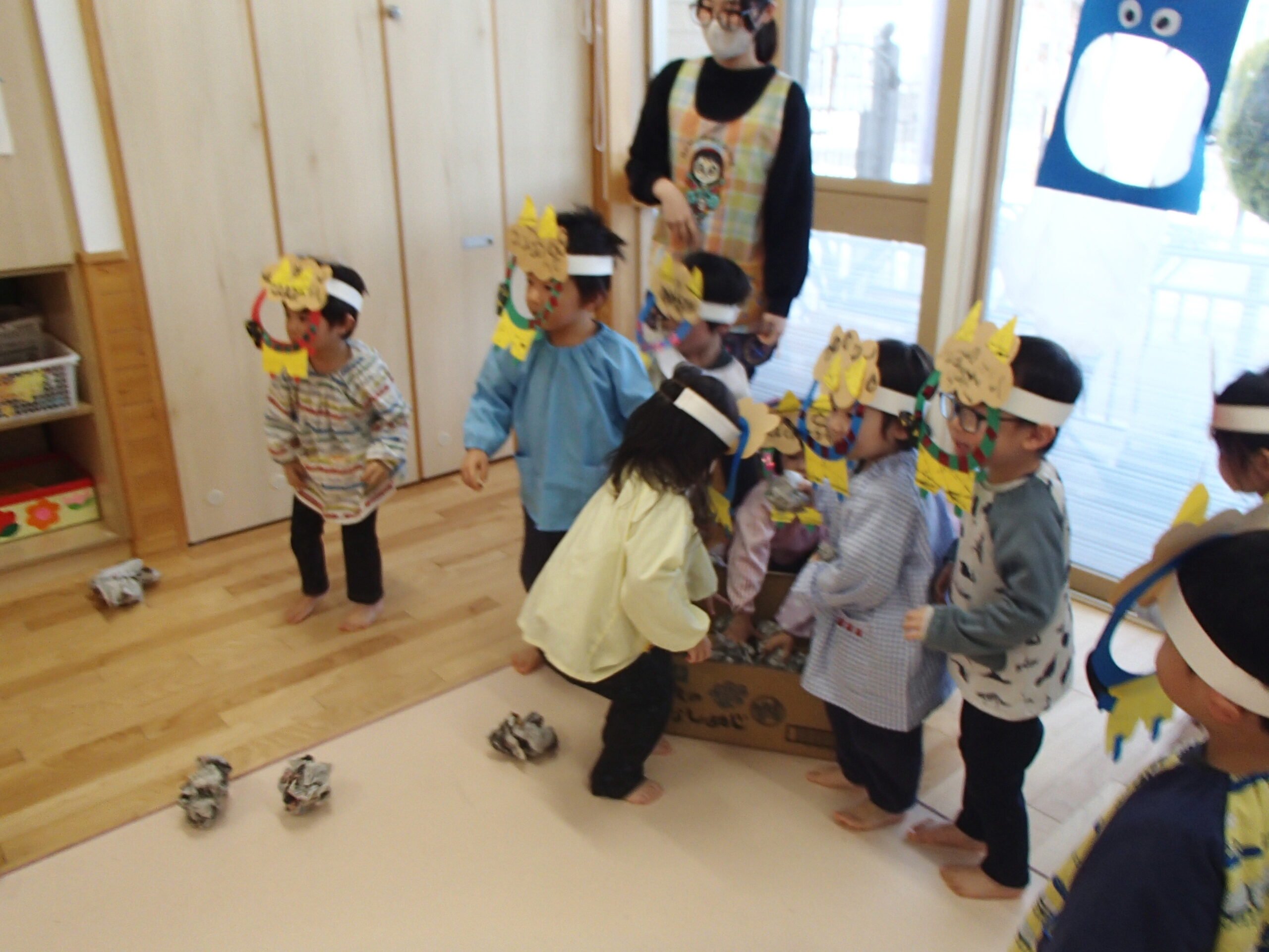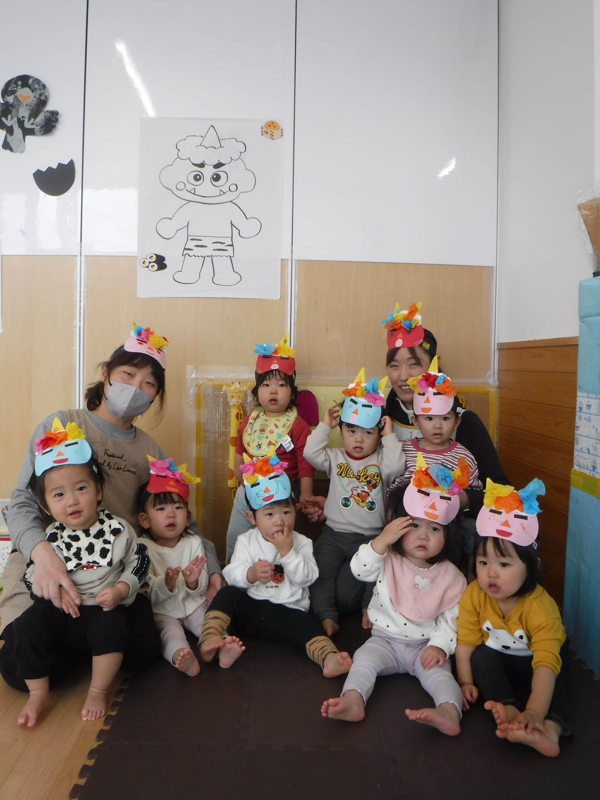 節分に向けて各クラスで鬼のお面の制作をしたり、遊びの中で「おにはそとー!ふくはうちー!」と豆まきを楽しんで過ごしていました♪