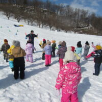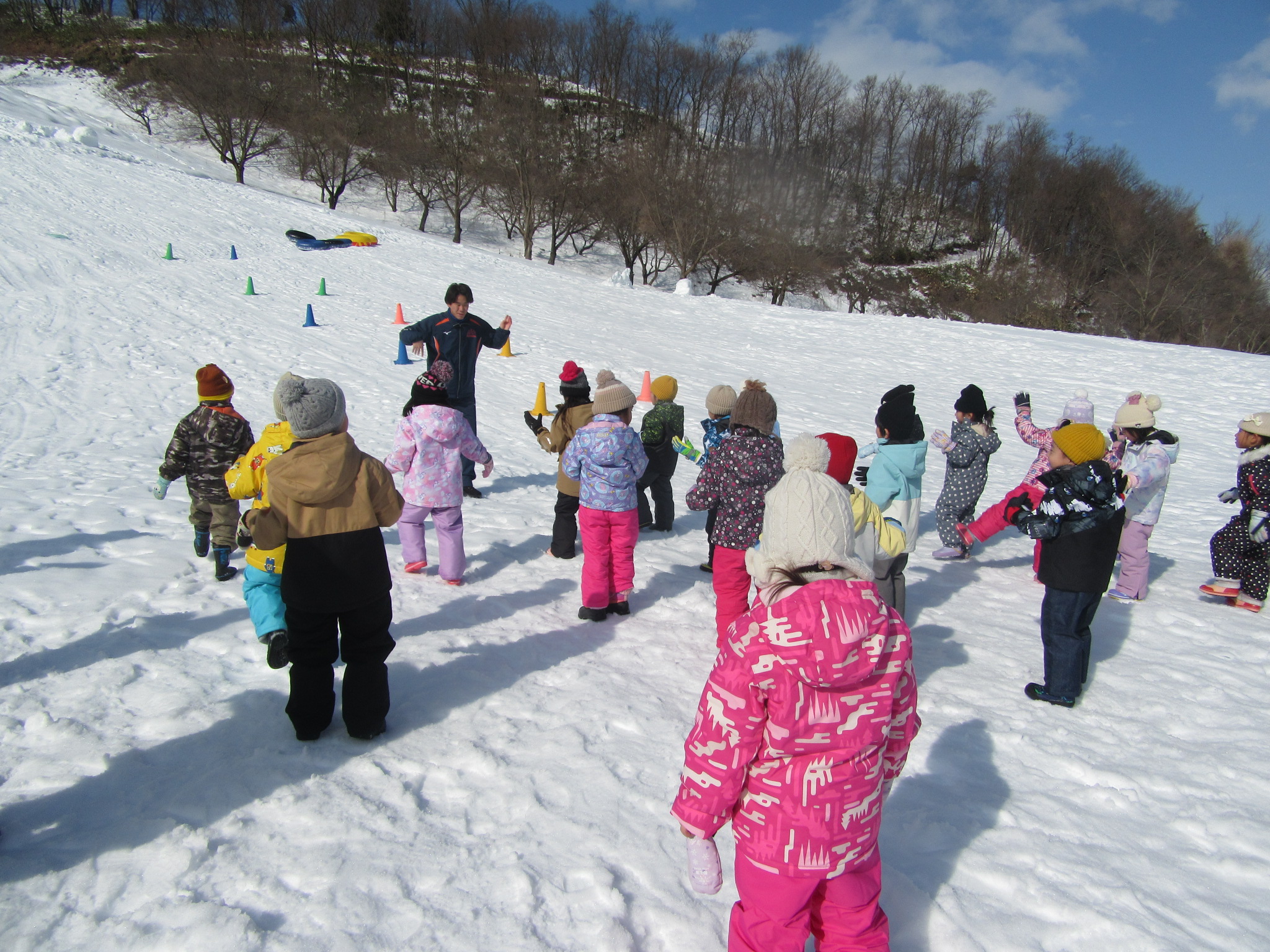 春に行った子どもの森と違い、一面真っ白の銀世界に大興奮の子ども達。坂すべりの約束を確認し、まずは、荒川先生と一緒に準備運動をしました。