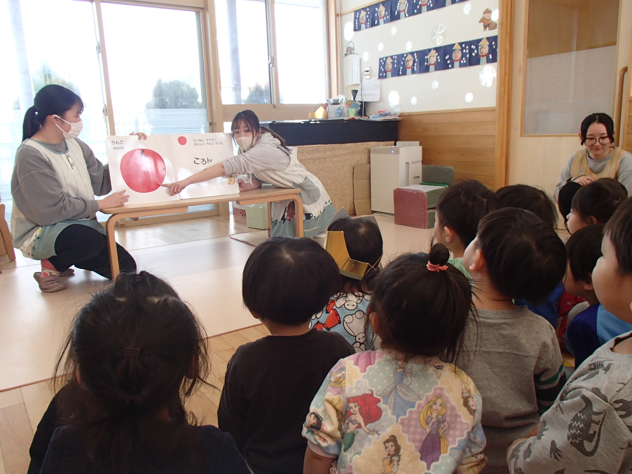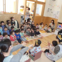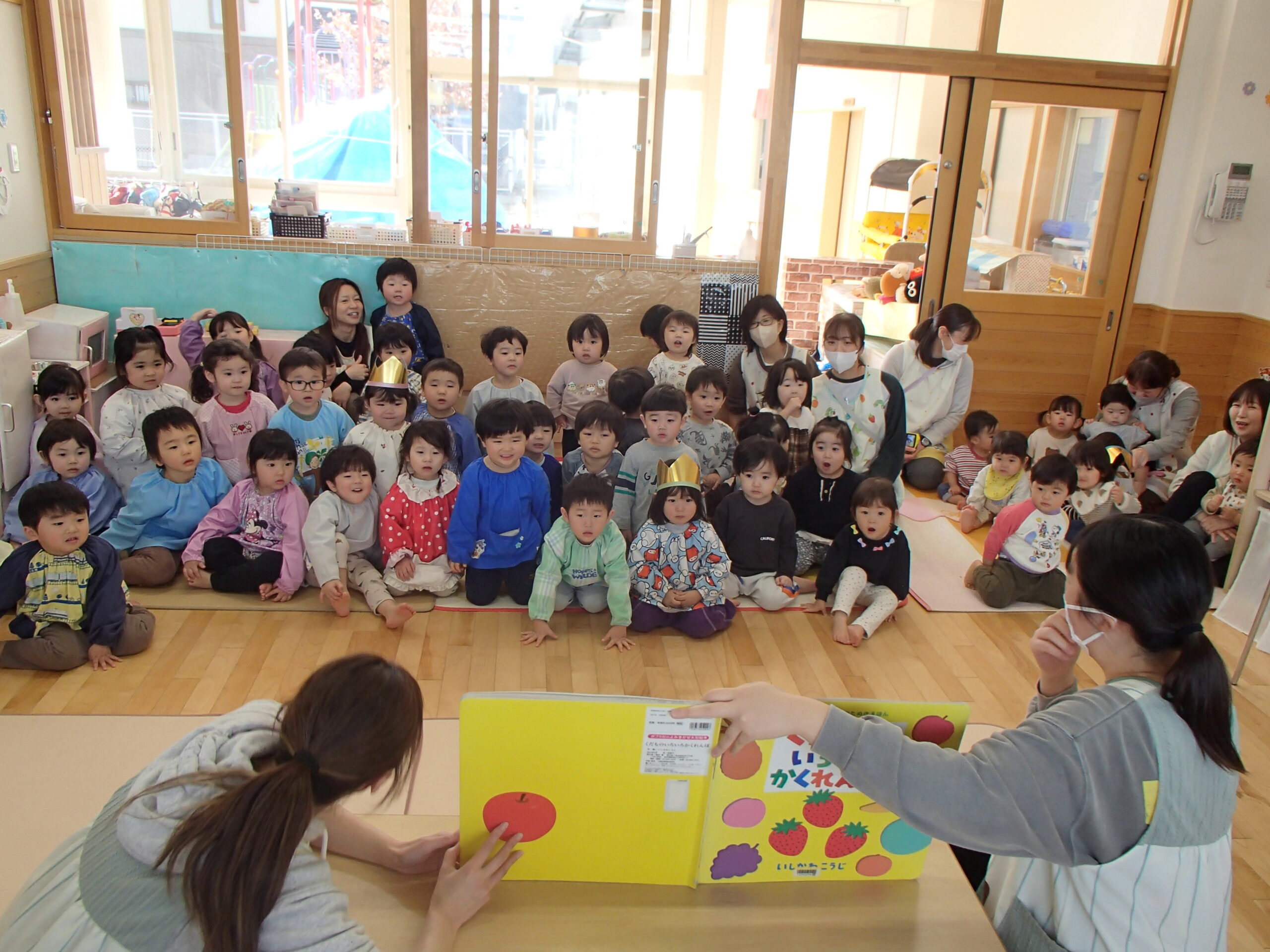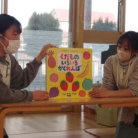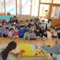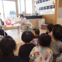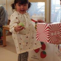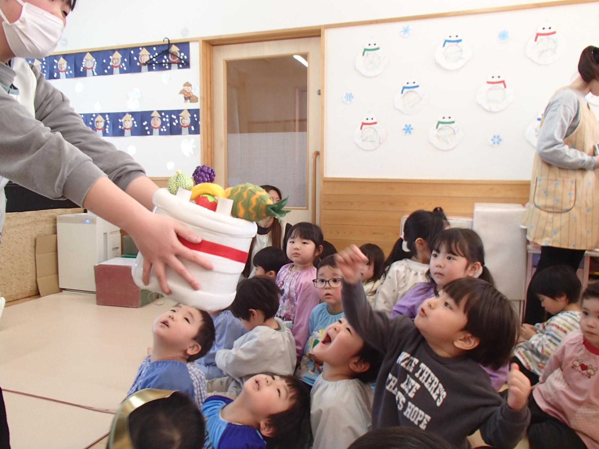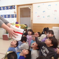 先生の出し物では、“くだものいろいろかくれんぼ”の大きな絵本を読みました。「何がでてくるかな?」と聞かれると「りんご!」「ばなな!」と元気な声が沢山聞こえてきました!さらにミステリーボックスが出てきて、さまざまな食べ物が登場!何が出てくるのかワクワクしながら見守る子ども達の目はキラキラ輝いていました。
