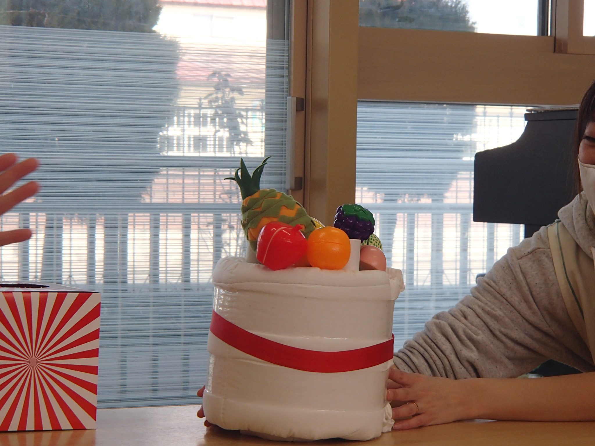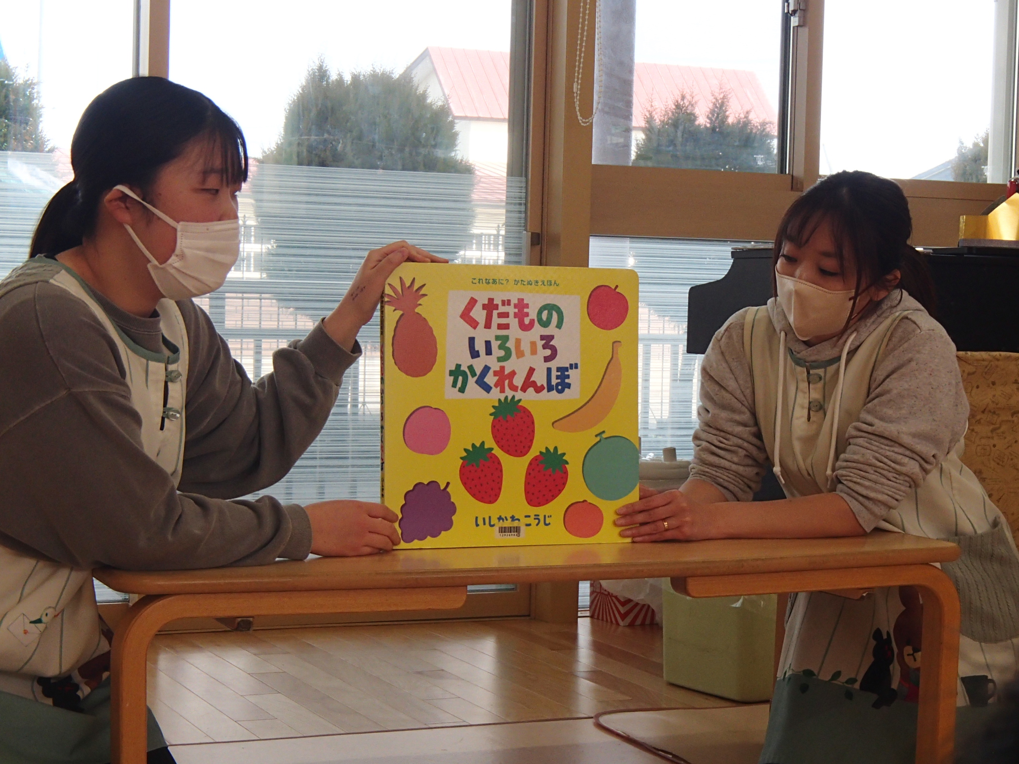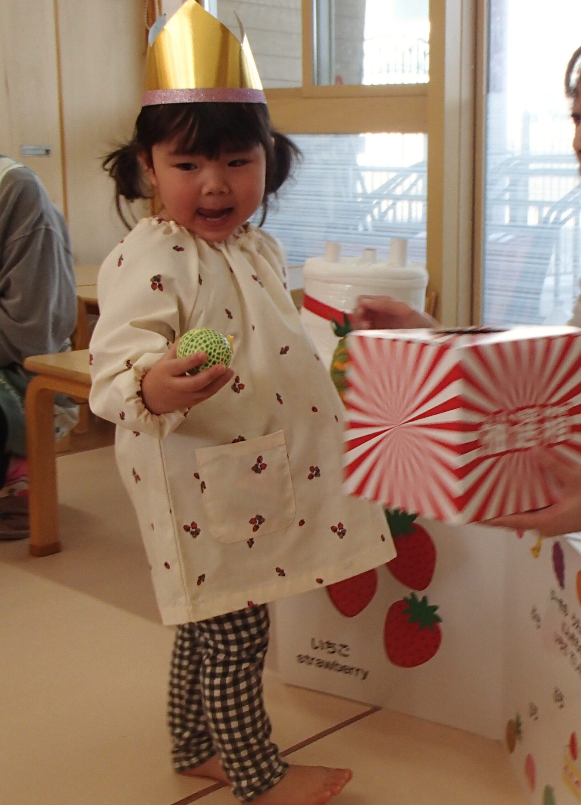 先生の出し物では、“くだものいろいろかくれんぼ”の大きな絵本を読みました。「何がでてくるかな?」と聞かれると「りんご!」「ばなな!」と元気な声が沢山聞こえてきました!さらにミステリーボックスが出てきて、さまざまな食べ物が登場!何が出てくるのかワクワクしながら見守る子ども達の目はキラキラ輝いていました。