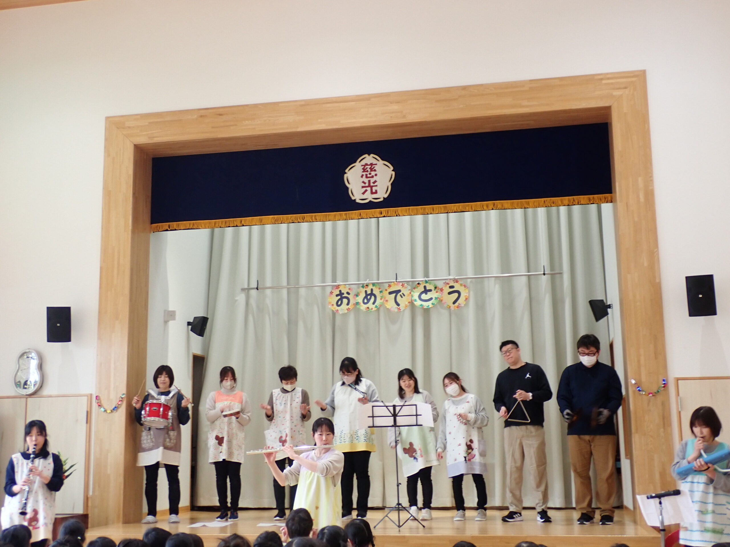 子ども達が知っている小太鼓・カスタネット・すず・ピアニカ・タンバリン・シンバルの楽器のほかにフルートやクラリネットも登場しました🌟