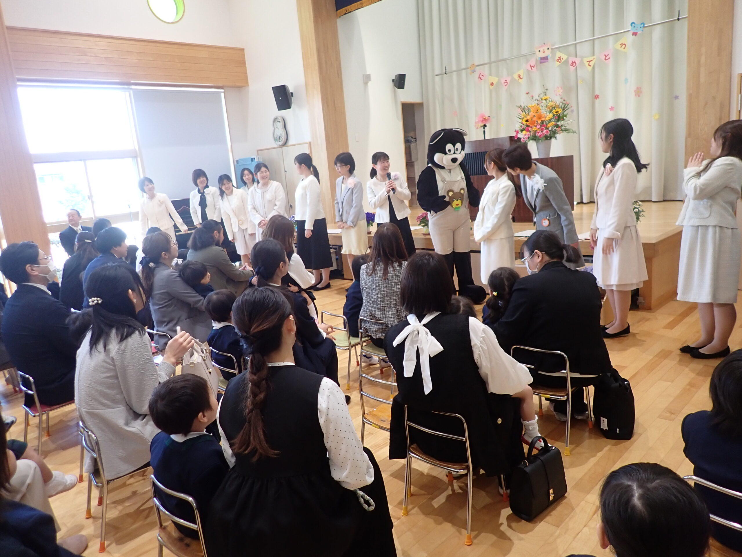 入園式では、くまの“くーちゃん”が遊びに来てくれました♪くーちゃんと一緒に「むすんでひらいて」のお歌をうたい、笑顔が溢れていましたね。