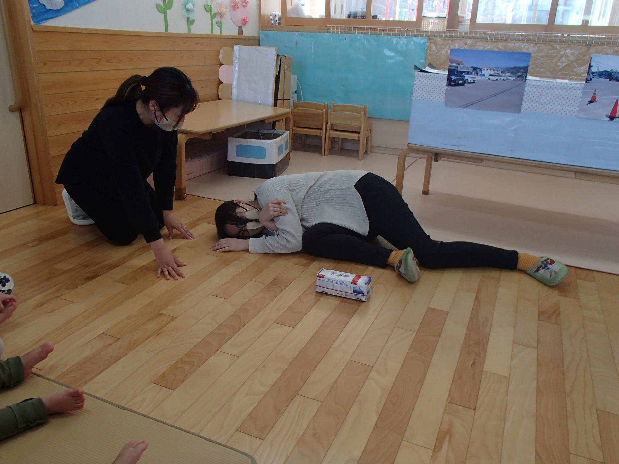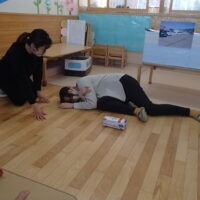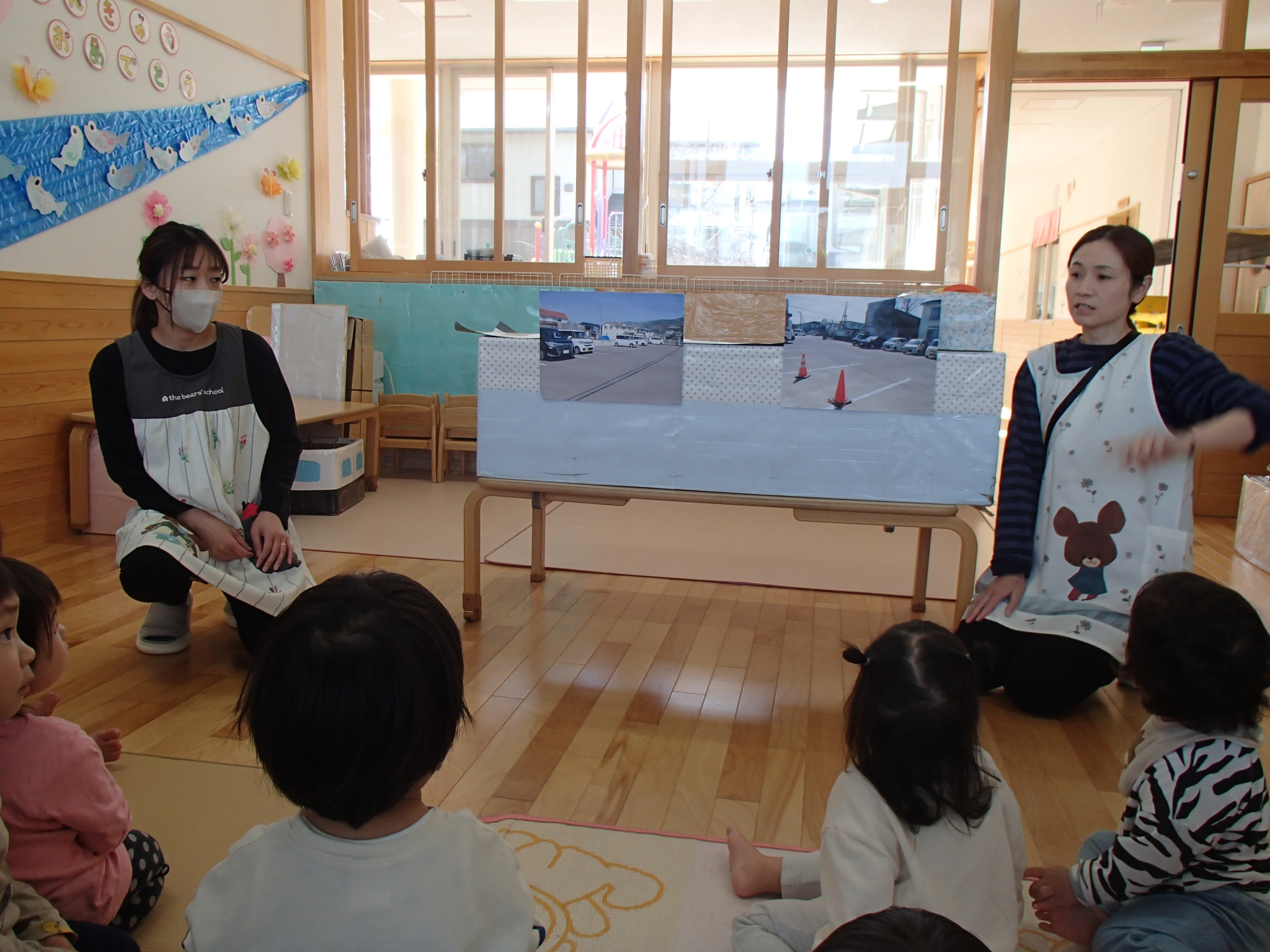 駐車場では、車から降りたらお家の人と手をつないで歩くこと、手を挙げて横断歩道を渡ること、みんなでお散歩に行く際の、誘導ロープの握り方などのお約束をしました。