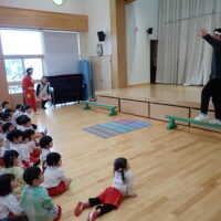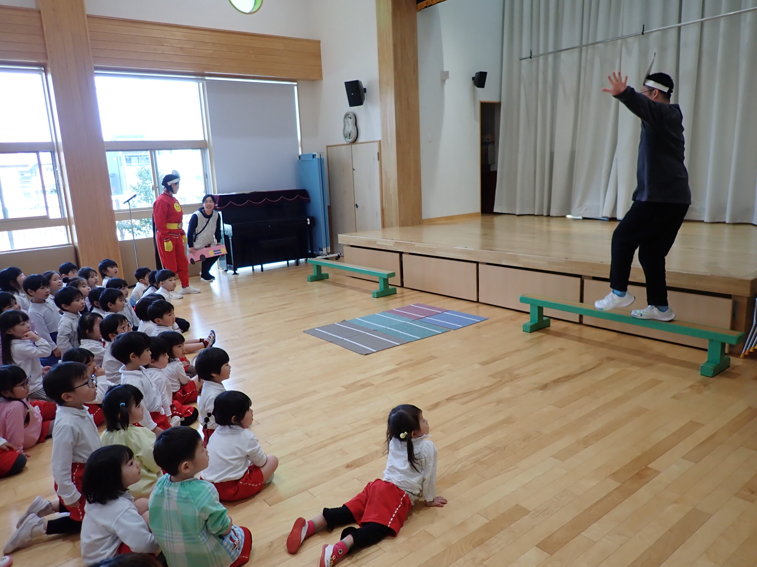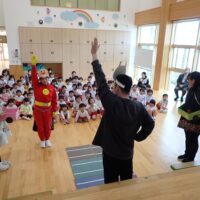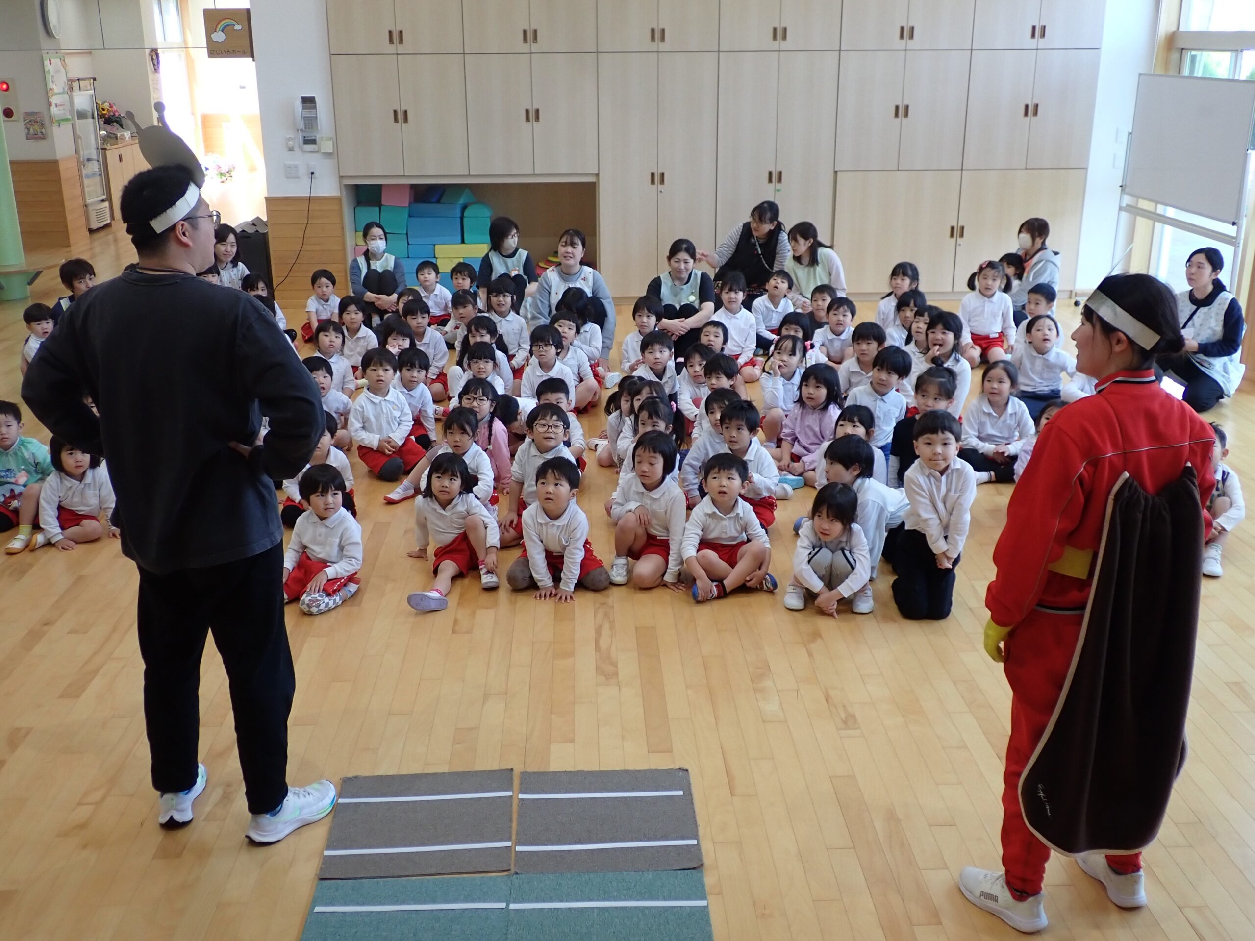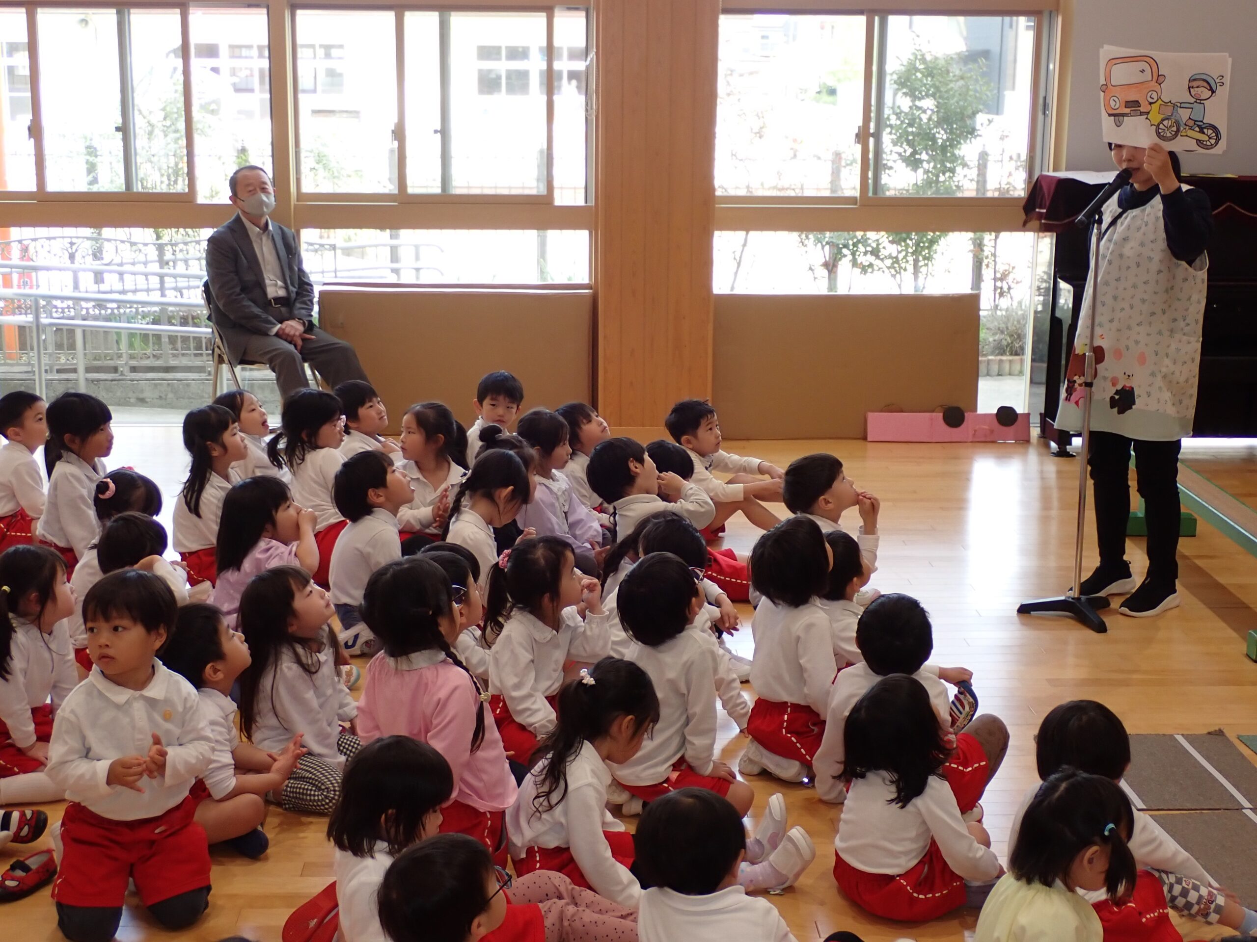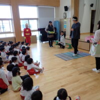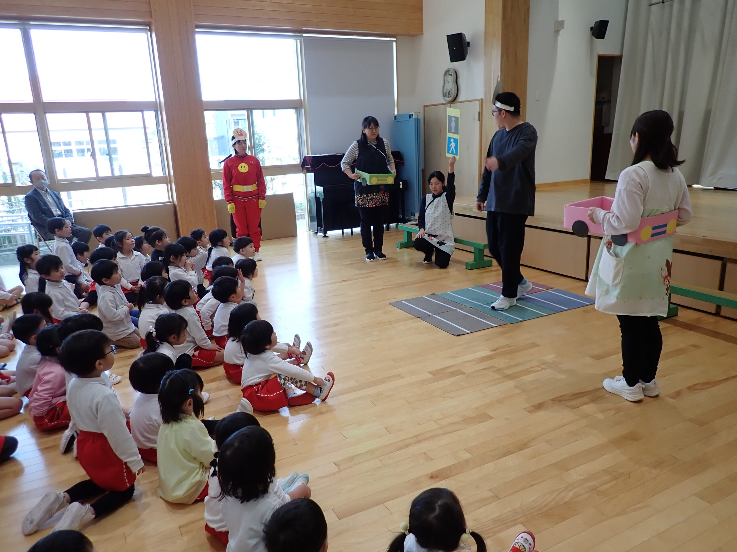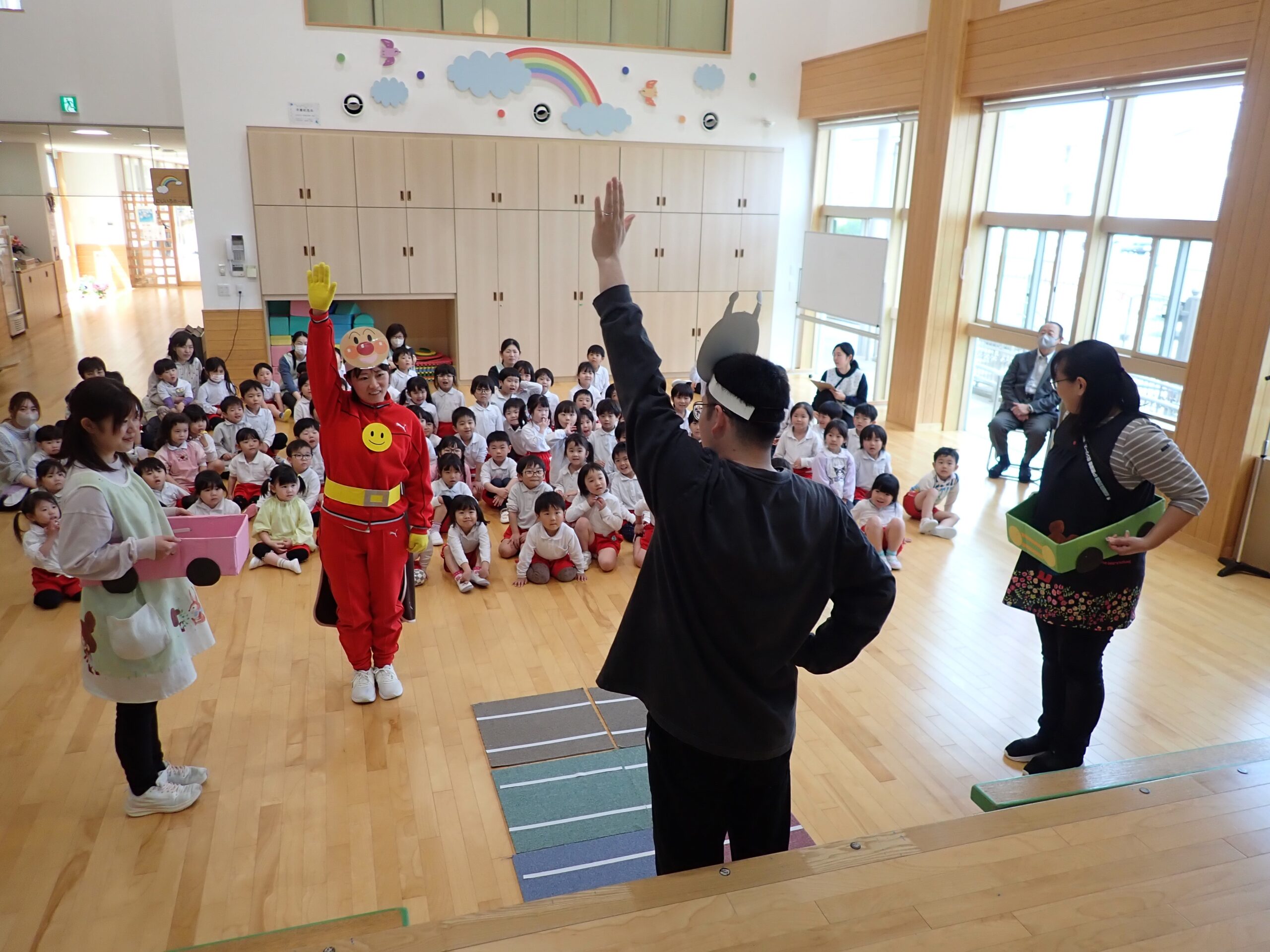 本日、交通安全教室を行いました。今日もアンパンマンとバイキンマンと一緒にみんなで交通ルールのお勉強をしました。