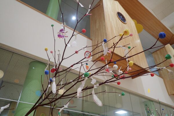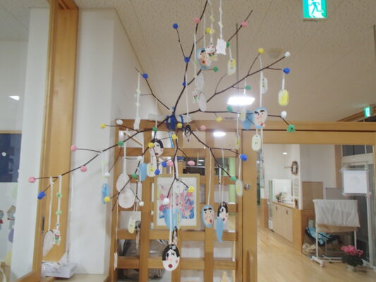 今年一年 みんなが元気に笑顔で過ごせるよう願いをこめながら 団子や食べ物、鯛、だるま、小判などの飾りを作り、ミズキの木に飾りました☺️ いろとりどりのみずきの木に「うわ~!きれい✨」 こども園が華やかな雰囲気になりました…