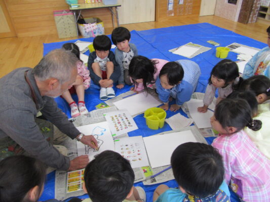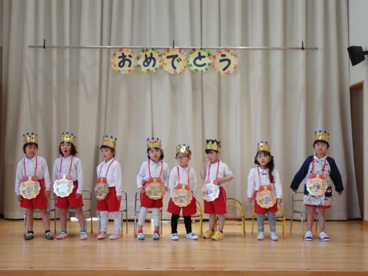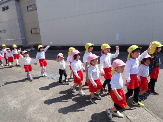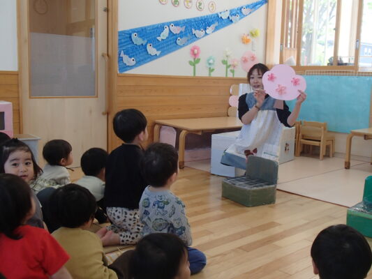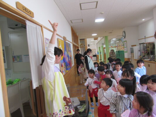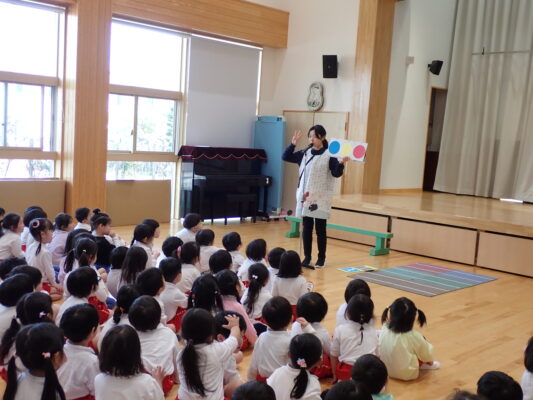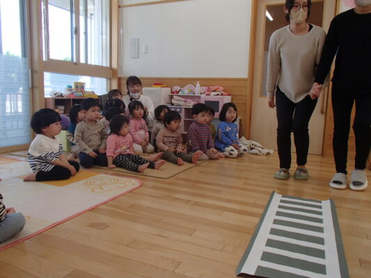 新年度、初めて保育部の子ども達でお集まりをしました。 先生たちによる、楽しい劇のはじまりです! 駐車場では、車から降りたらお家の人と手をつないで歩くこと、手を挙げて横断歩道を渡ること、みんなでお散歩に行く際の、誘導ロープ…