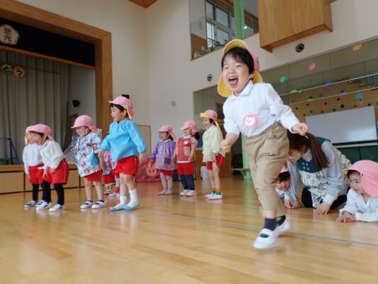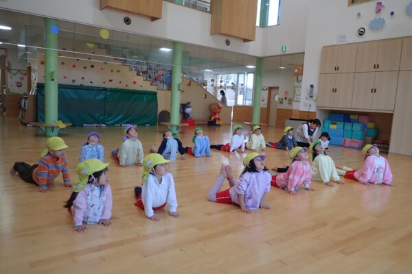 今日は、年長さんになって初めての運動遊び! とても楽しみにしていた子ども達は元気なかけ声をホールに響かせながら運動をしました。 丁寧に準備運動をした後…